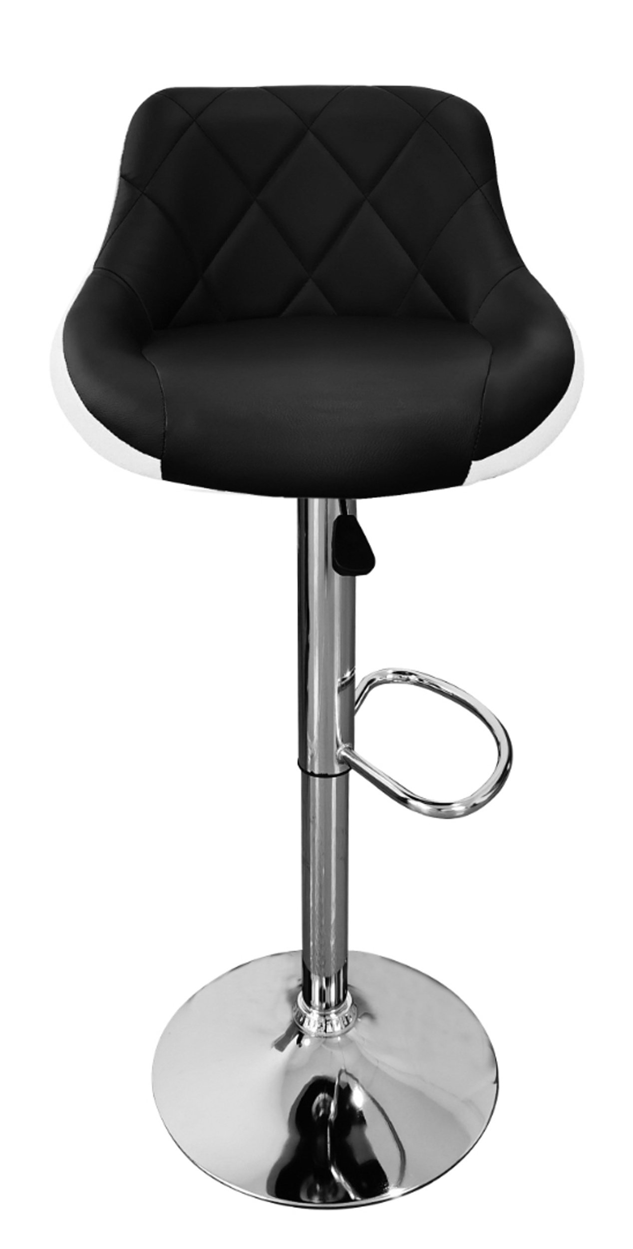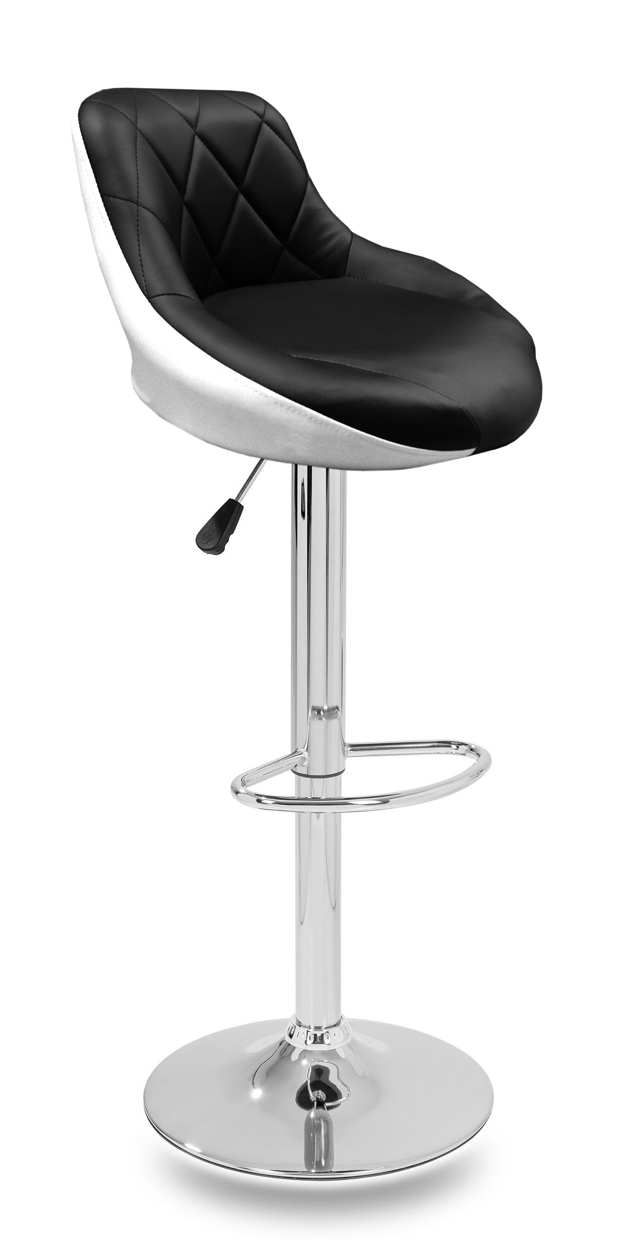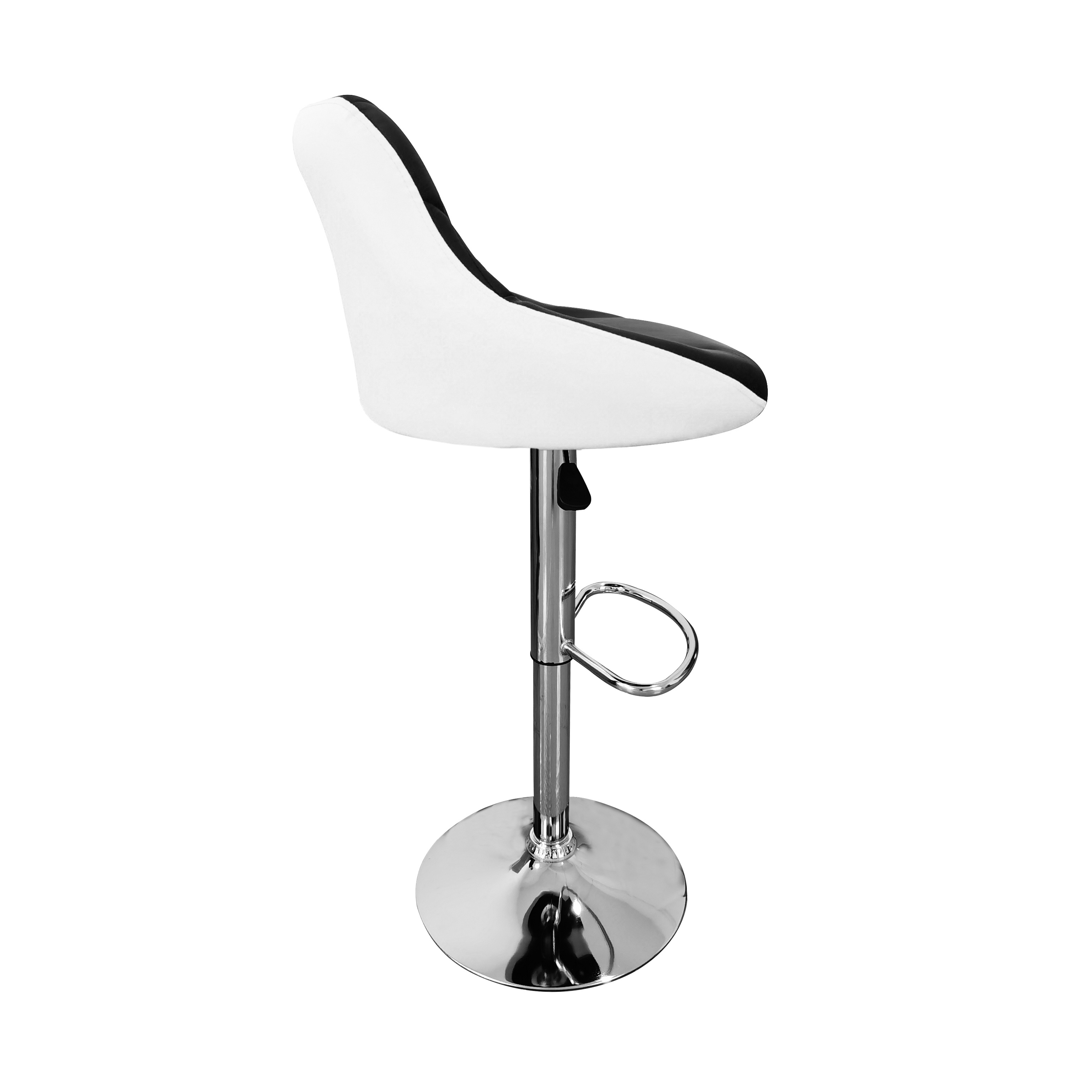 Scaunul are un suport practic pentru picioare din metal cromat. Baza circulară și piciorul central sunt din crom lucios.
