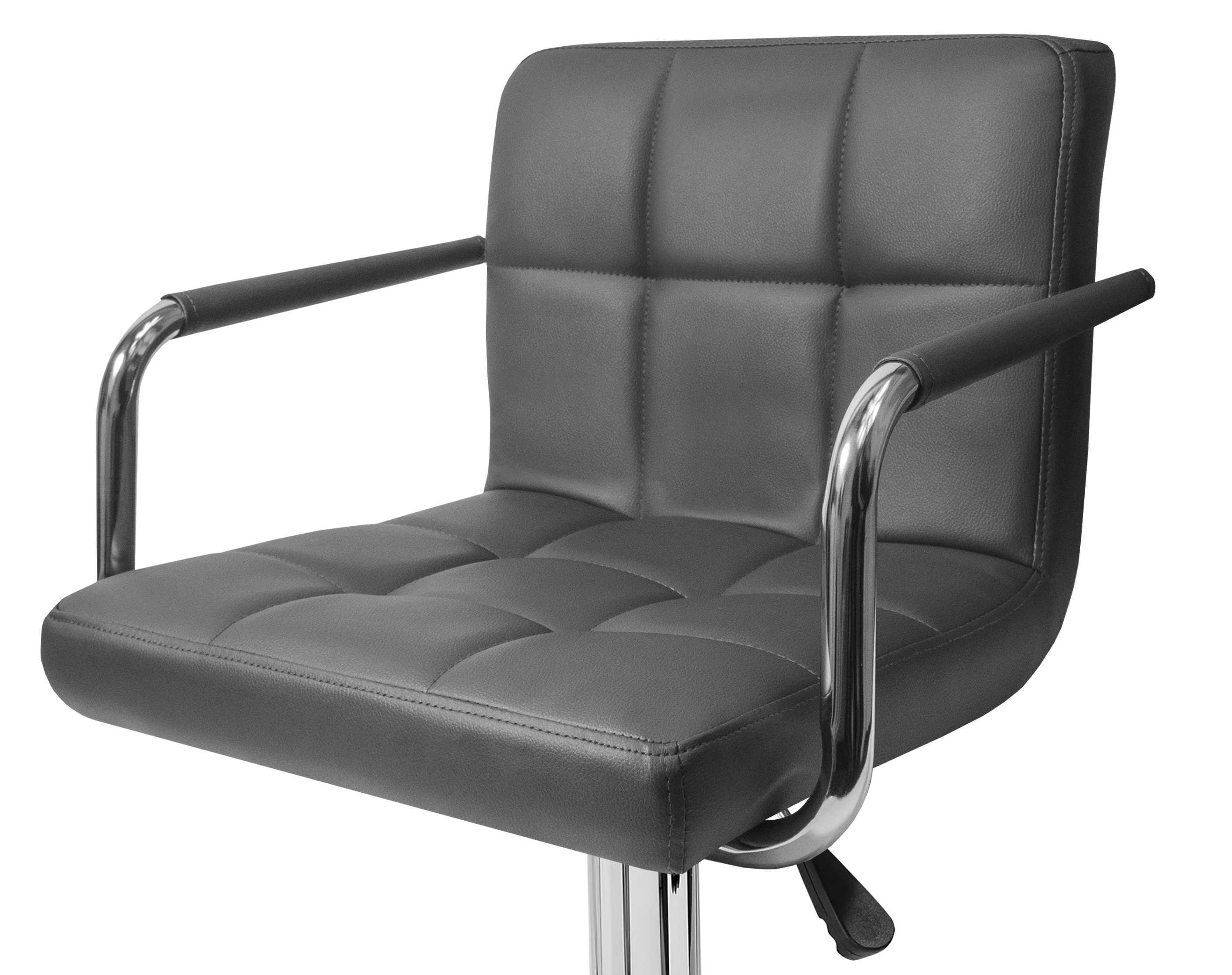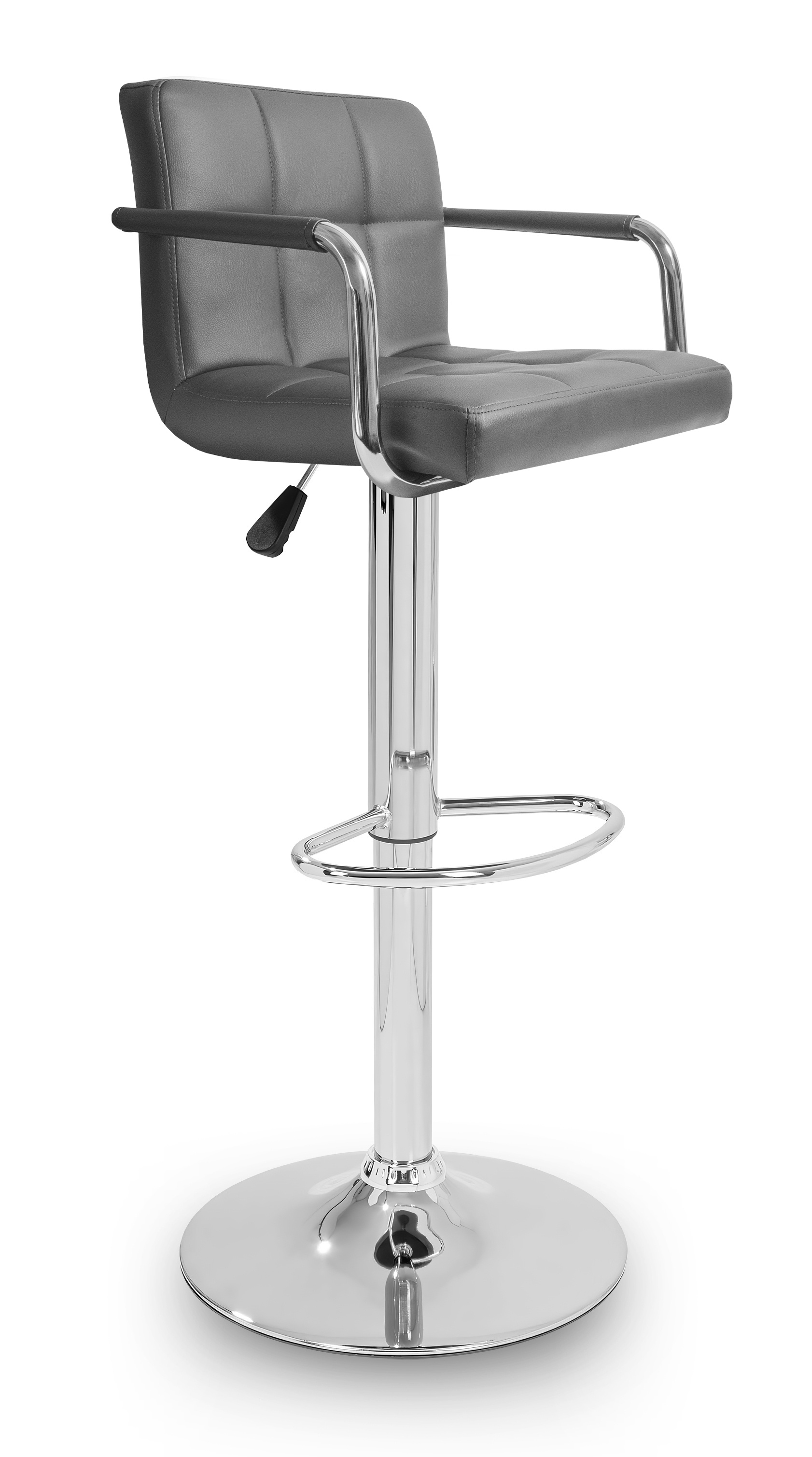 Scaunul are un suport practic pentru picioare din metal cromat. Baza circulară și piciorul central sunt din crom lucios.