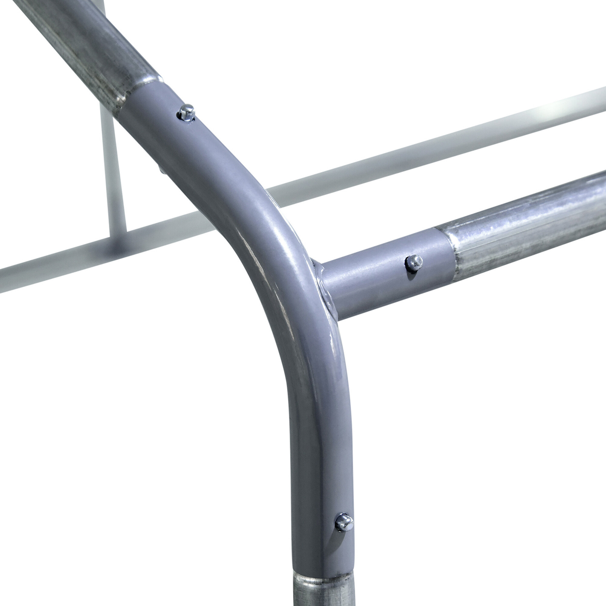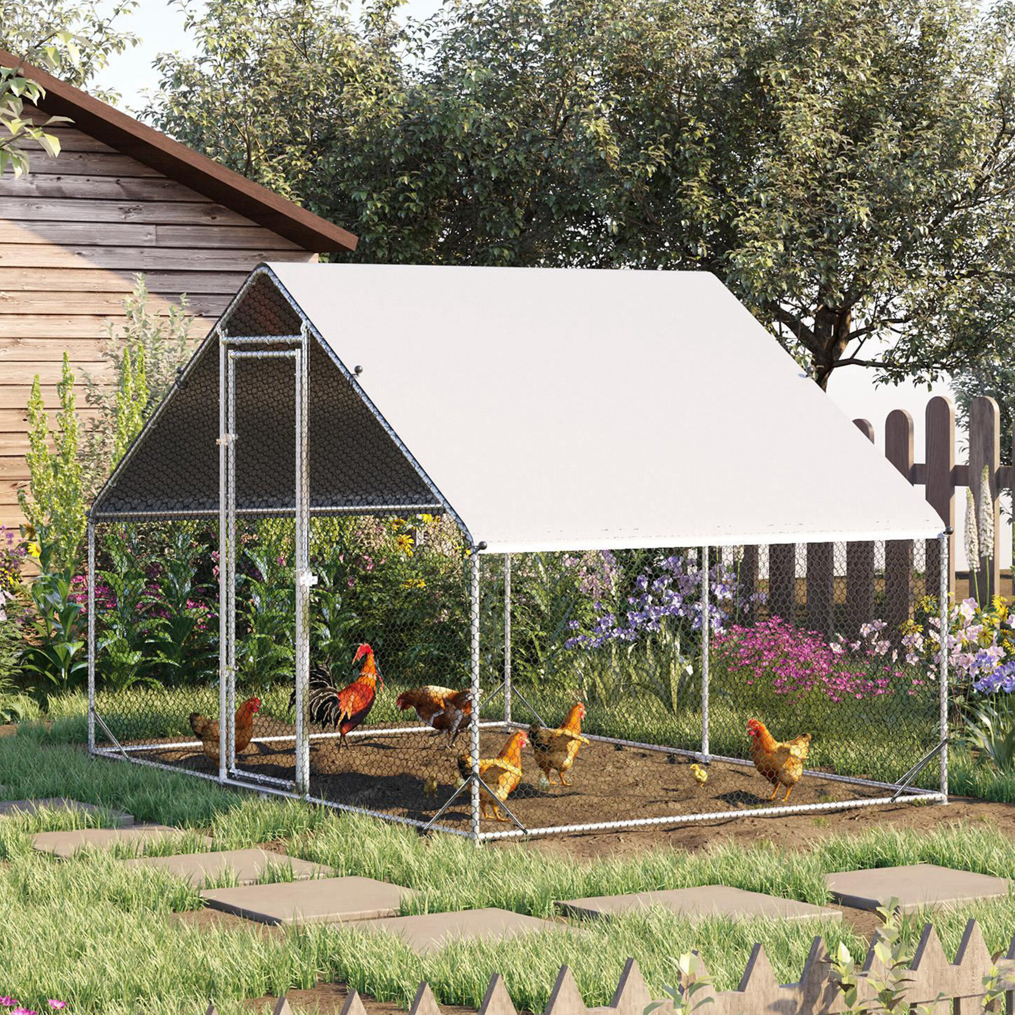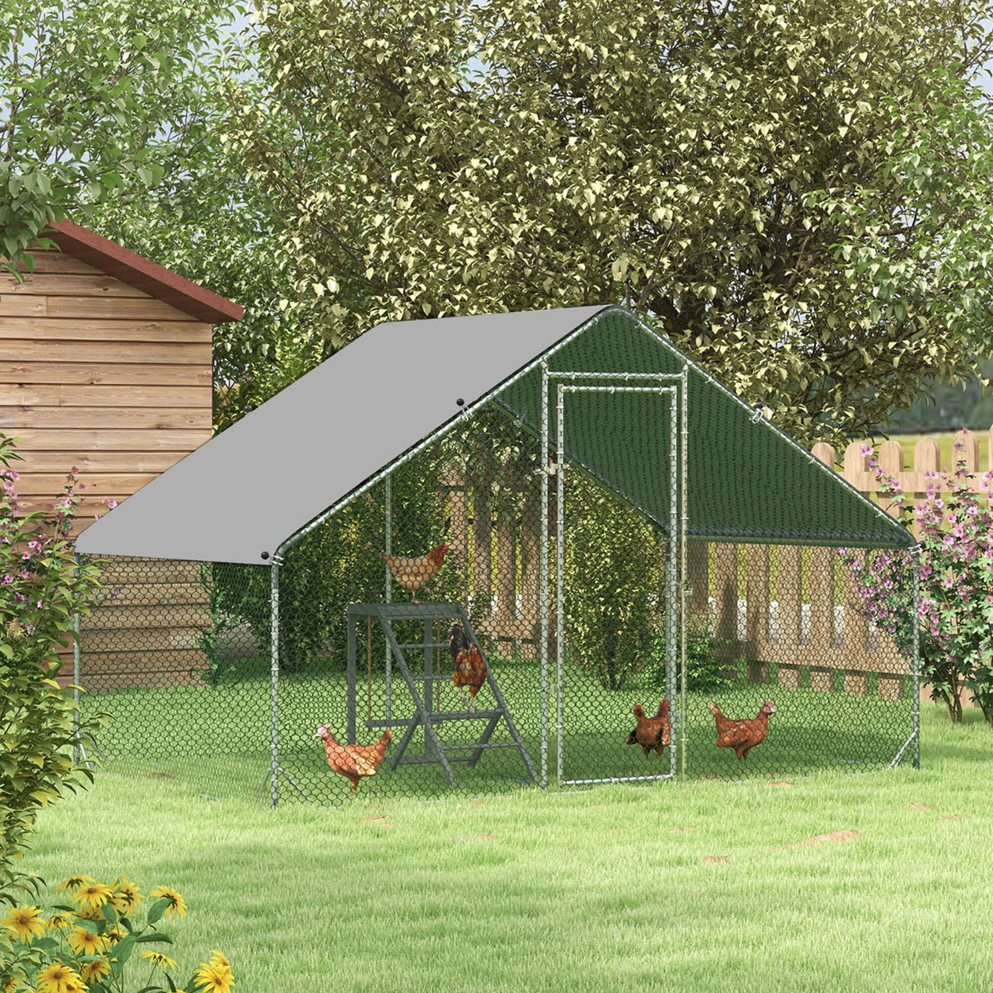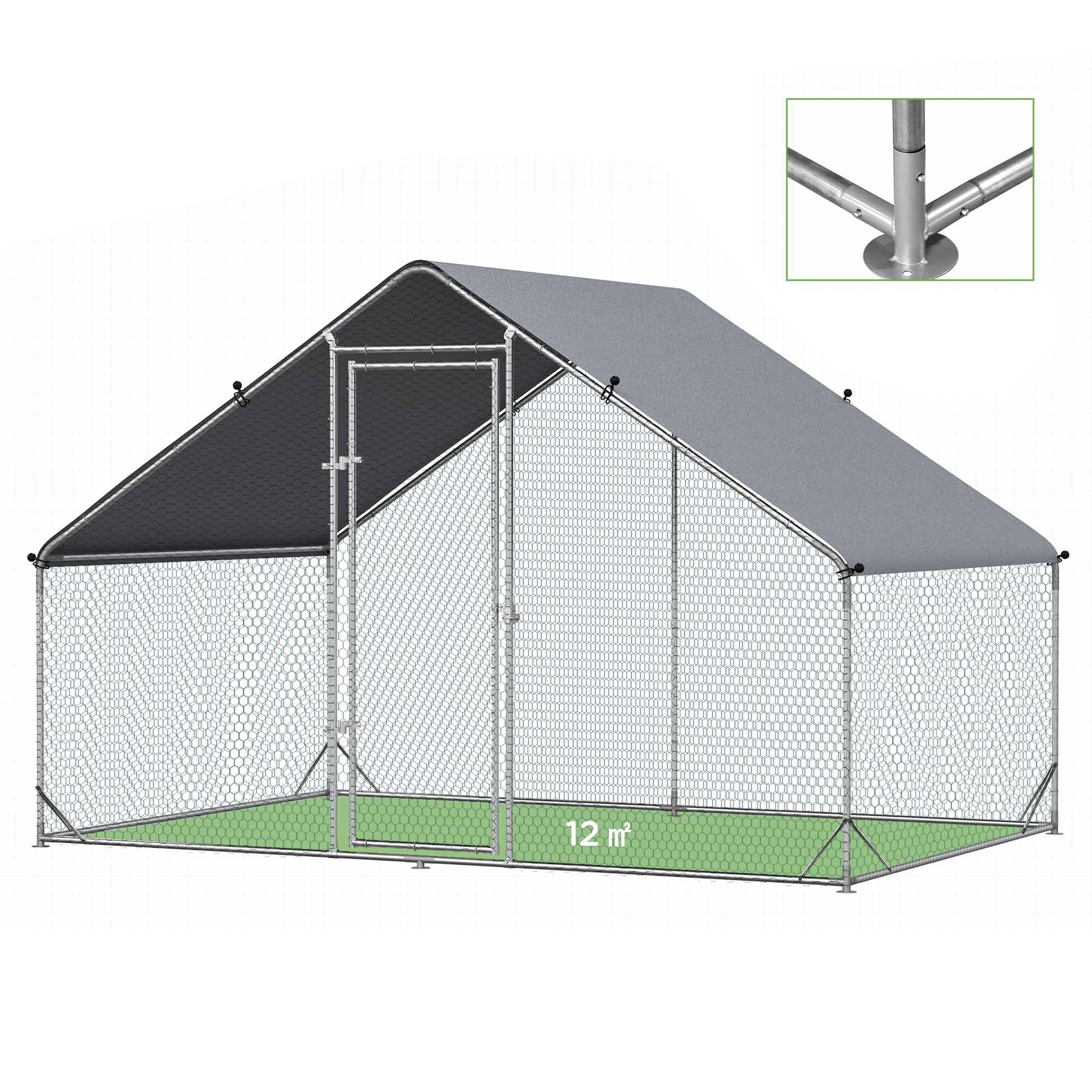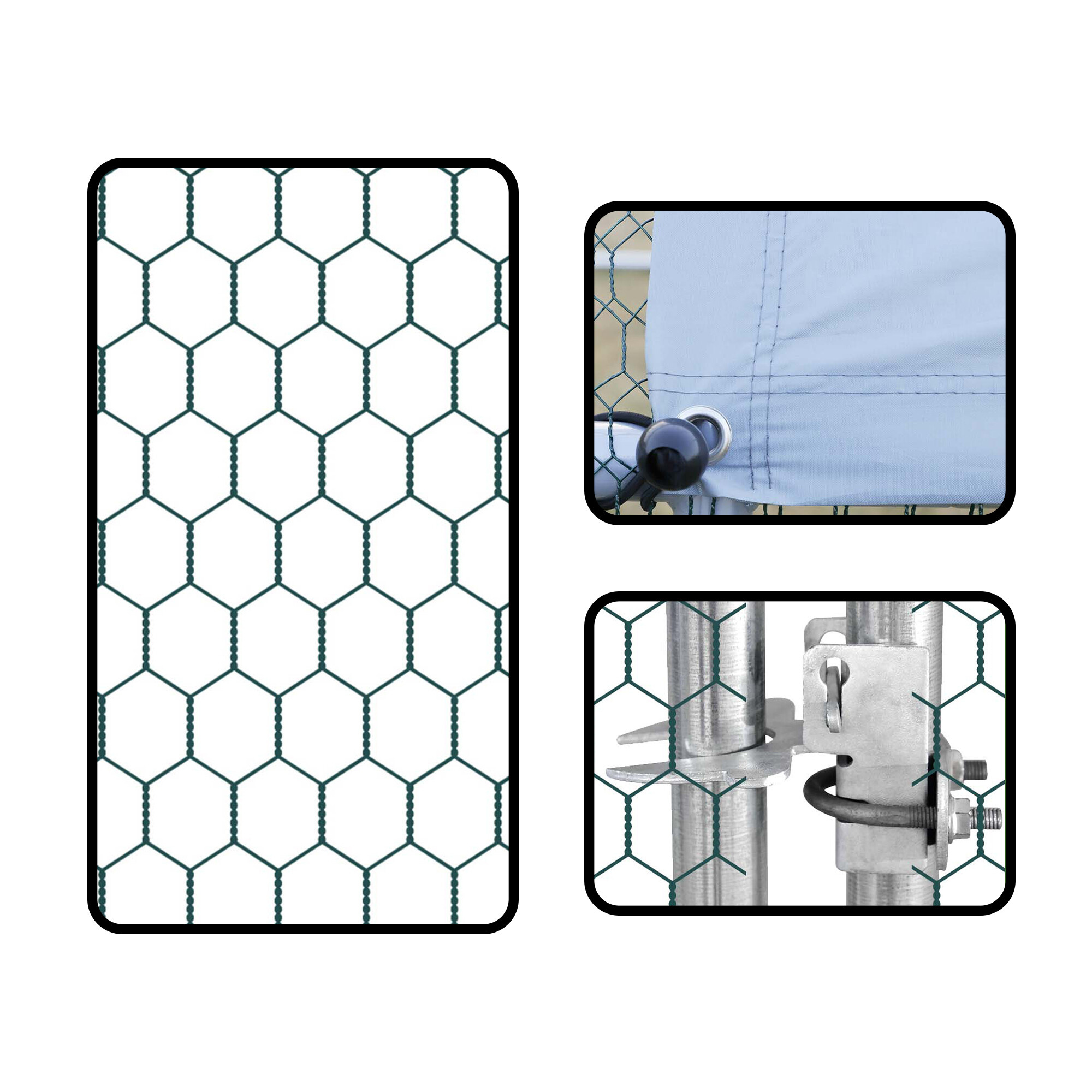 Cusca este fabricată din oțel galvanizat argintiu solid, care oferă stabilitate corespunzătoare țarcului și previne accidentele nedorite, cum ar fi evadările păsărilor dumneavoastră de curte. Construcția este completată cu plasă galvanizată de culoare verde și un acoperiș format dintr-o prelată gri din PVC.