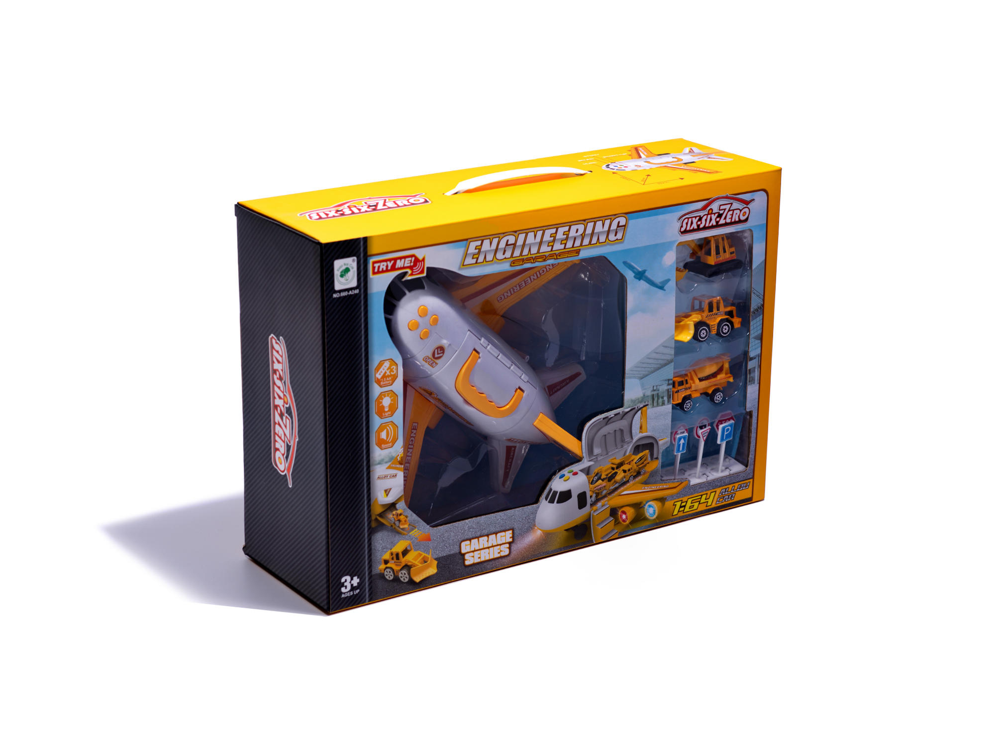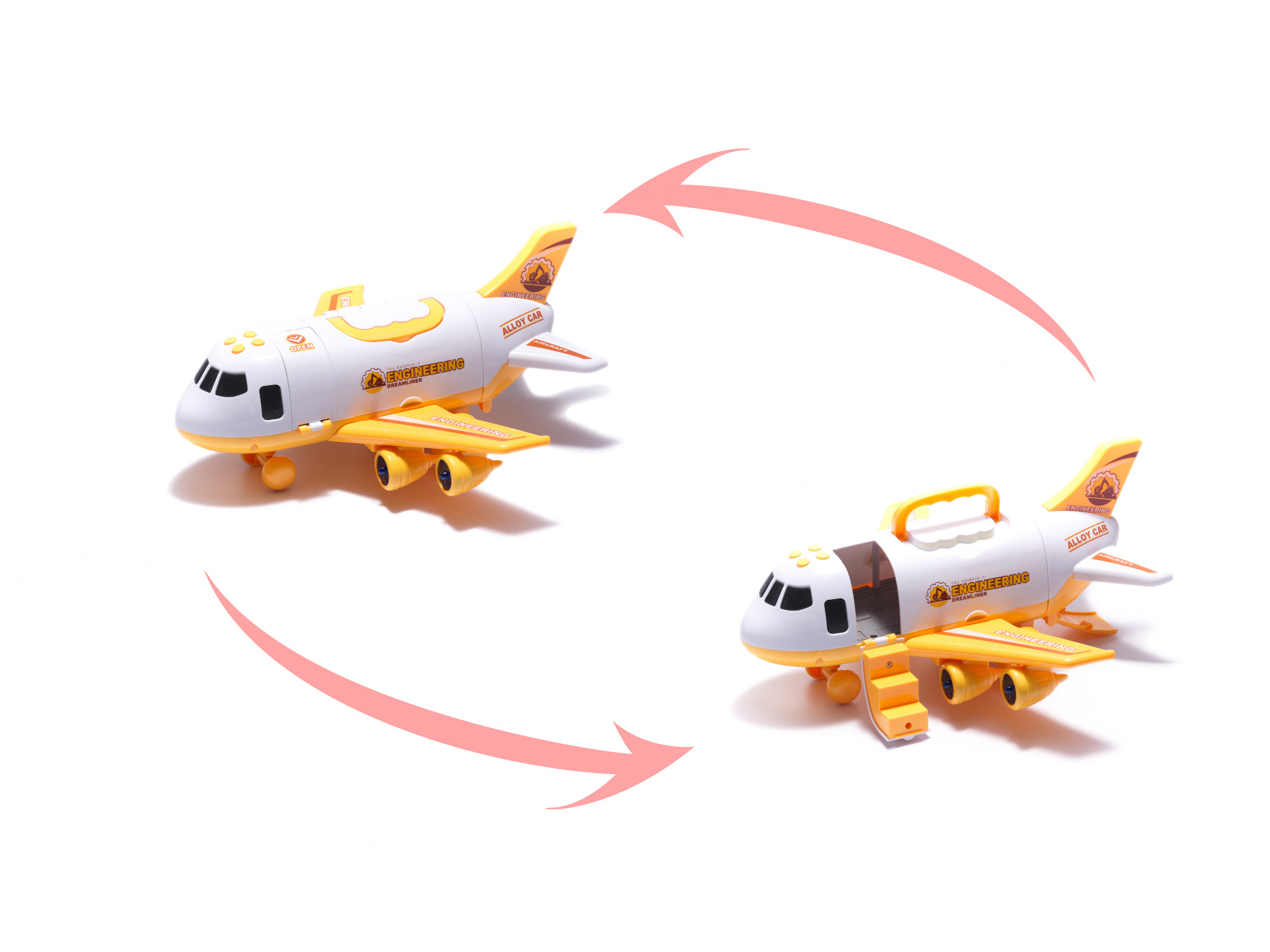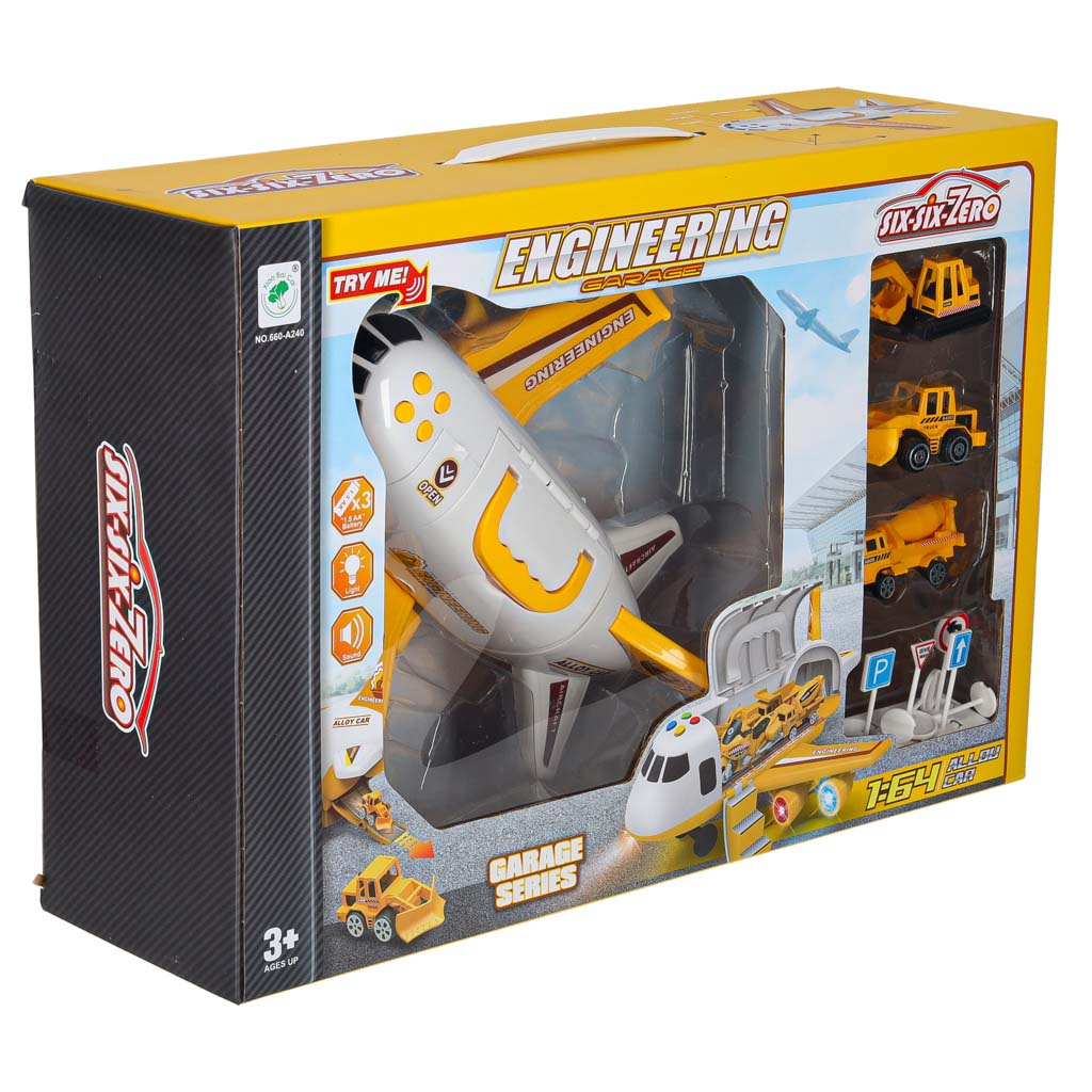 Un proiect de construcție uriaș și ambițios nu se poate desfășura fără utilaje de construcție grele. Fără un excavator și un malaxor de beton nu se poate construi nicio clădire decentă! Folosiți avionul pentru a transporta echipamentul pe șantier. Avionul, ca un adevărat transportator de echipamente grele, are o rampă descendentă în spate care permite intrarea vehiculelor. Poate fi deschis și din lateral , pentru a facilita manipularea jucăriilor din interior.