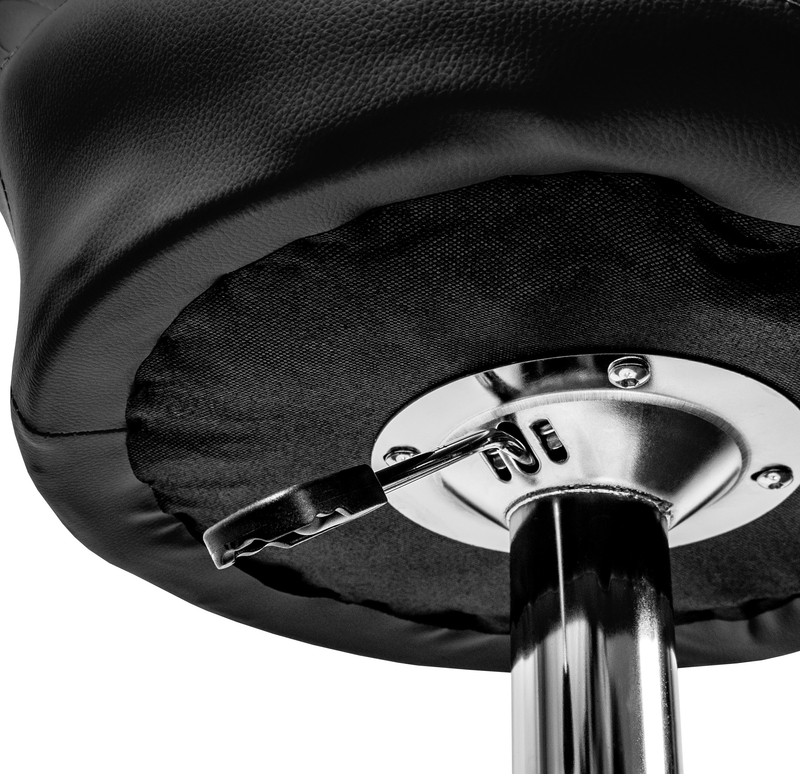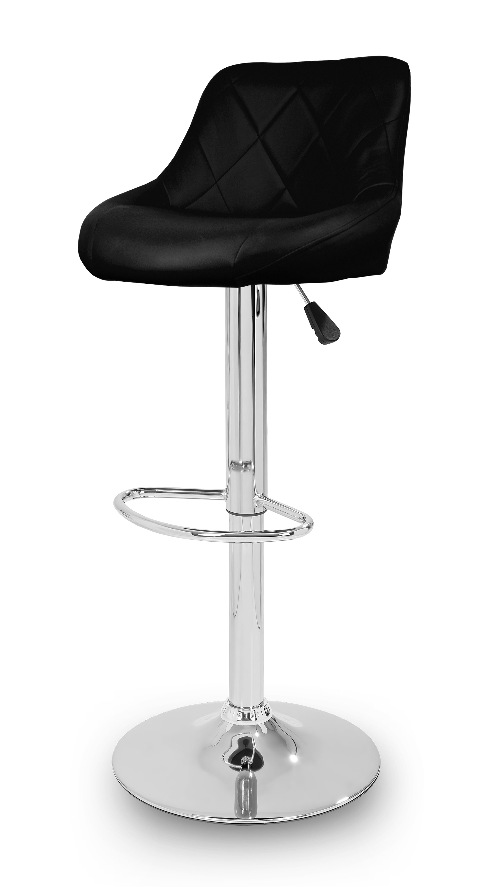 Scaunul are un suport practic pentru picioare din metal cromat. Baza circulară și piciorul central sunt din crom lucios.