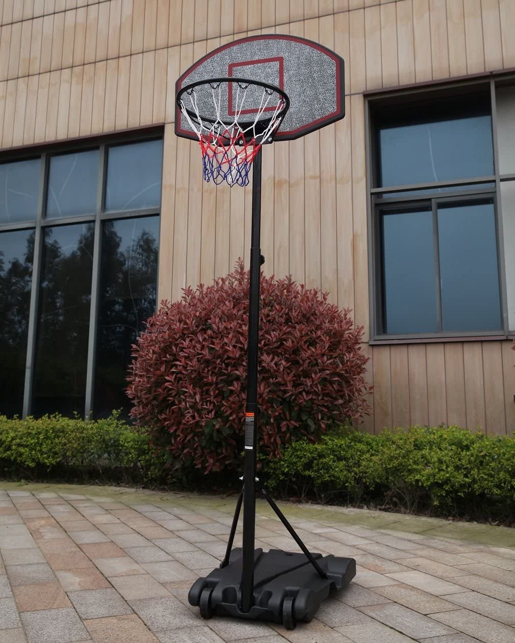 Coș de baschet mobil cu înălțime reglabilă, placă de plastic solidă și inel cu plasă.