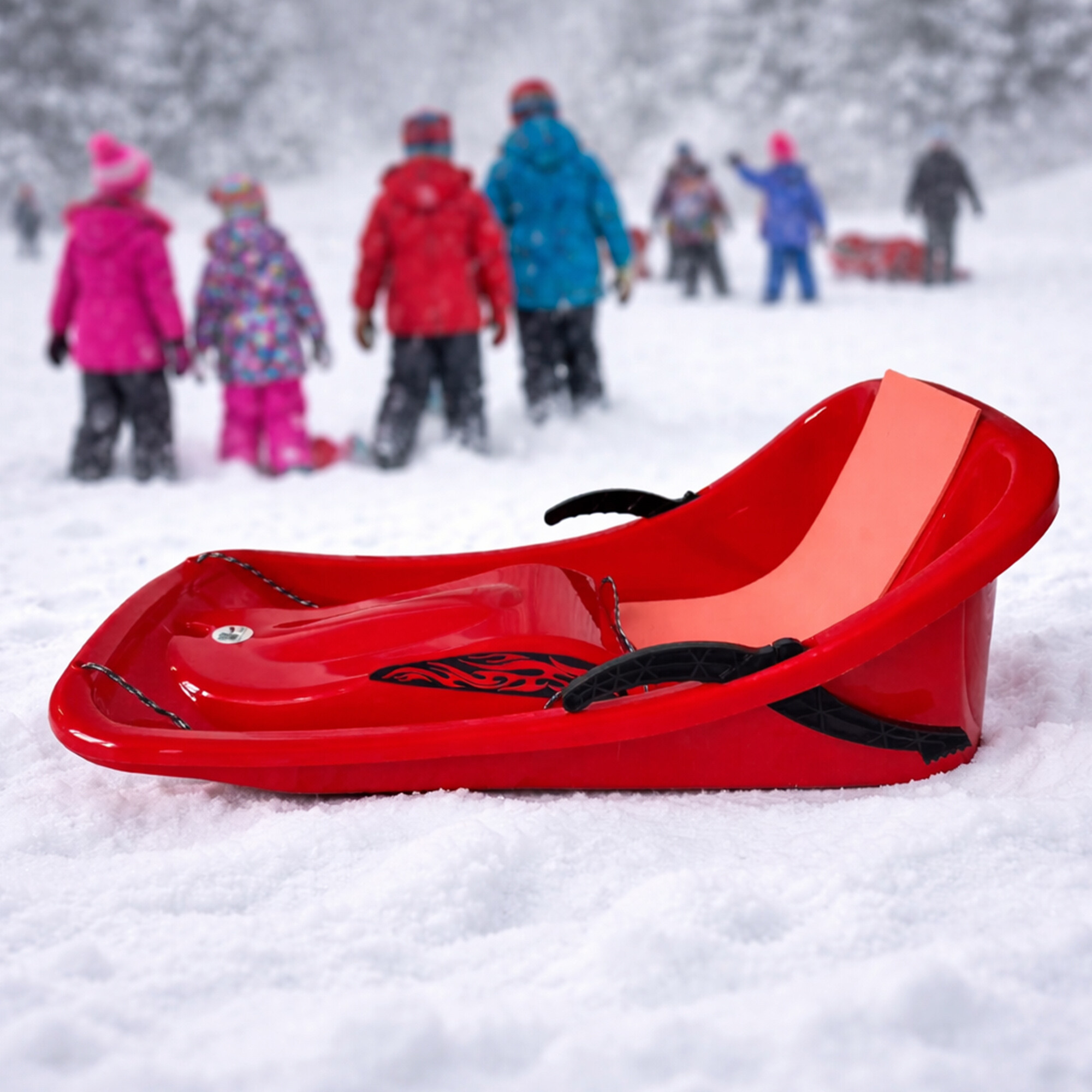 Săniuțe clasice pentru copii într-un design modern, fără margini ascuțite, cu două frâne independente.