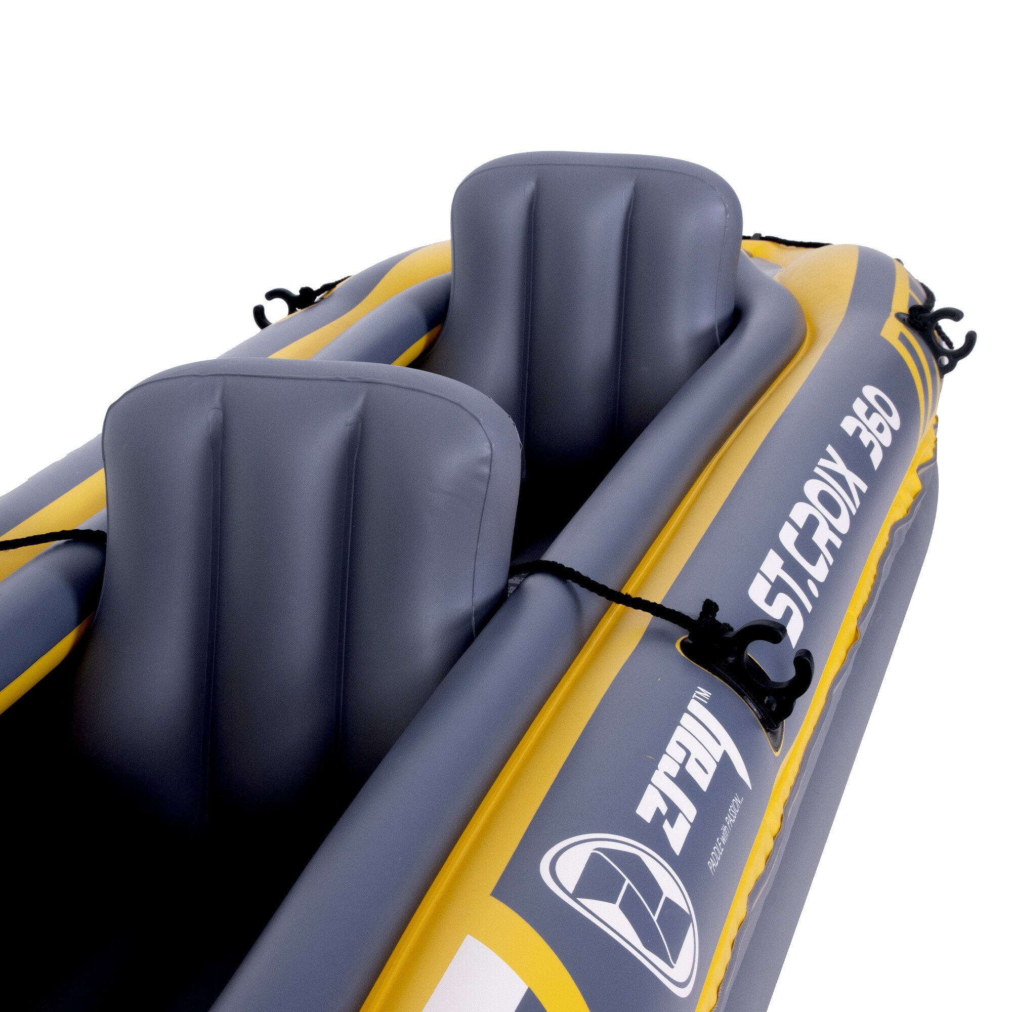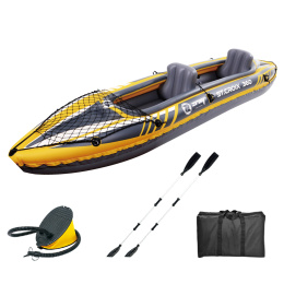 Avantajul acestui caiac gonflabil este podeaua moale, scaunele gonflabile confortabile și multe alte facilități. În pachet veți găsi, de asemenea, o pompă și vâsle.