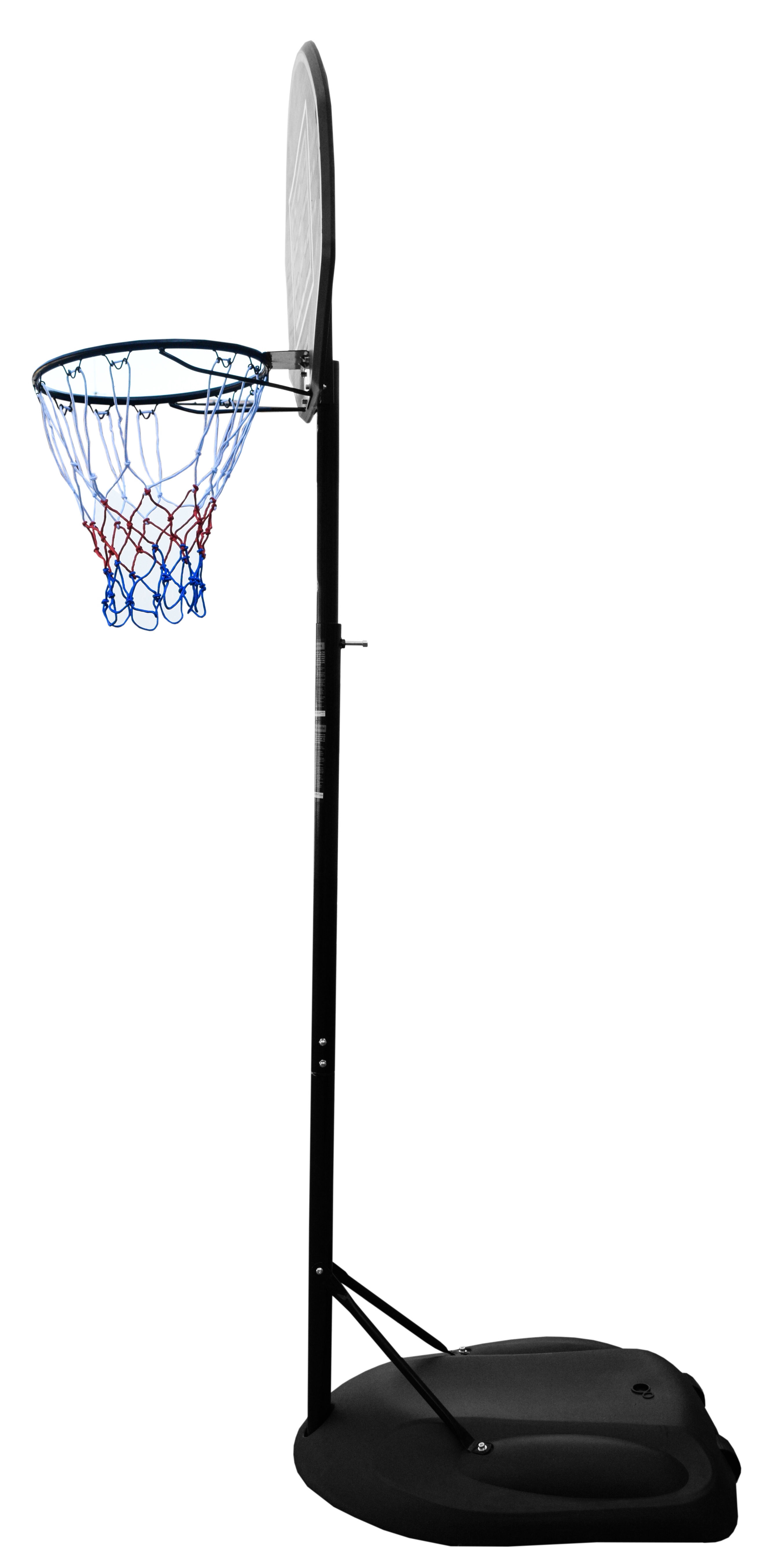 Coș de baschet mobil cu înălțime reglabilă, placă de plastic solidă și inel cu plasă.