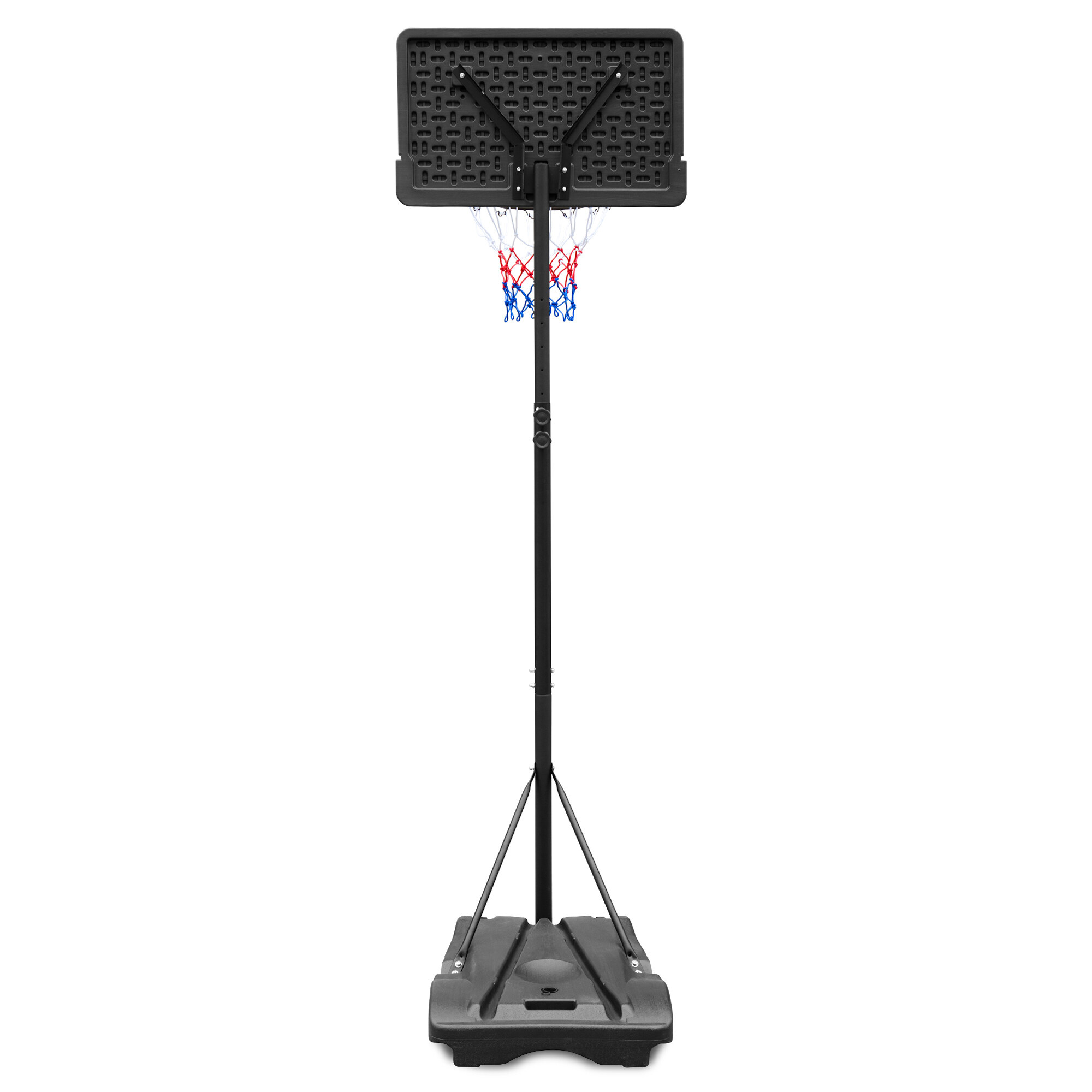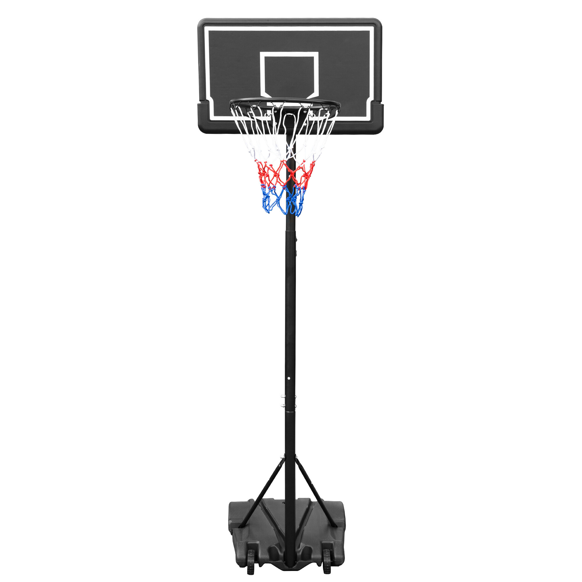 Coș de baschet mobil cu înălțime reglabilă, placă de plastic solidă și inel cu plasă.