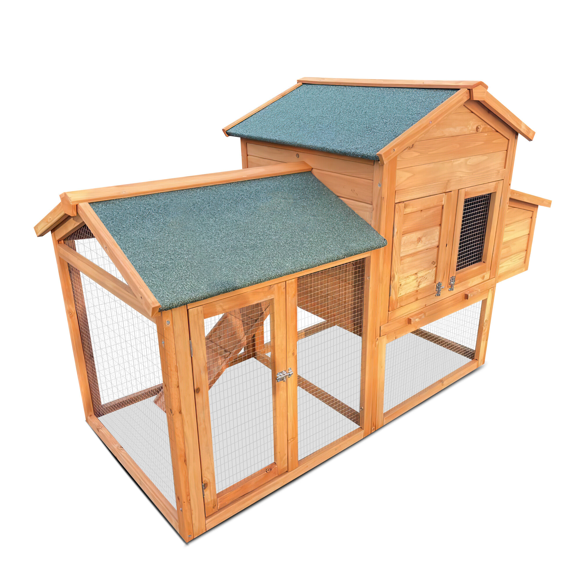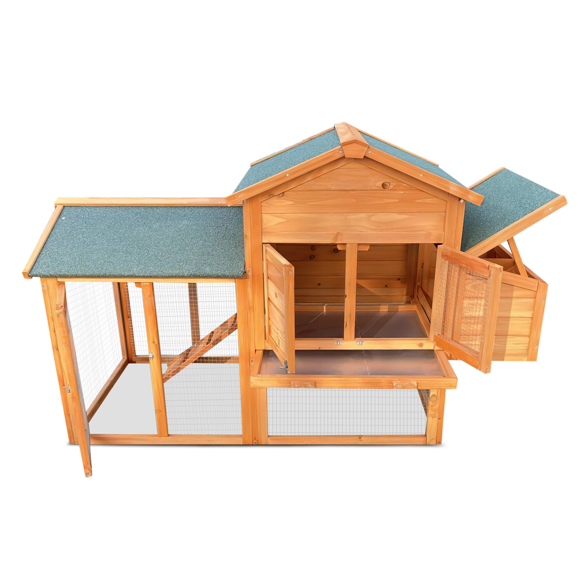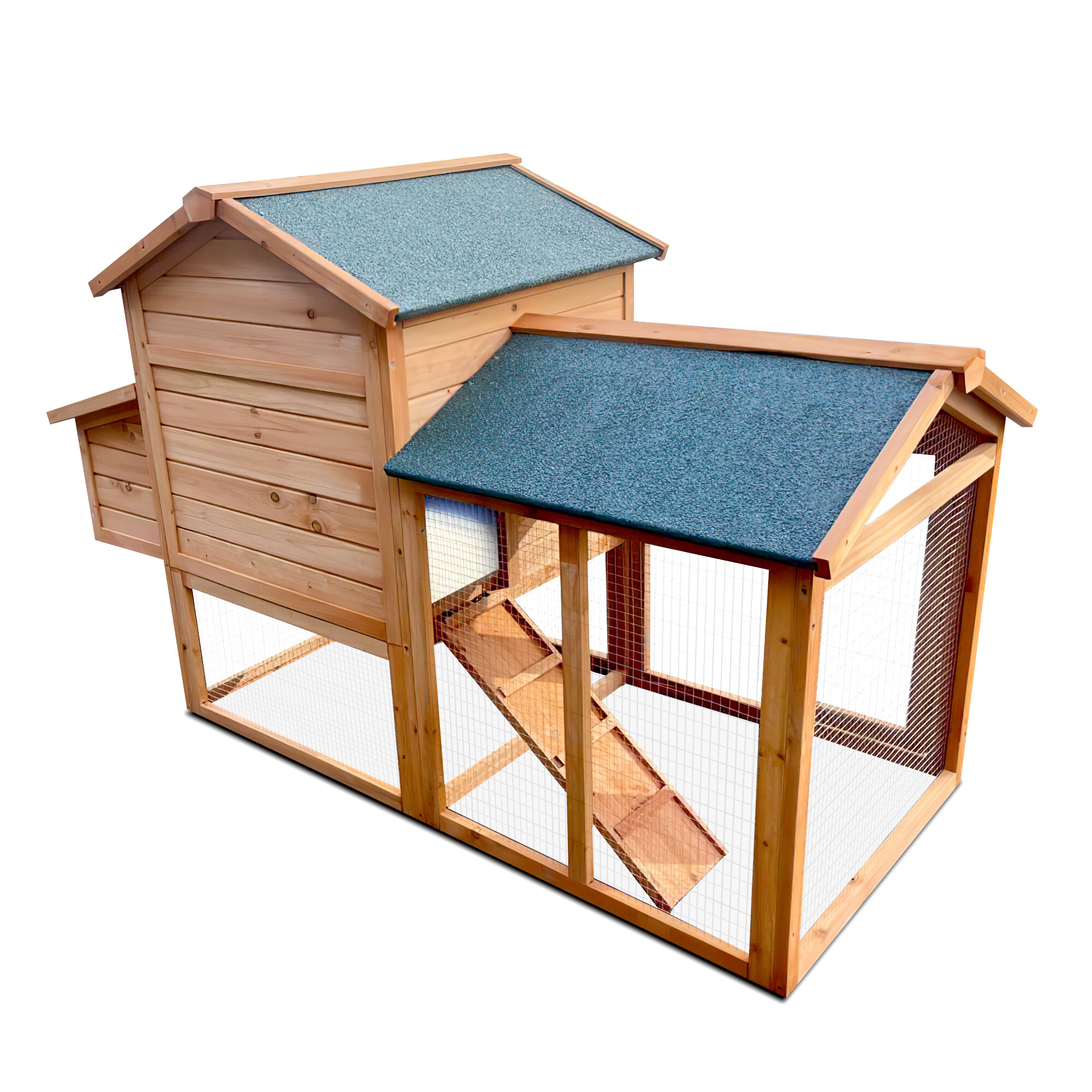 Un țarc conectat la zona de locuit permite găinilor să se miște liber. Acoperișul este echipat cu un înveliș de șindrilă de calitate, care protejează găinile de ploaie și zăpadă. O rampă duce de la etajul inferior la cel superior, pe care animalele pot urca ușor. Ușa poate fi închisă cu ușurință și asigurată cu zăvoare glisante.