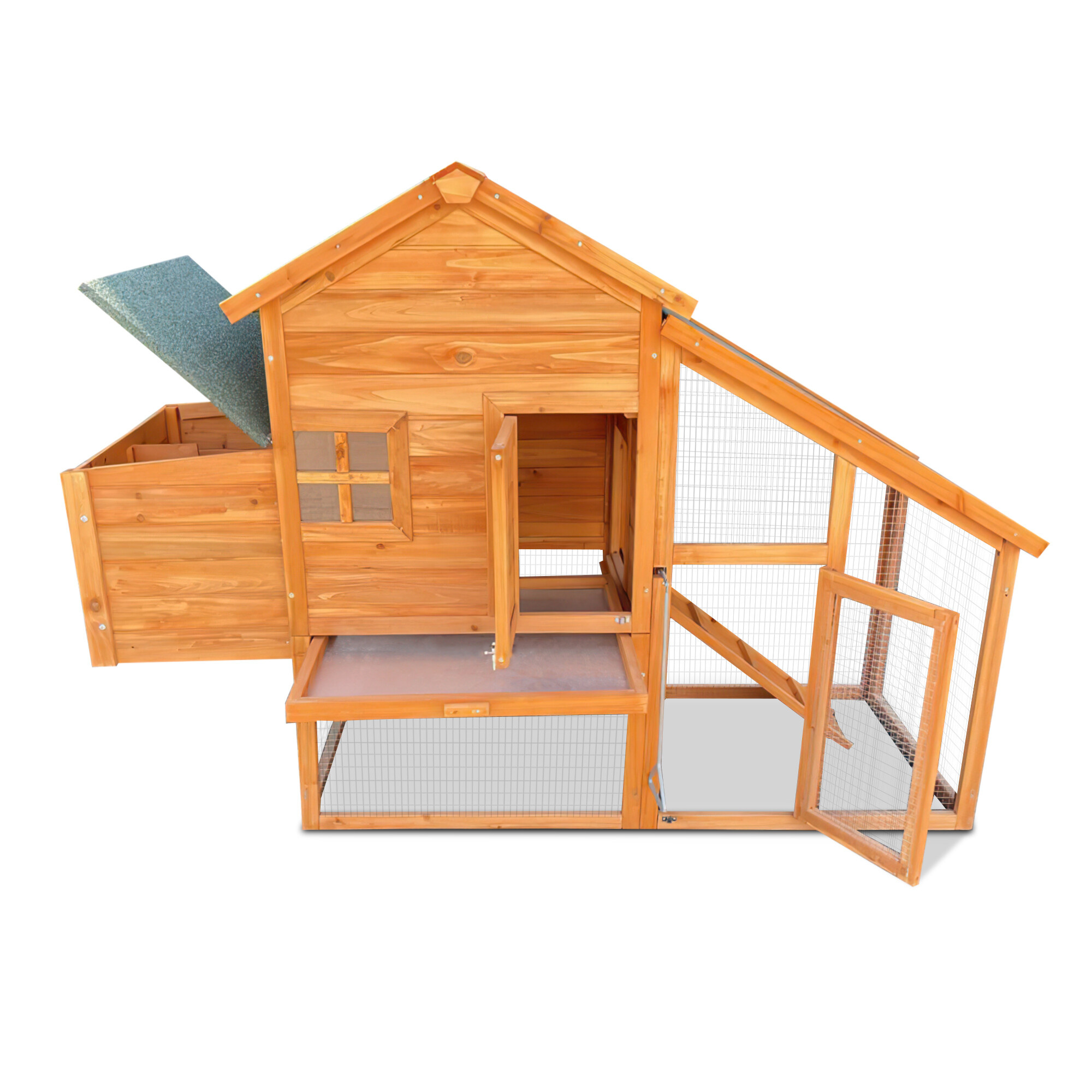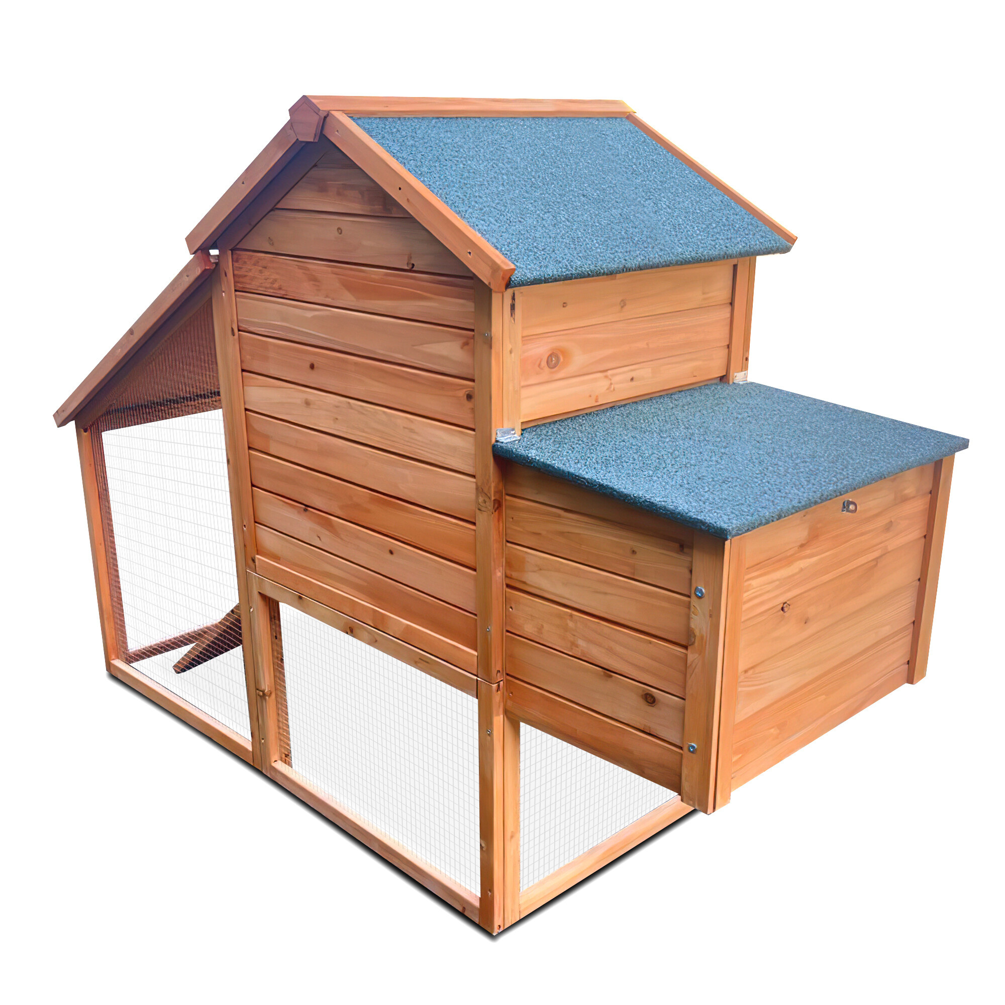 Un țarc conectat la zona de locuit permite găinilor să se miște liber. Acoperișul este echipat cu un înveliș de șindrilă de calitate, care protejează găinile de ploaie și zăpadă. O rampă duce de la etajul inferior la cel superior, pe care animalele pot urca ușor. Ușa poate fi închisă cu ușurință și asigurată cu zăvoare glisante.