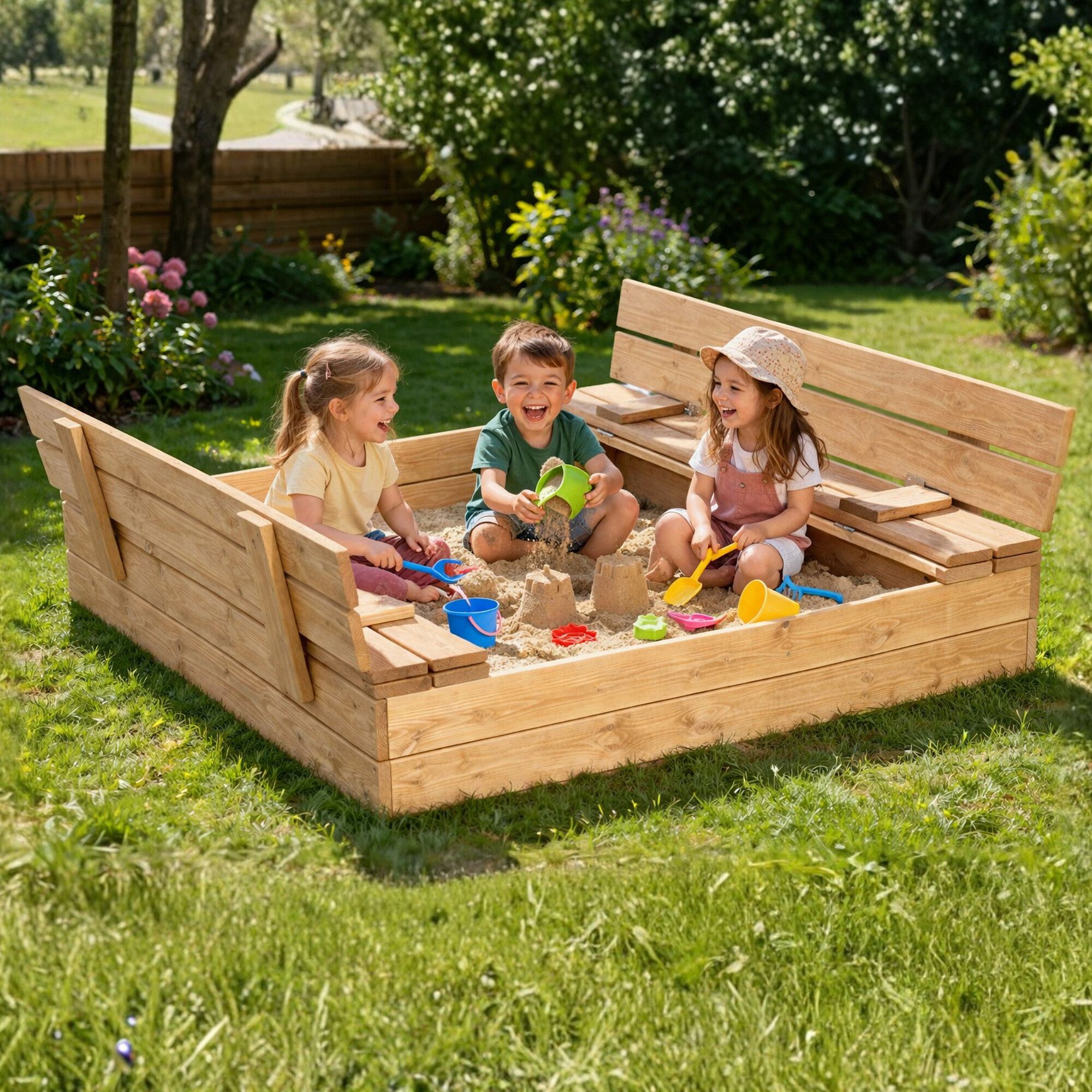 Un mare avantaj este capacul de protecție practic, care protejează nisipul de murdărie, ploaie și animale. La deschidere, trapa se transformă ușor în bănci confortabile, pe care copiii se pot așeza în timpul jocului.