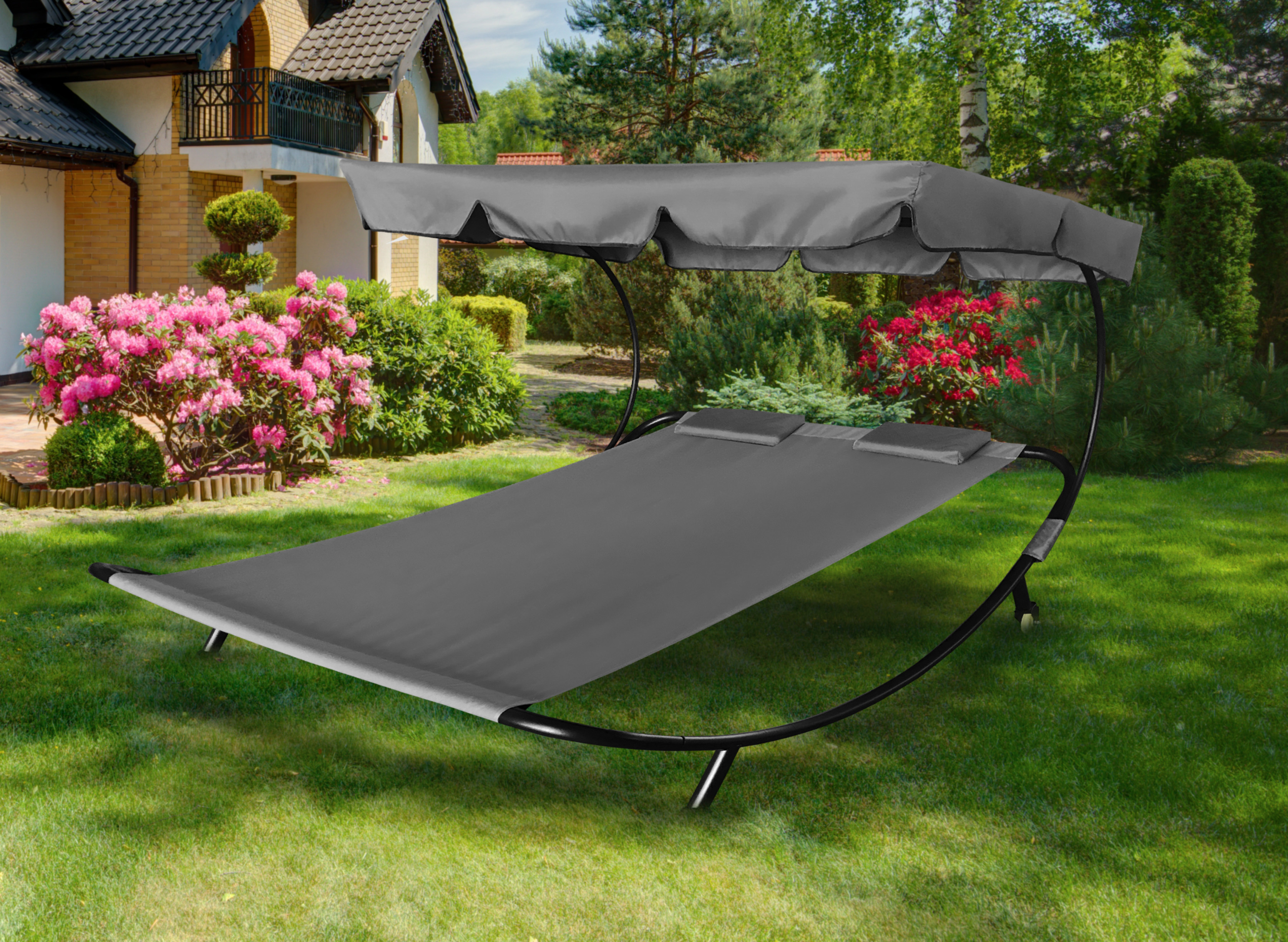 Un șezlong de grădină de lux pentru două persoane permite relaxarea pe terasă, în grădină sau în aer liber. Șezlongul dublu este fabricat dintr-o țesătură oxford de calitate, care rezistă excelent la intemperii.
