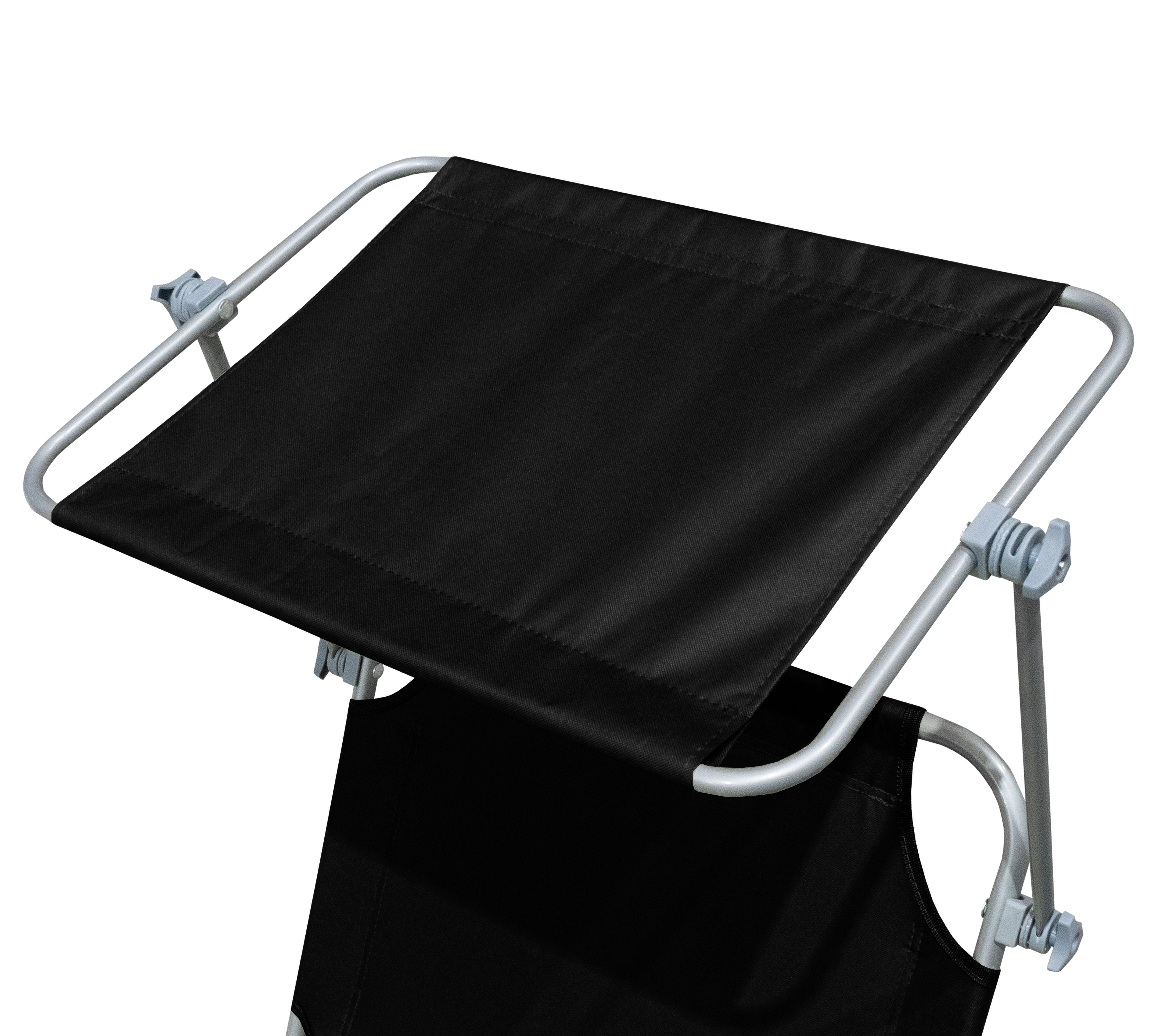 Parte a șezlongului include o copertină detașabilă, care poate fi ajustată liber și protejează fața de soarele puternic.Spătarul șezlongului poate fi reglat în 4 poziții diferite.