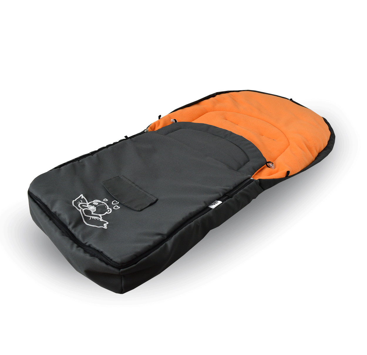 Sacul de dormit pentru copii are un fermoar care se poate deschide, orificii pentru centurile de siguranță în 5 puncte și prinderi elastice care permit fixarea de cărucior.