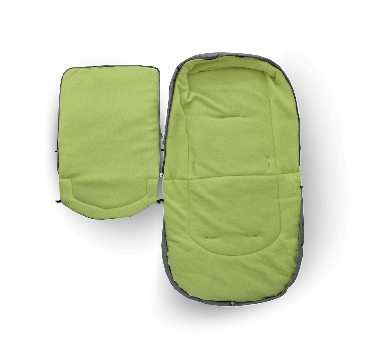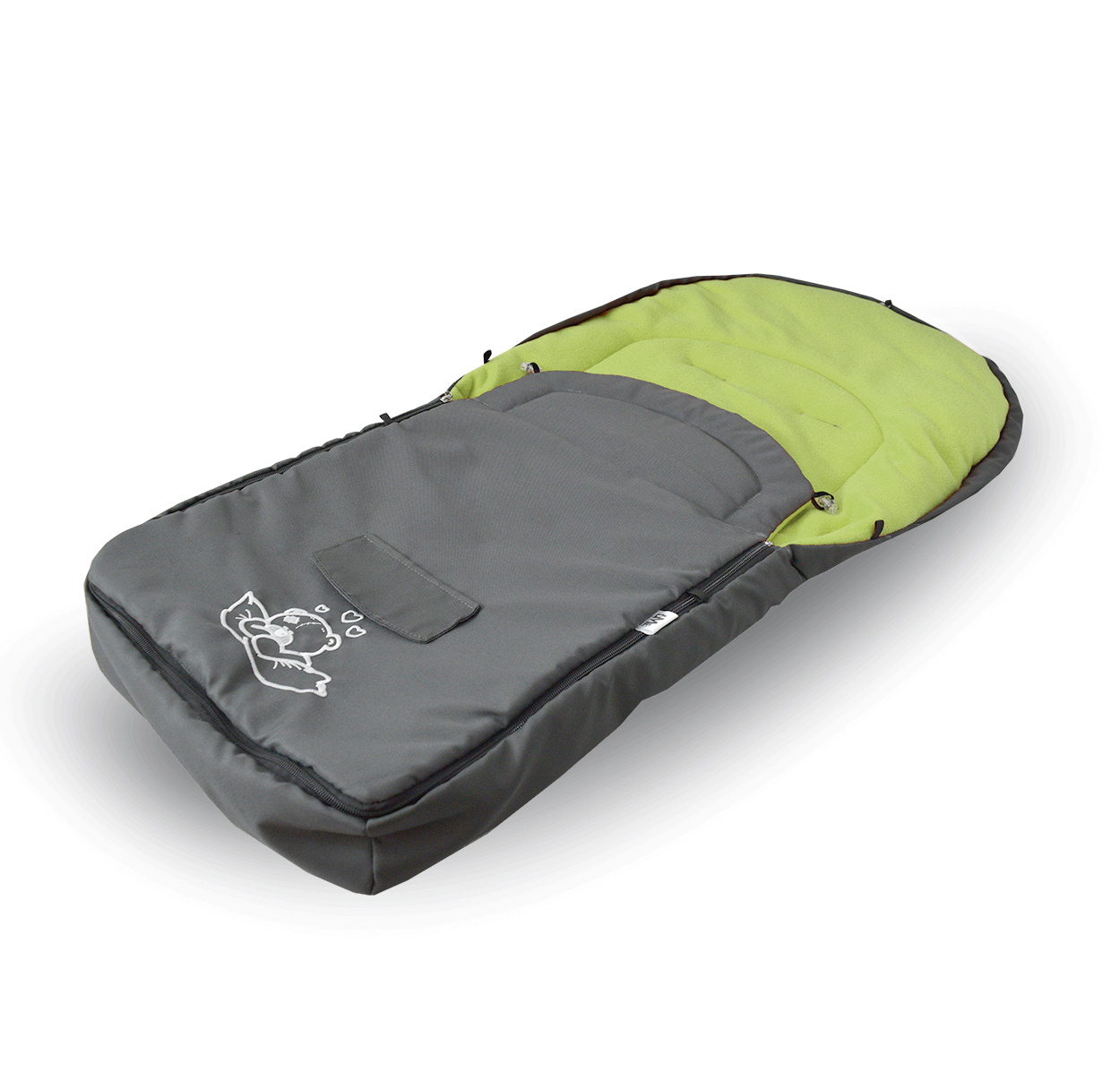 Sacul de dormit pentru copii are un fermoar care se poate deschide, orificii pentru centurile de siguranță în 5 puncte și prinderi elastice care permit fixarea de cărucior.