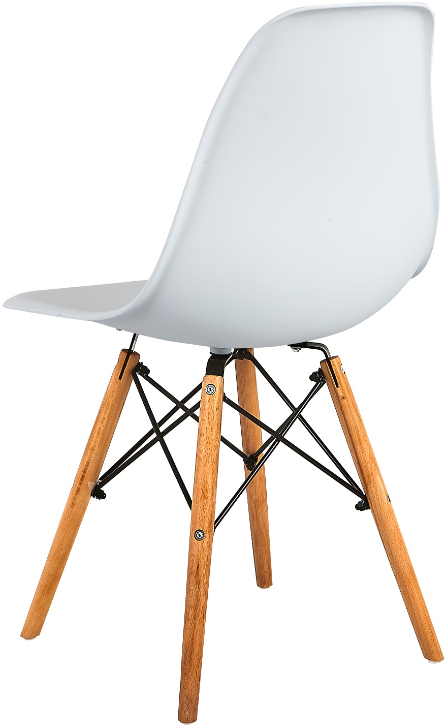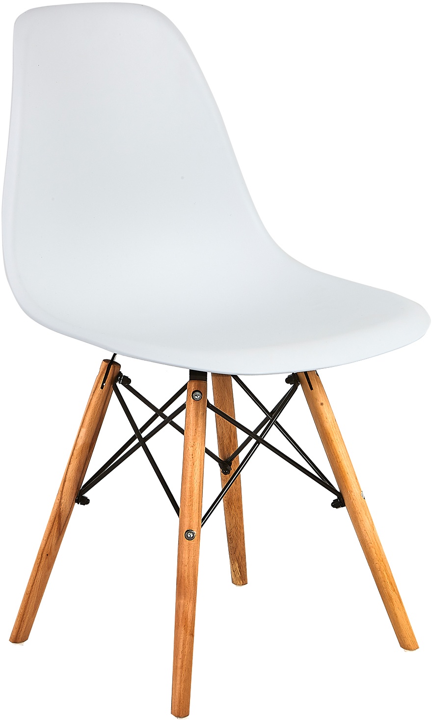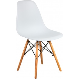 Un scaun care se remarcă printr-un design retro modern minunat, cu un șezut frumos conturat și picioare din lemn.