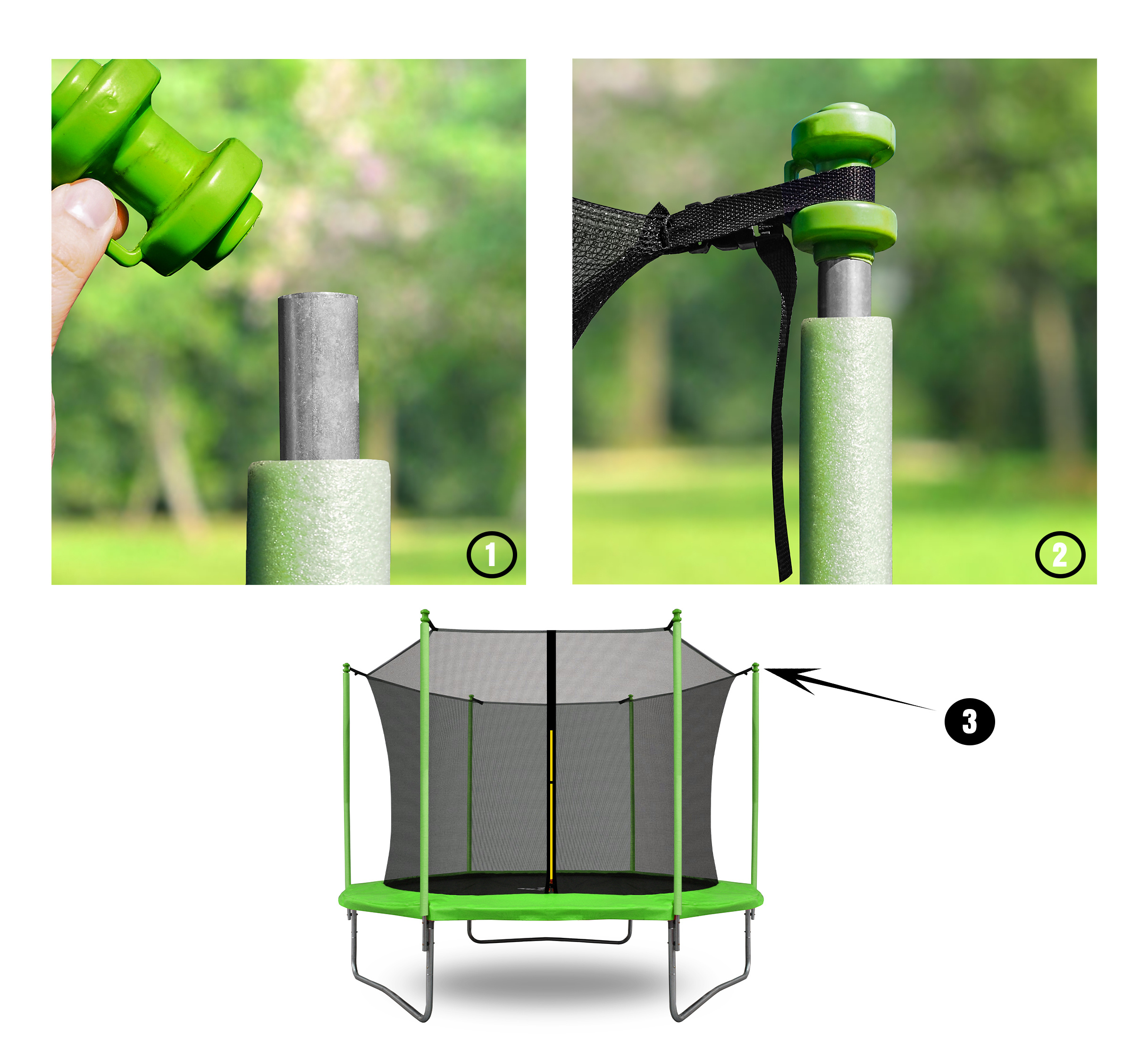 Capacul se montează pe bara superioară de protecție a plasei trambulinei, iar principala sa sarcină este de a preveni rănirea de marginea ascuțită.