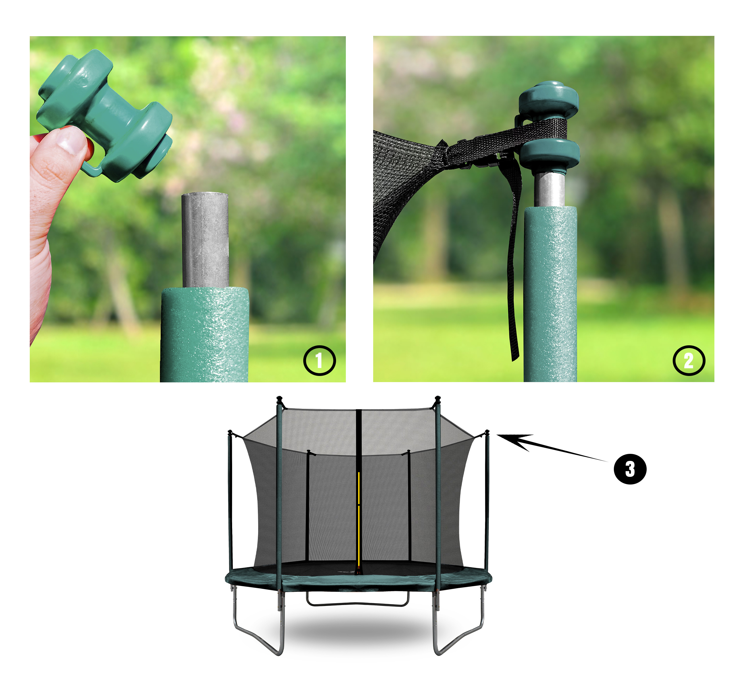 Capacul se montează pe bara superioară de protecție a plasei trambulinei, iar principala sa sarcină este de a preveni rănirea de marginea ascuțită.