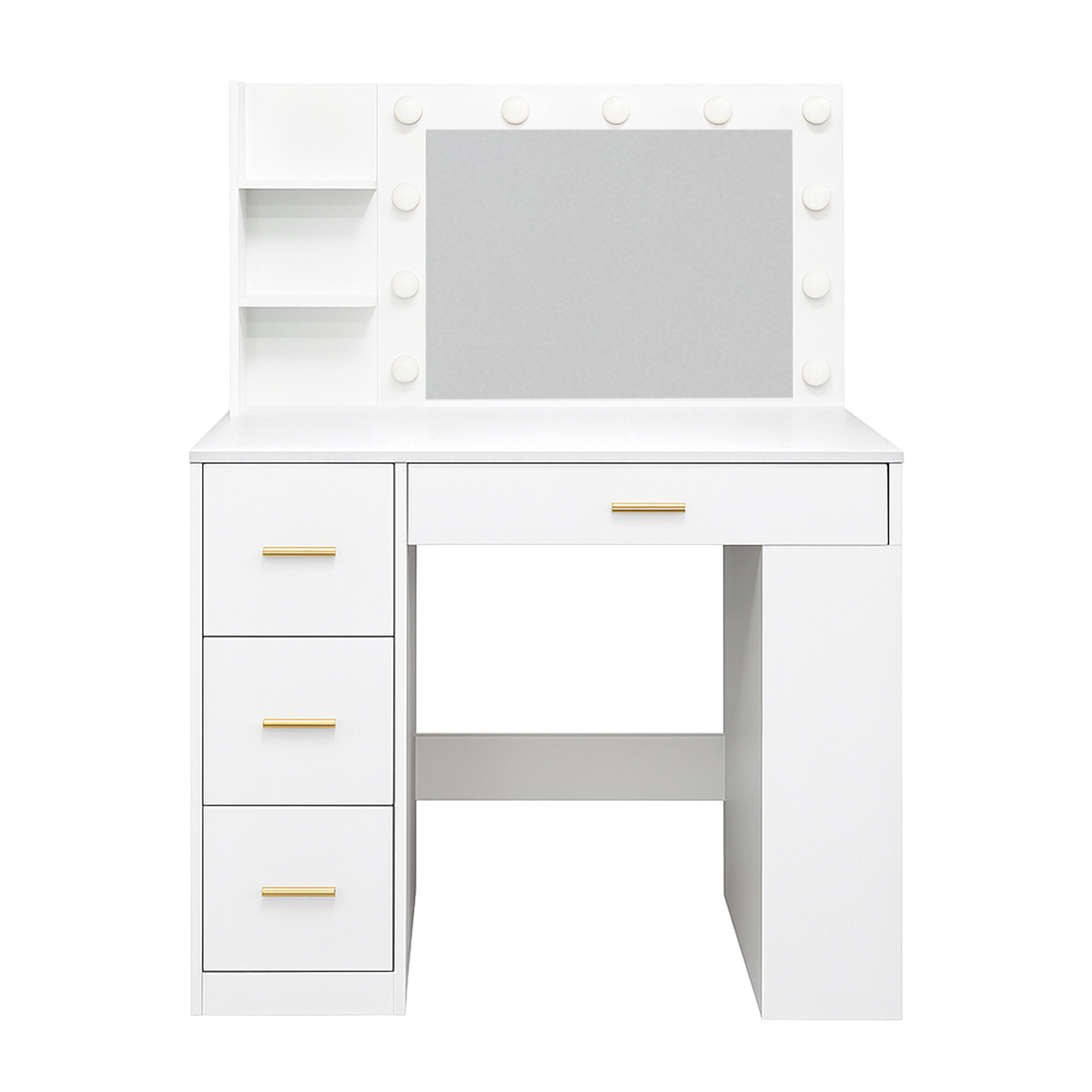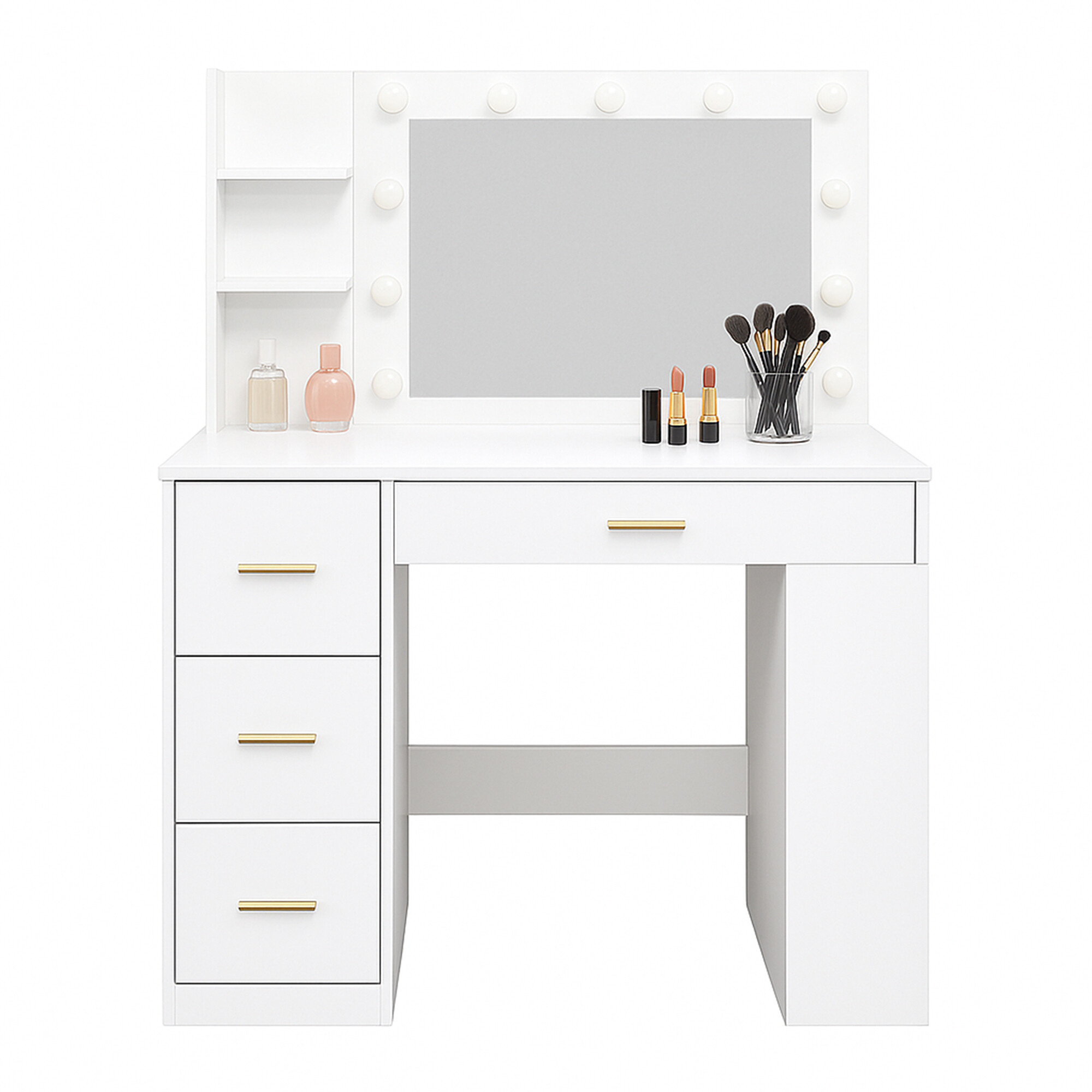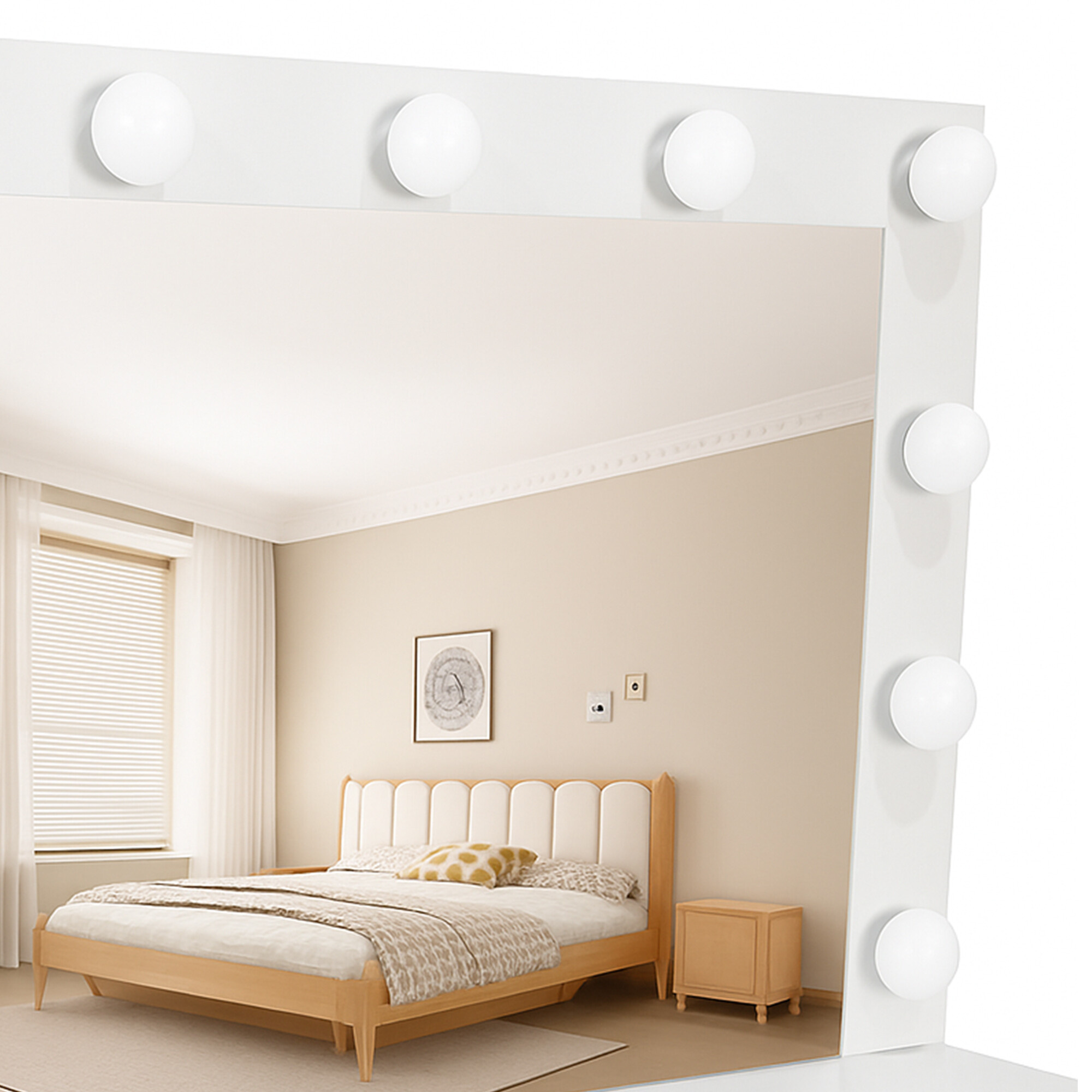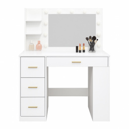 Dominanta mesei este o oglindă mare cu 11 becuri LED, la care puteți schimba cu ușurință temperatura luminii de la rece la neutră și până la caldă. Datorită acestui fapt, veți asigura întotdeauna iluminarea ideală pentru machiaj, aranjarea părului sau îngrijirea pielii de seară.