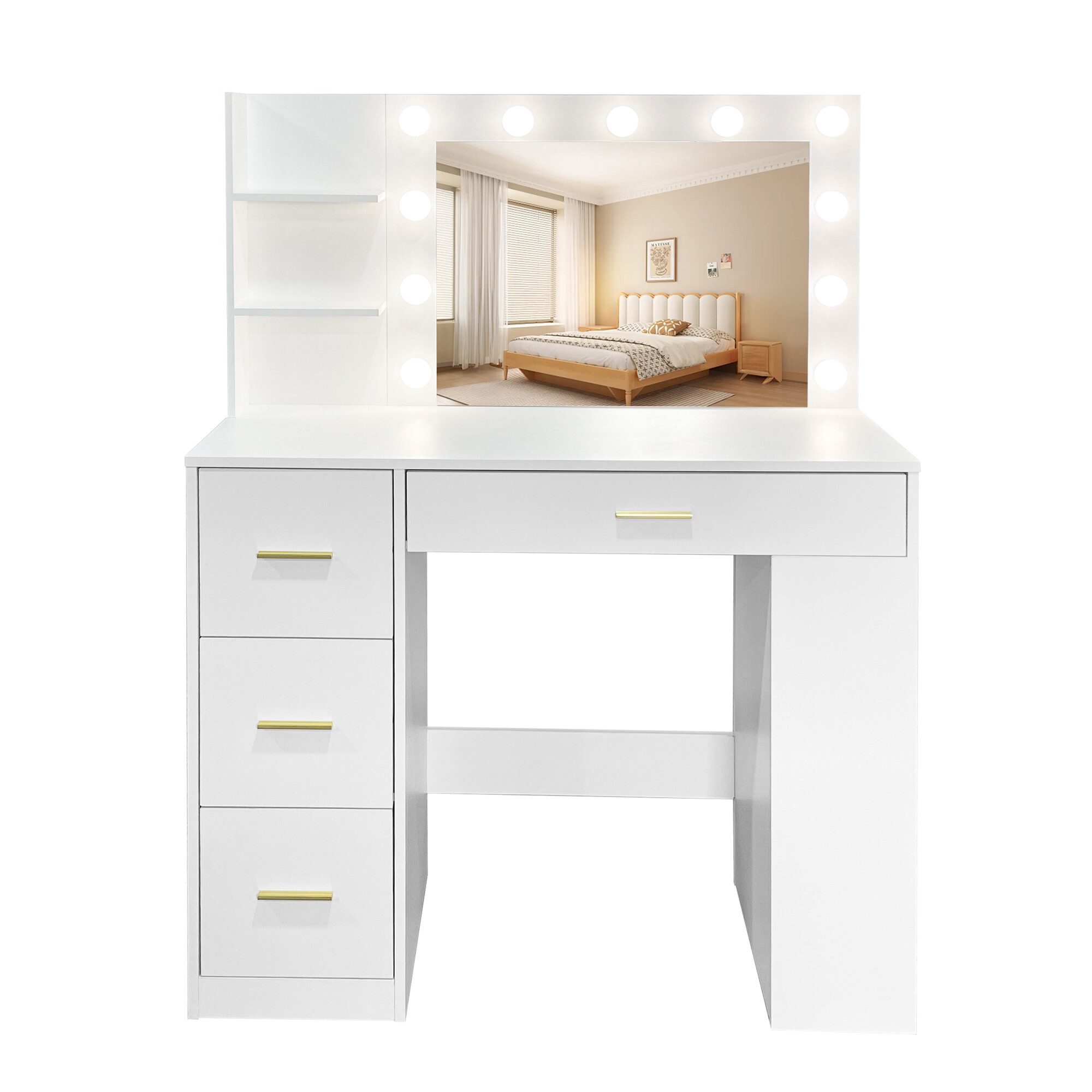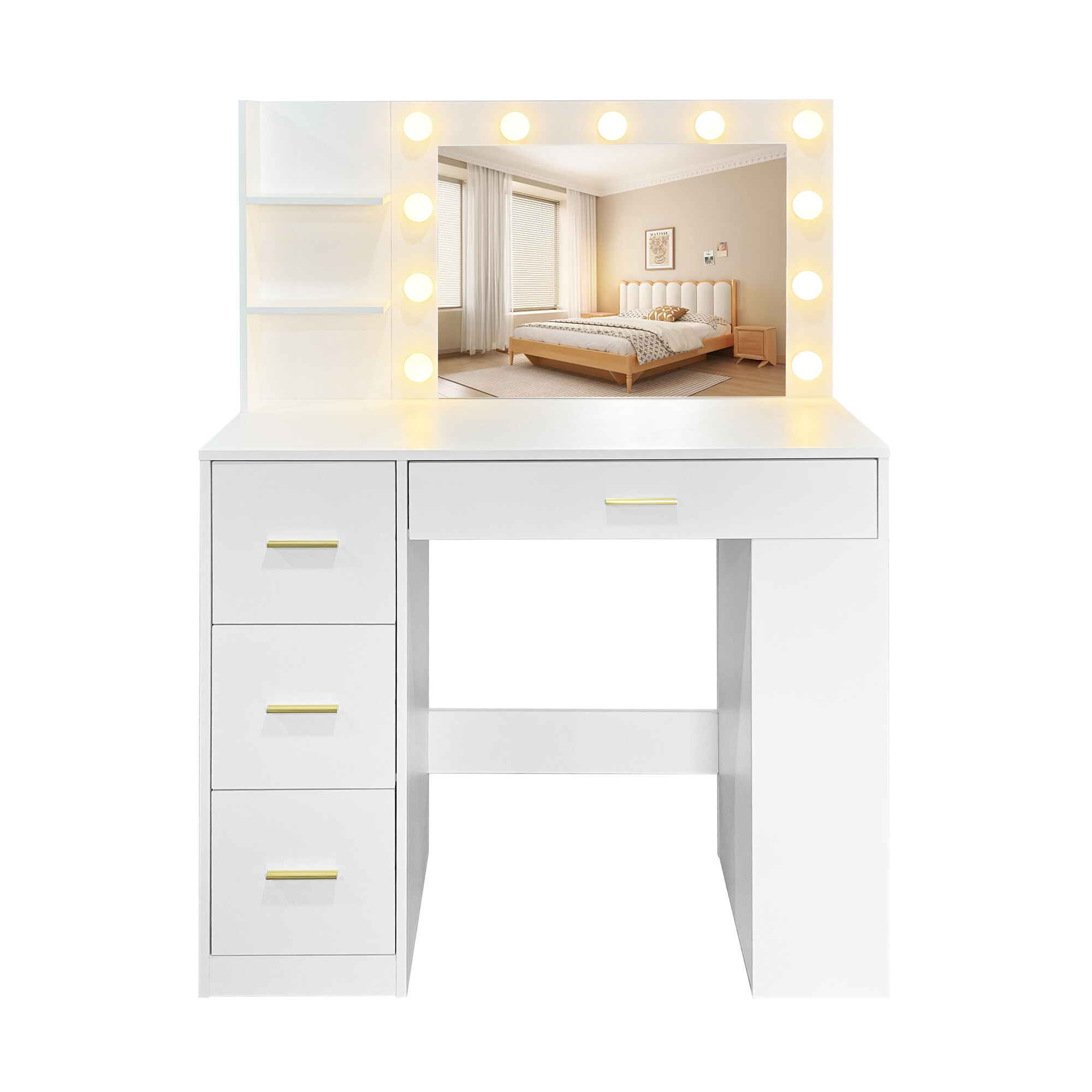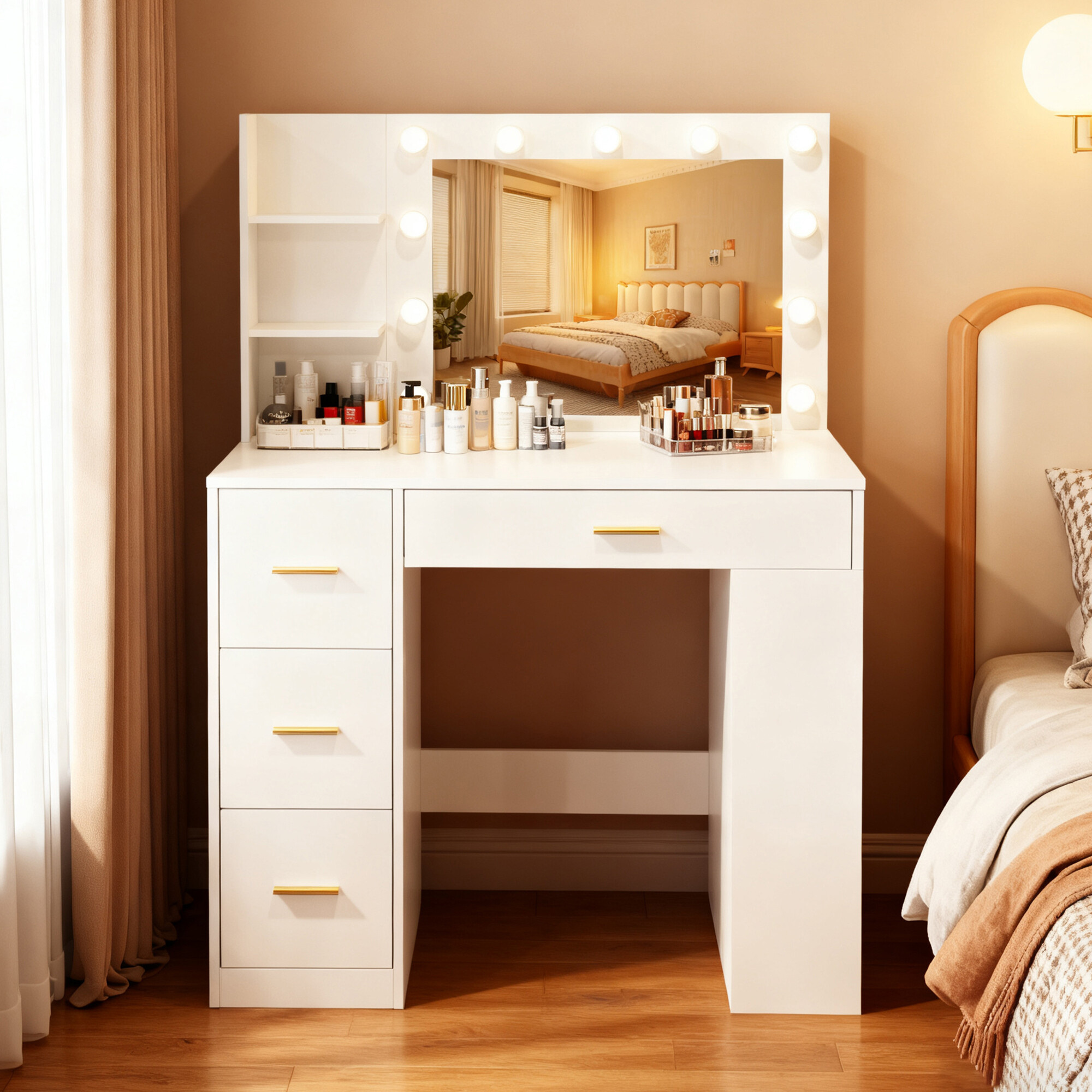 Dominanta mesei este o oglindă mare cu 11 becuri LED, la care puteți schimba cu ușurință temperatura luminii de la rece la neutră și până la caldă. Datorită acestui fapt, veți asigura întotdeauna iluminarea ideală pentru machiaj, aranjarea părului sau îngrijirea pielii de seară.