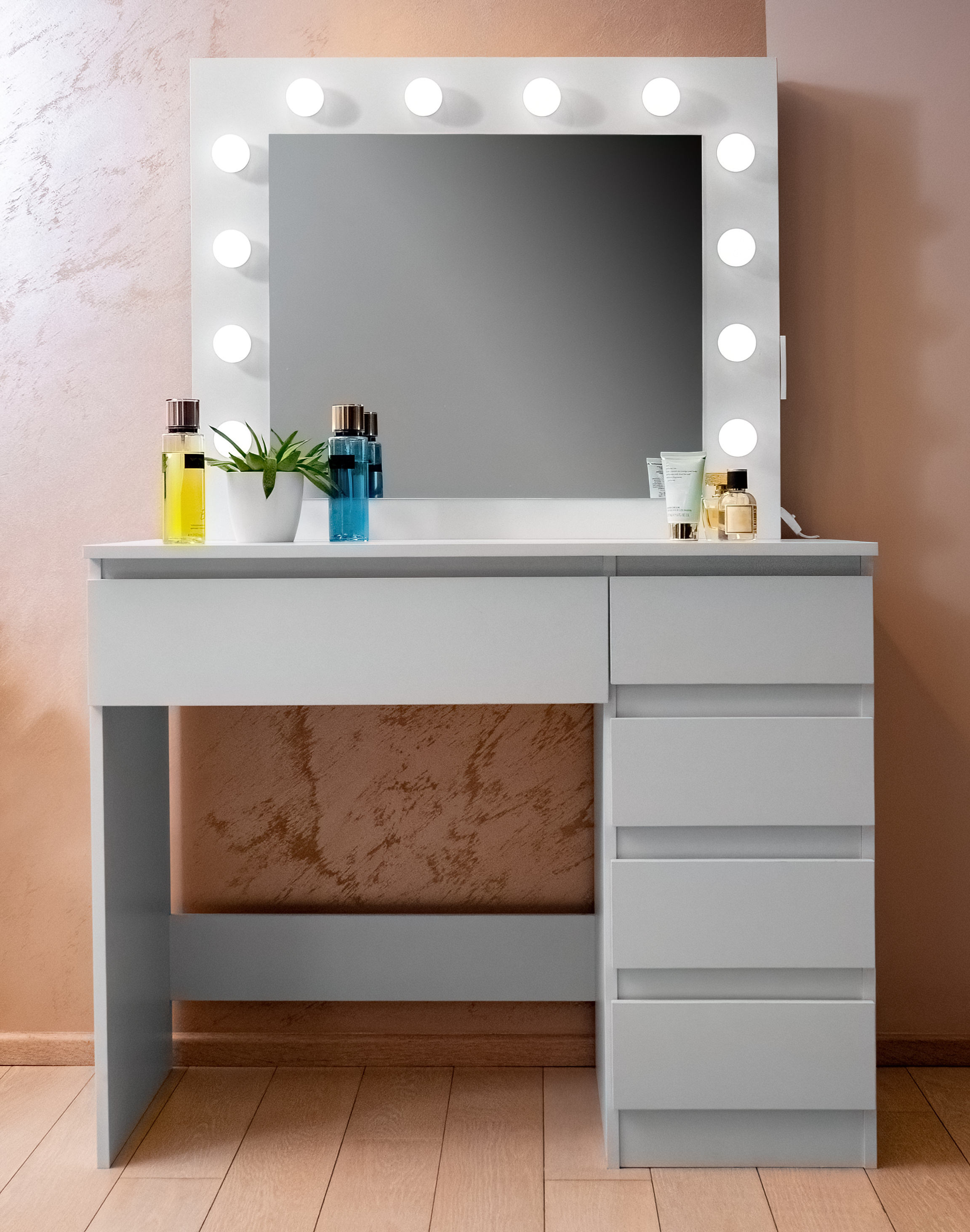 Cu siguranță veți aprecia și cele 5 sertare spațioase, în care vă puteți depozita confortabil toate ustensilele cosmetice, bijuteriile și celelalte accesorii.