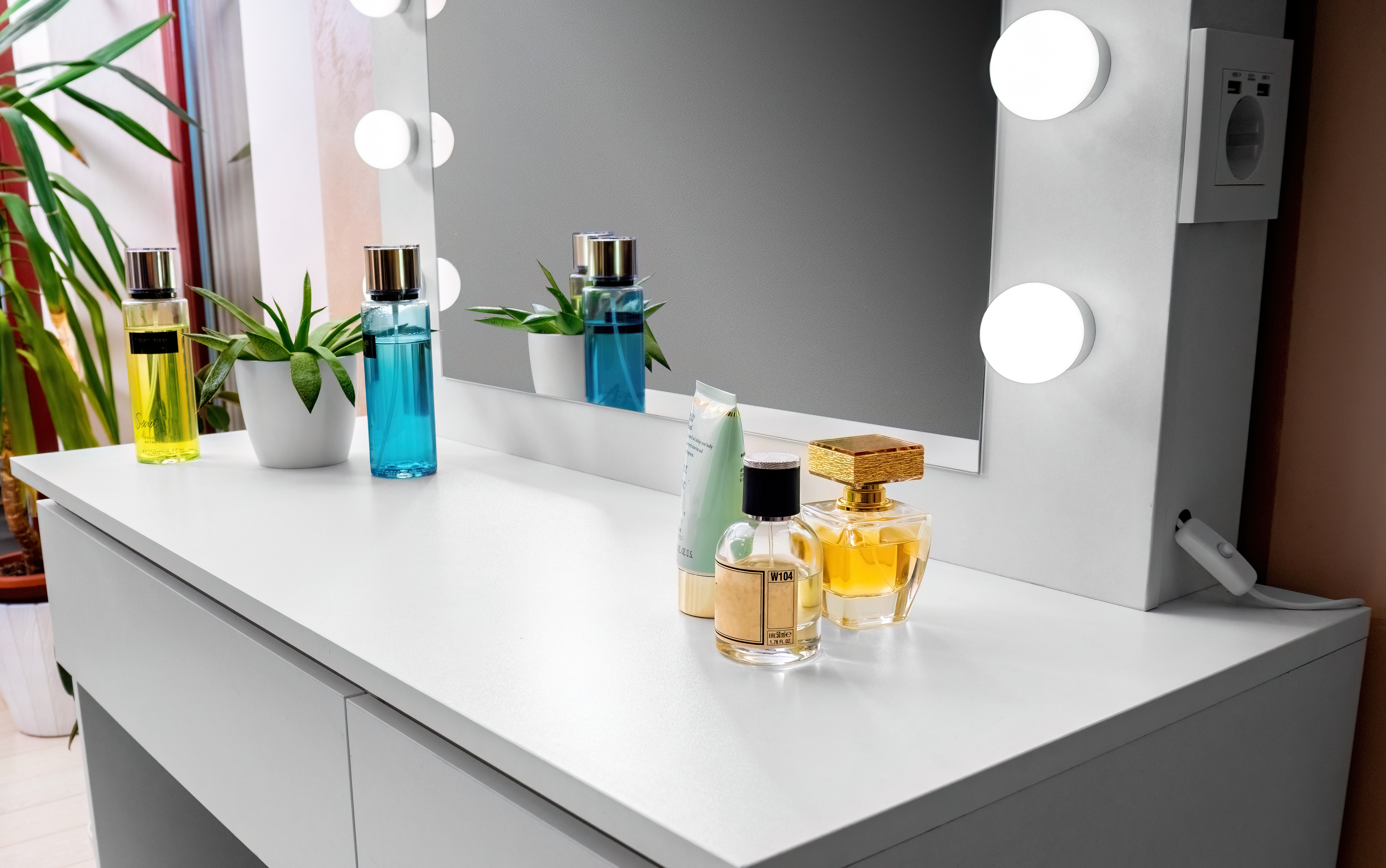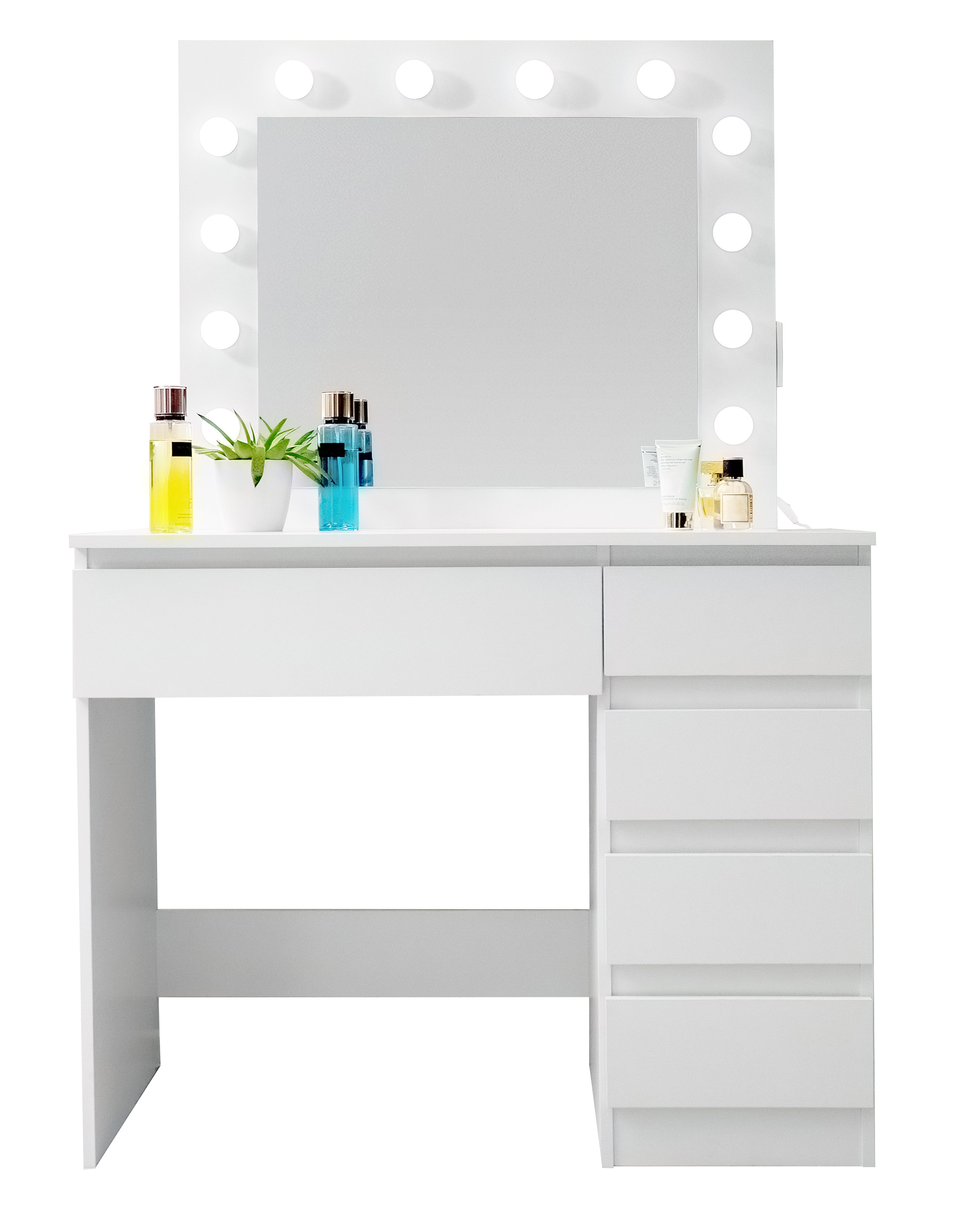 Pe oglindă sunt 12 becuri LED, astfel încât vă puteți machia confortabil chiar și în condiții de lumină naturală slabă.Pe partea laterală a oglinzii se află o priză electrică, de exemplu pentru uscător de păr, placă de îndreptat părul și conexiuni USB pentru încărcarea dispozitivelor mobile.