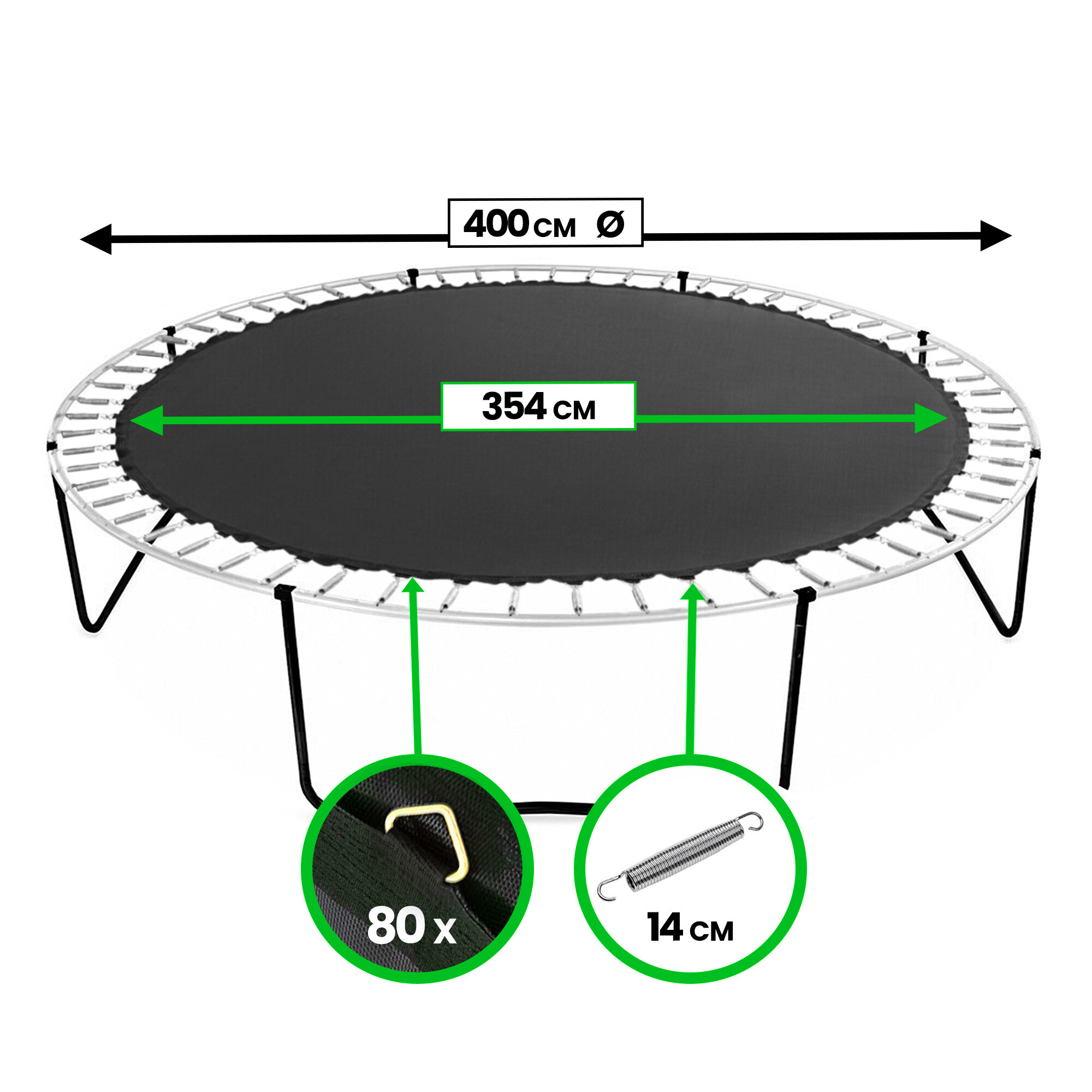 Suprafața de sărituri este fabricată din țesătură de polipropilenă (PP Mesh) cu un strat hidrofob, care este de asemenea rezistent la radiațiile UV.