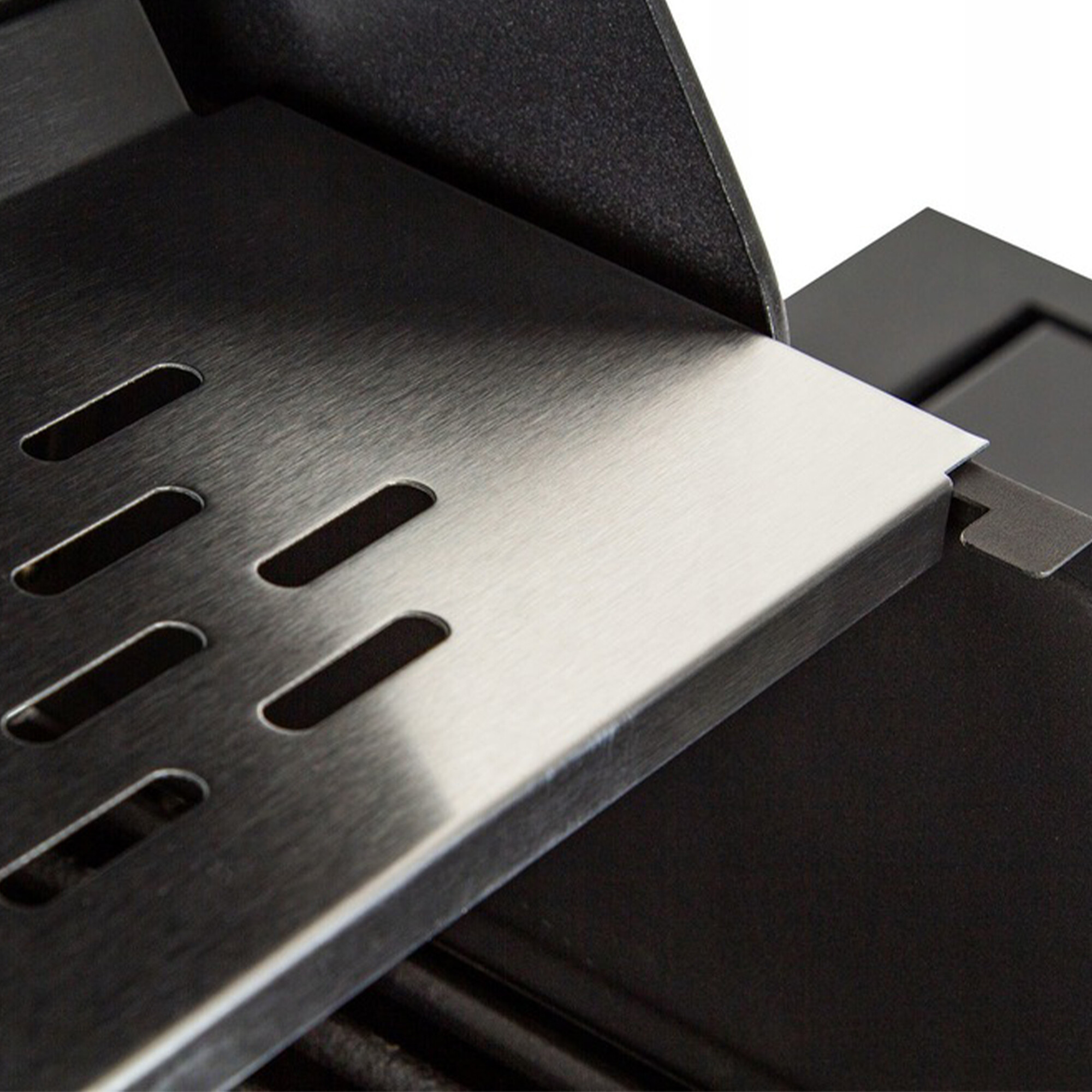 Grătarul este, de asemenea, echipat cu un arzător lateral încorporat, care este integrat în blatul de lucru - astfel puteți pregăti confortabil sosurile sau garniturile preferate în același timp cu grătarul. Capacul practic închis al arzătorului lateral permite utilizarea acestuia ca suprafață de lucru sau de depozitare atunci când este închis.