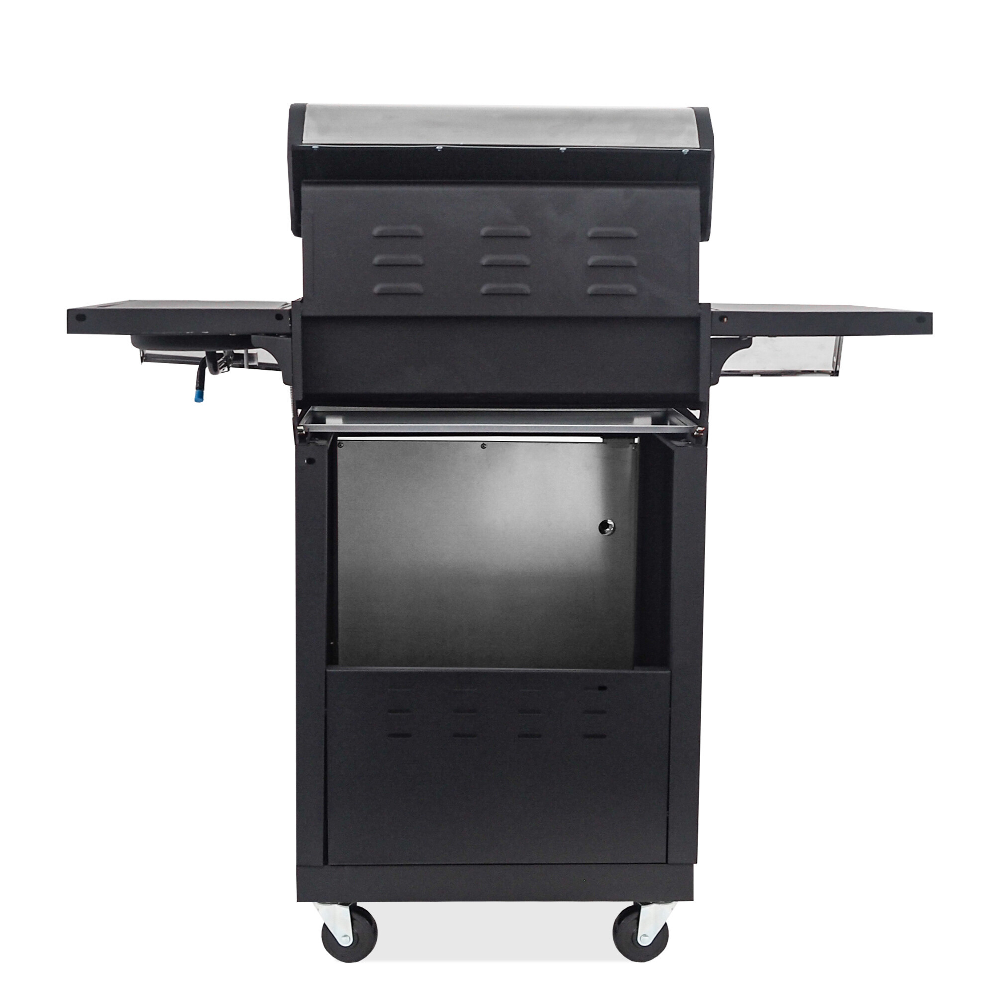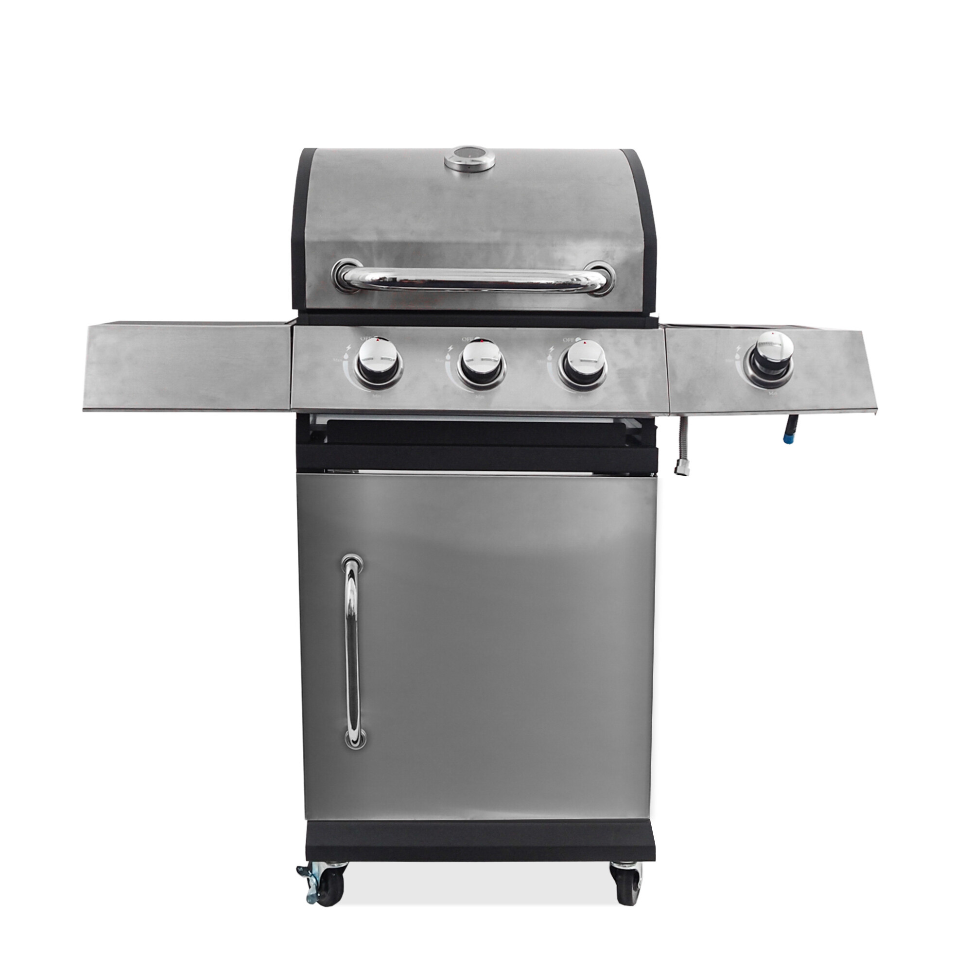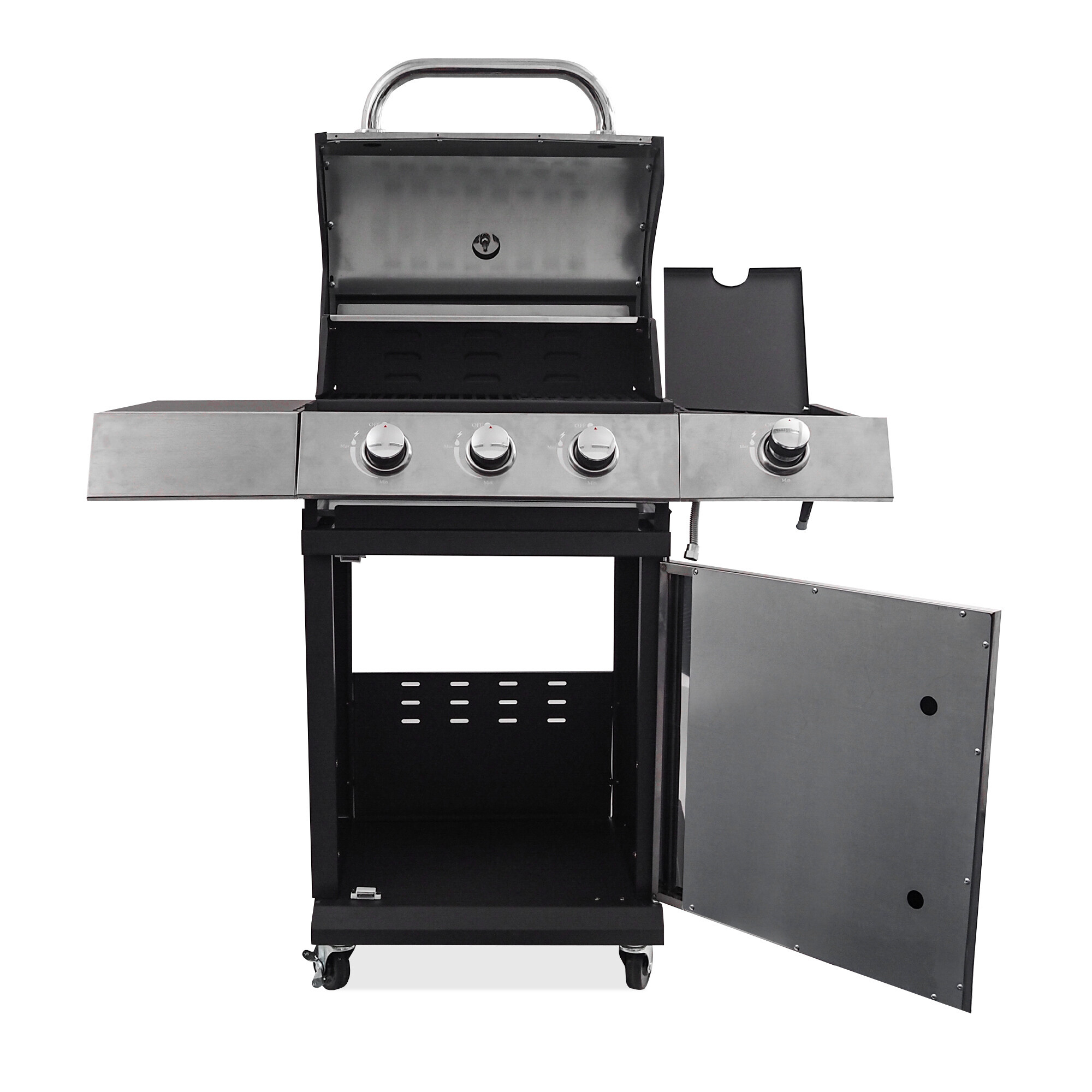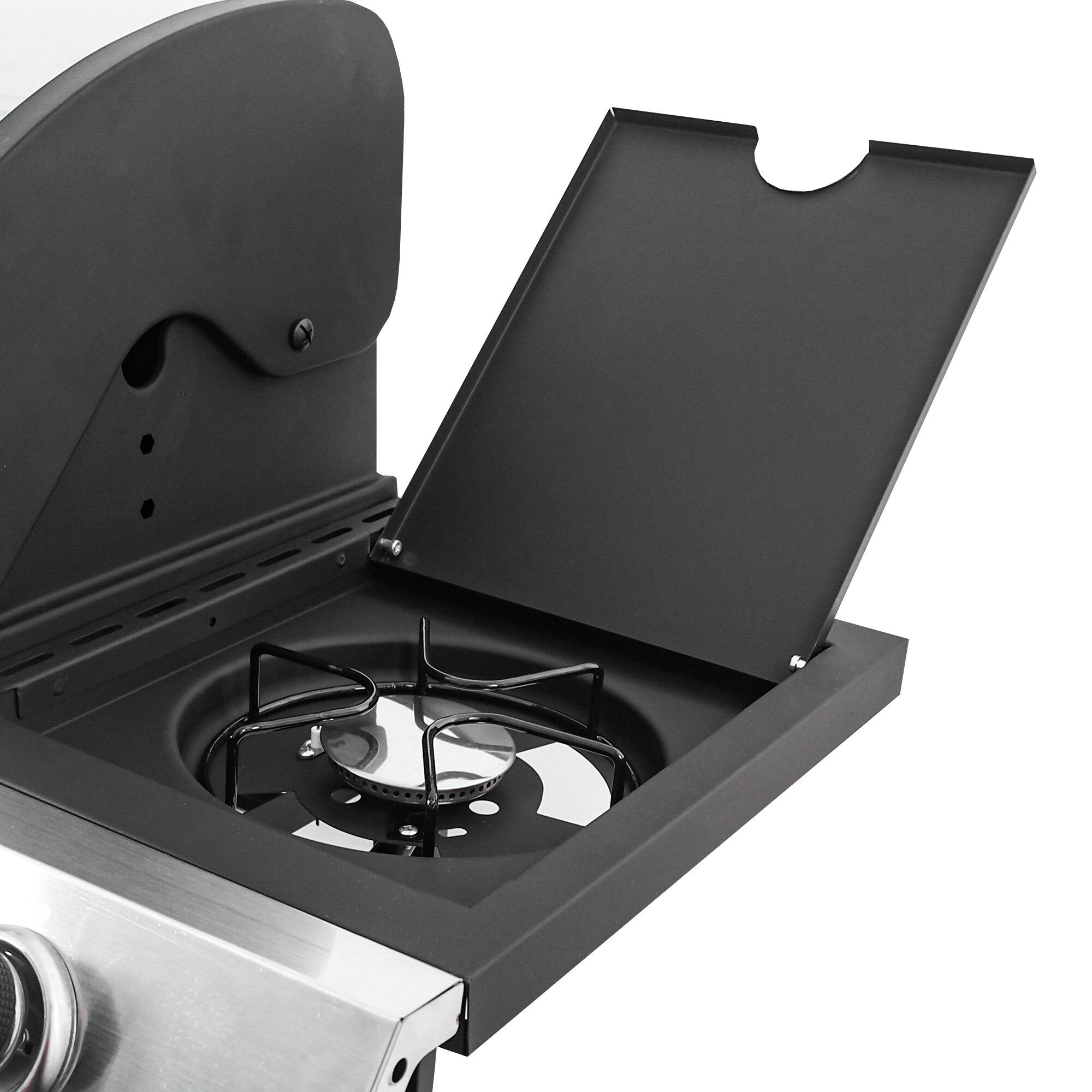 Grătarul este, de asemenea, echipat cu un arzător lateral încorporat, care este integrat în blatul de lucru - astfel puteți pregăti confortabil sosurile sau garniturile preferate în același timp cu grătarul. Capacul practic închis al arzătorului lateral permite utilizarea acestuia ca suprafață de lucru sau de depozitare atunci când este închis.