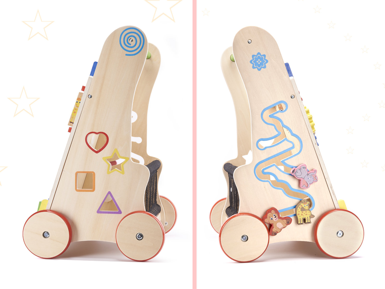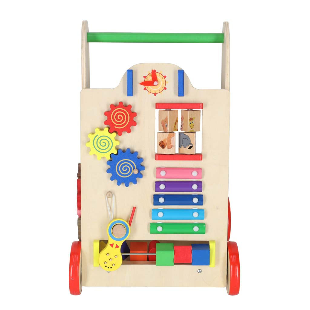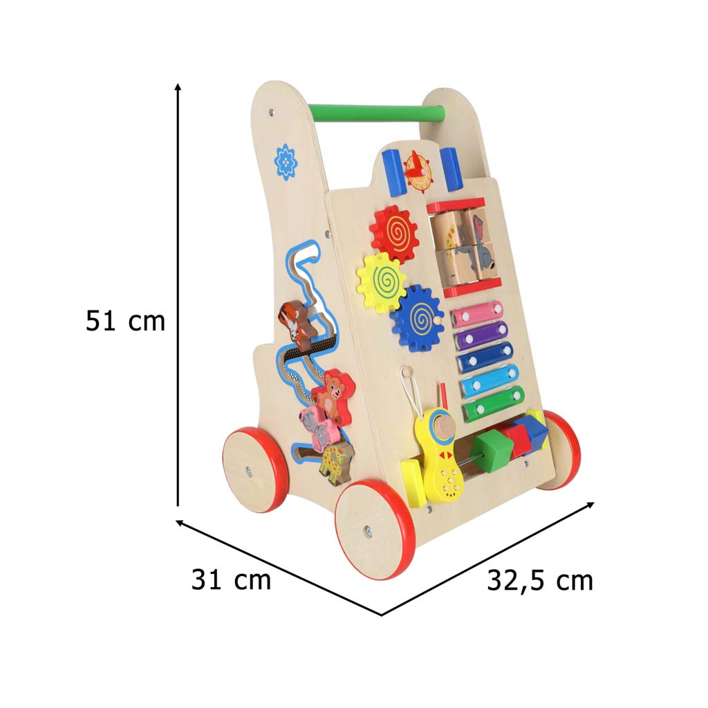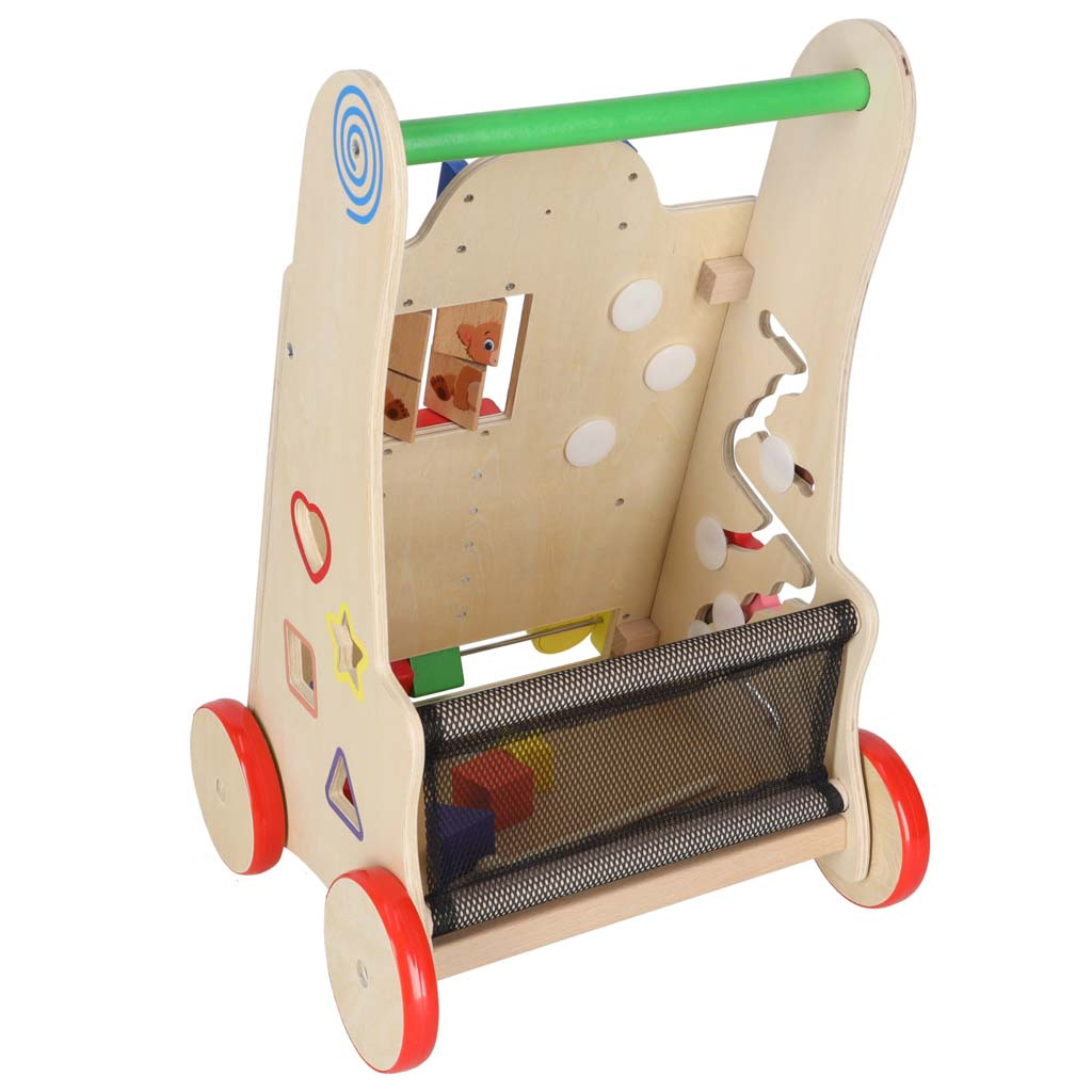 La o vârstă mai înaintată, va fi util și ca un cărucior pentru jucăriile preferate și primul abac.Mersul cu un premergător ajută copilul mic să-și mențină echilibrul în timp ce învață să meargă. Sprijină dezvoltarea abilităților manuale și dezvoltă motricitatea întregului corp. Premergătorul va încuraja copilul dumneavoastră să fie activ fizic.Mersul nostru este un sprijin stabil pentru un copil mic care învață să meargă. Copilului nu i se va reuși să o răstoarne. Roțile din lemn sunt protejate cu un strat de cauciuc antiderapant.Design estetic, culori vibrante, atenție la detalii - un însoțitor plăcut și sigur pentru copilul dumneavoastră.Această bicicletă fără pedale va fi pe placul părinților care caută accesorii ecologice pentru copilul lor. Jucăriile din lemn sunt o alegere excelentă!Nu este doar un cadru de mers! Dezvoltatorii s-au asigurat că jocul oferă distracție copiilor mici în multe feluri. Pe partea din față este amplasată o placă de manipulare plină de elemente care vor încânta copiii: