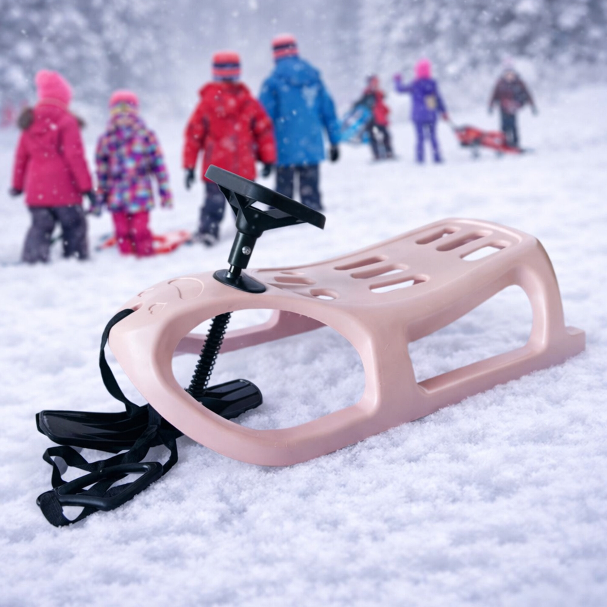 Săniile sunt fabricate din plastic de înaltă rezistență și sunt echipate cu tălpi de oțel, care asigură o alunecare perfectă pe zăpadă.Săniile se manevrează ușor datorită șinei de ghidare centrale care este controlabilă cu volanul.