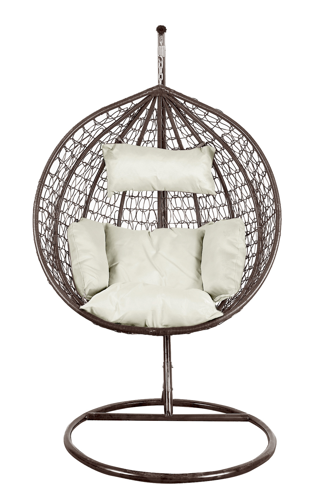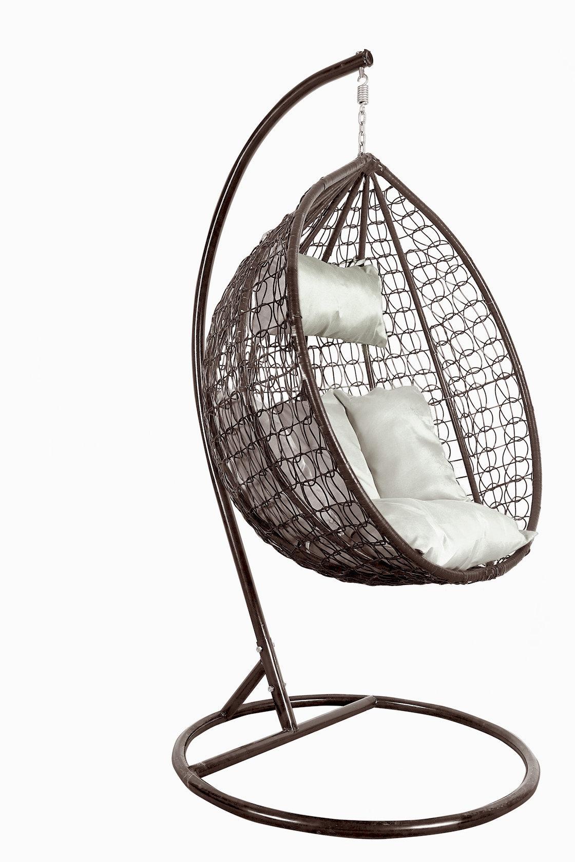 Scaun suspendat cu structură metalică stabilă și spațiu de ședere împletit decorativ din ratan artificial. Parte din scaunul suspendat sunt și pernele confortabile, care sunt rezistente la apă.