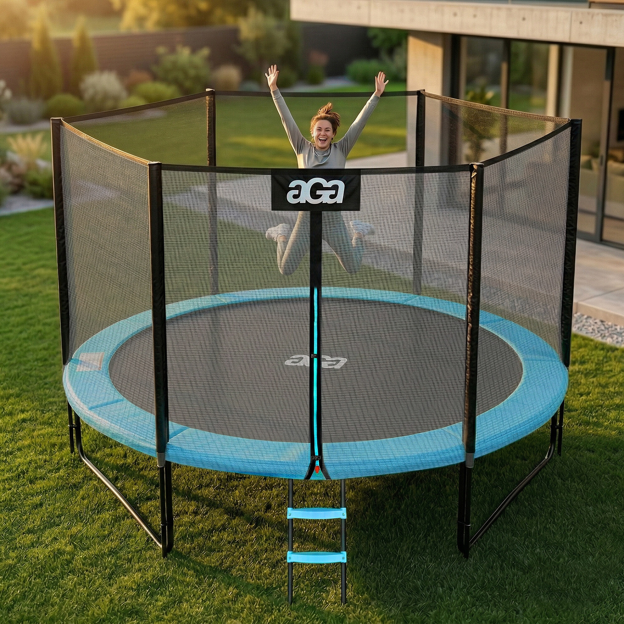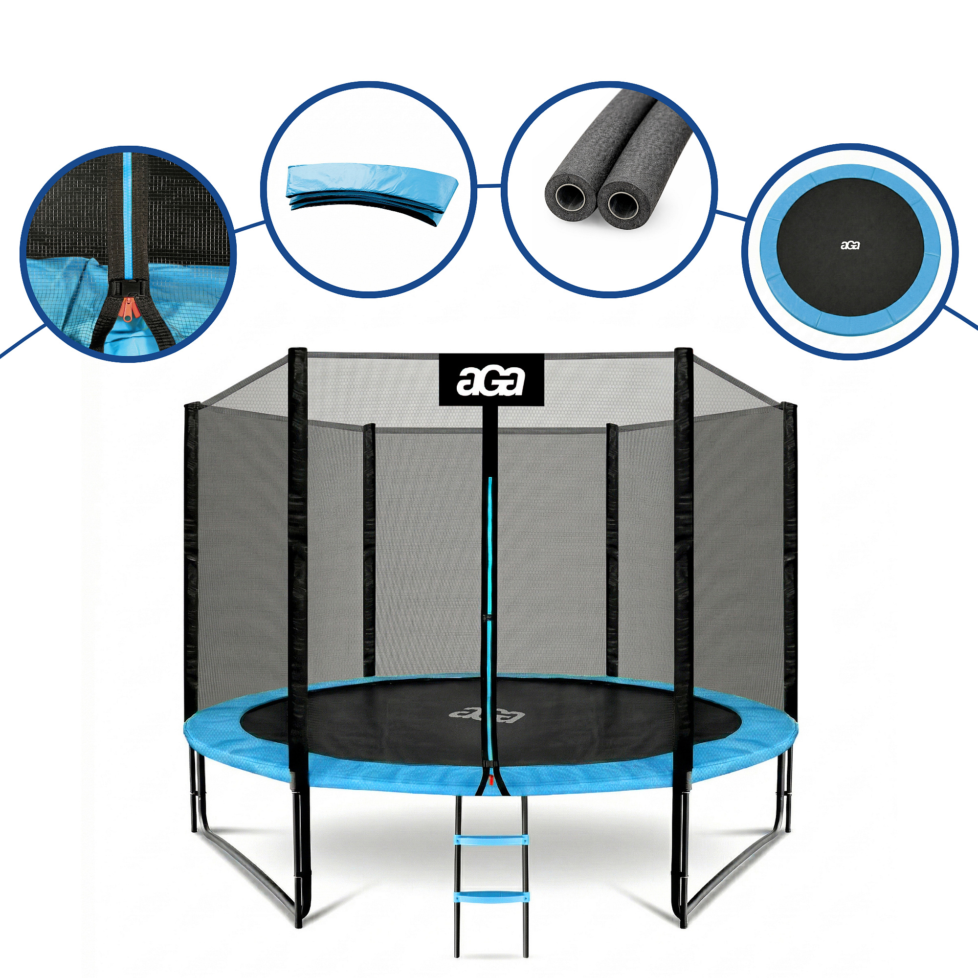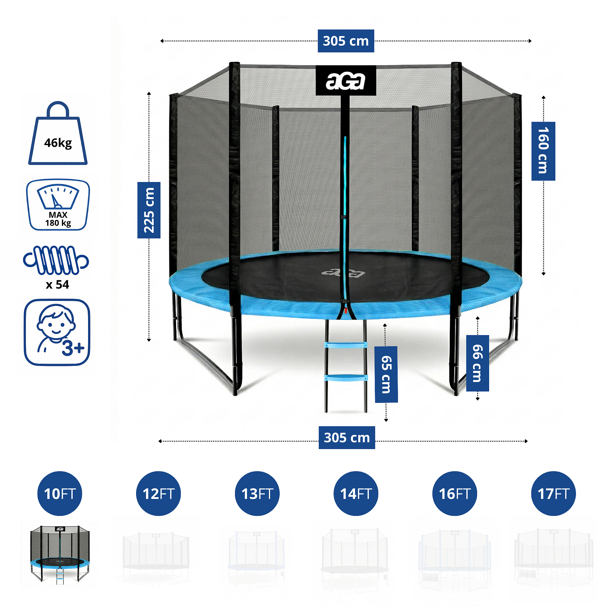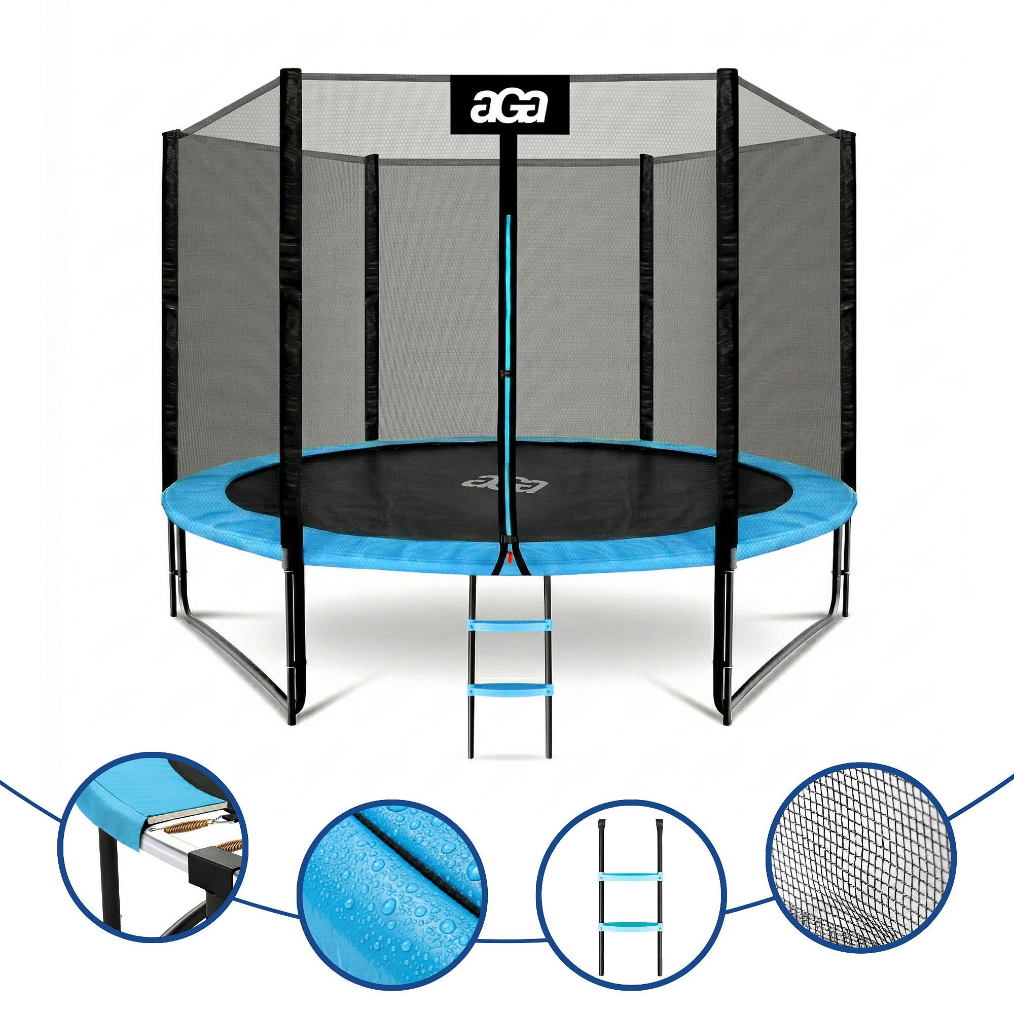 Specificații trambulină Aga SPORT PRO 305 cm Albastru deschis cu plasă de protecție și scară.