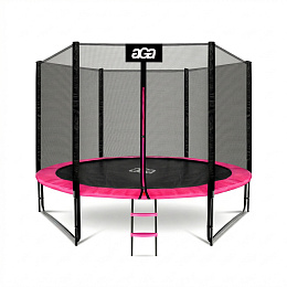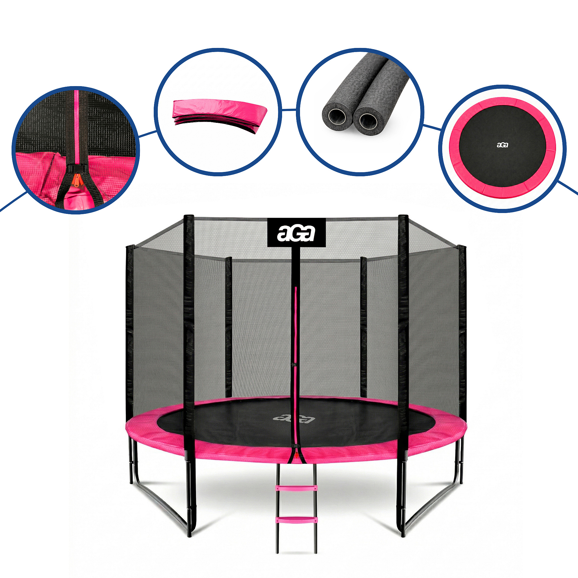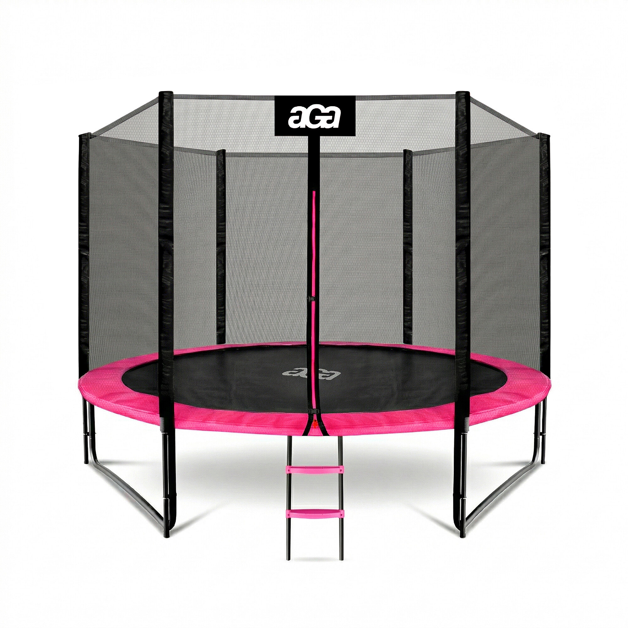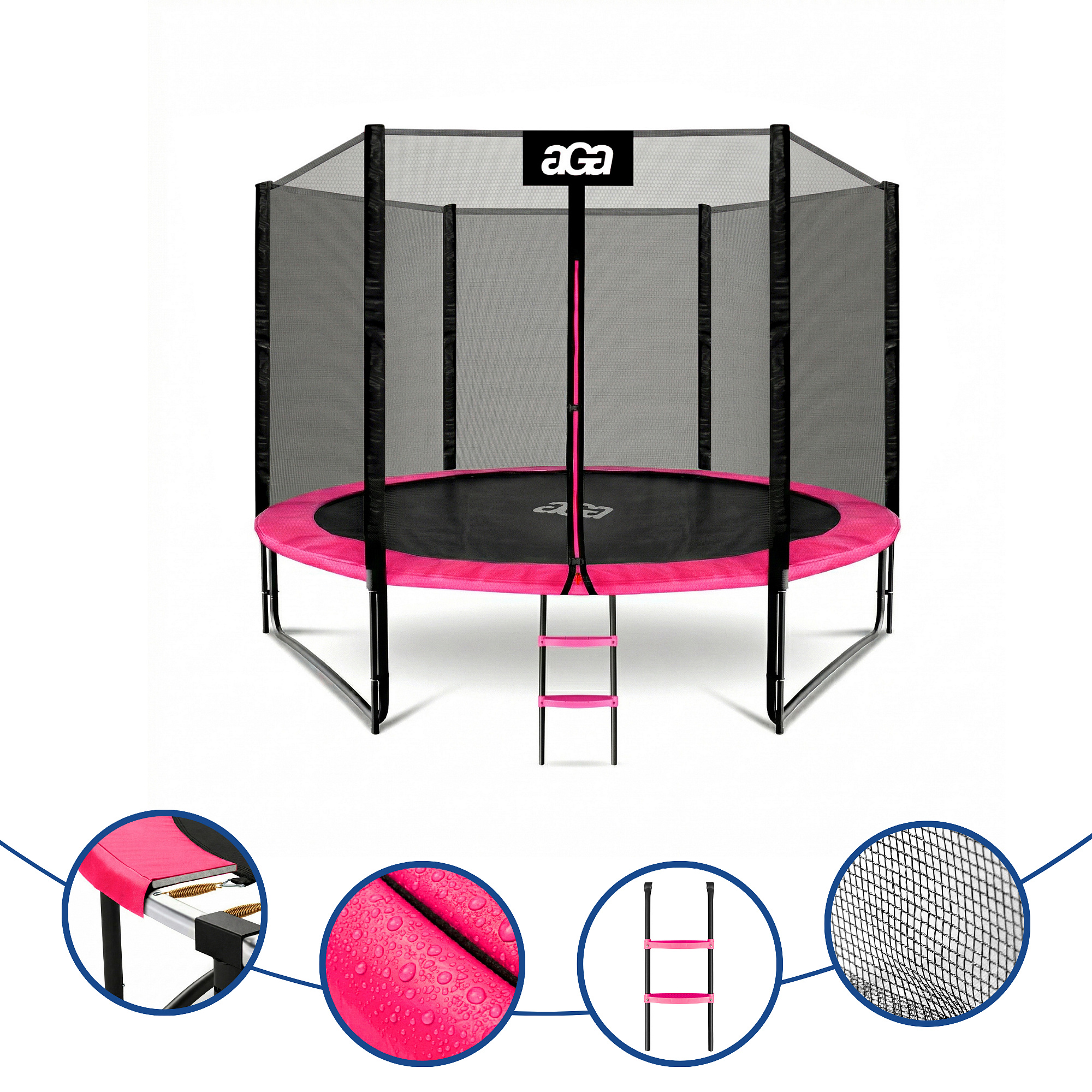 Specificații trambulină Aga SPORT PRO 305 cm Roz cu plasă de protecție și scară.