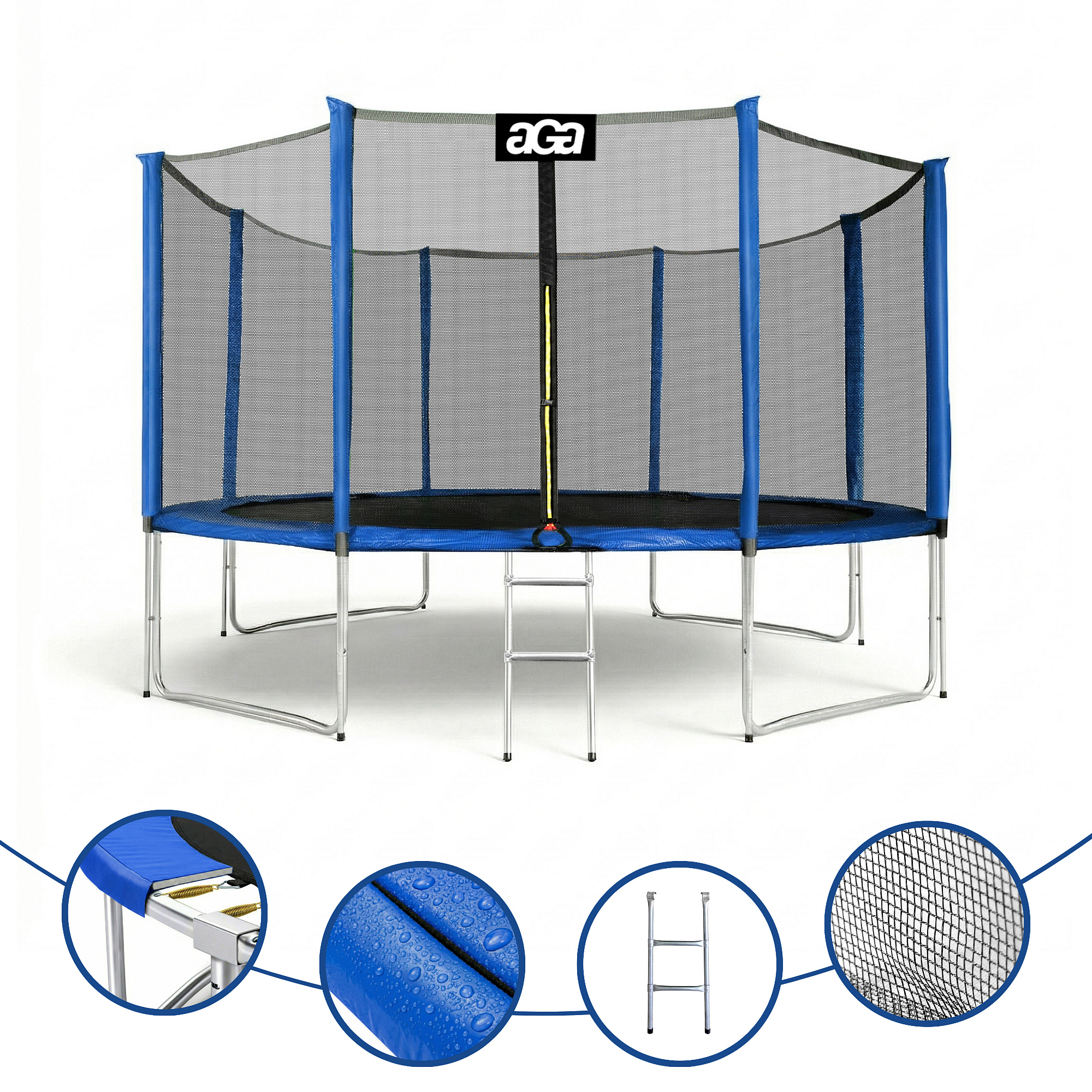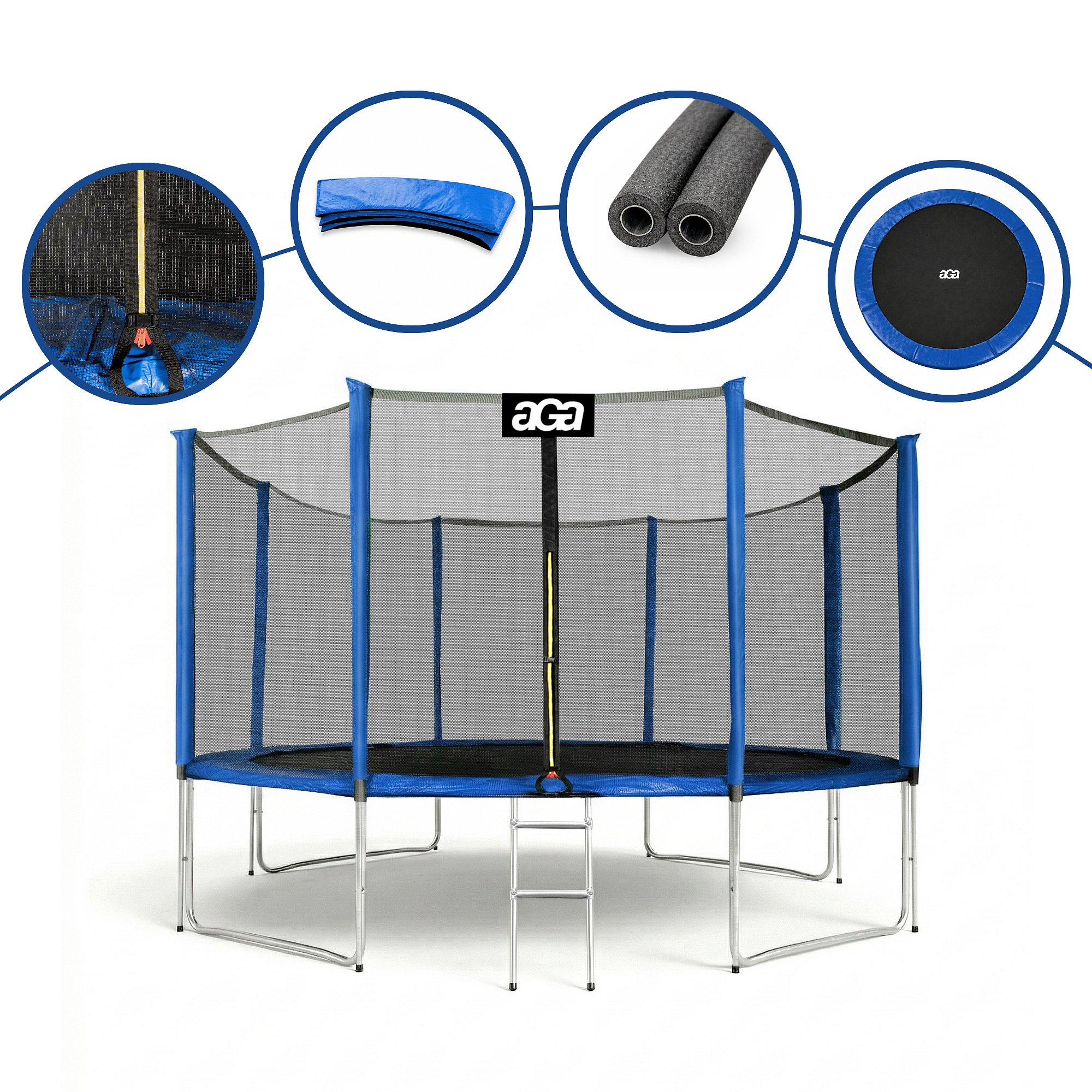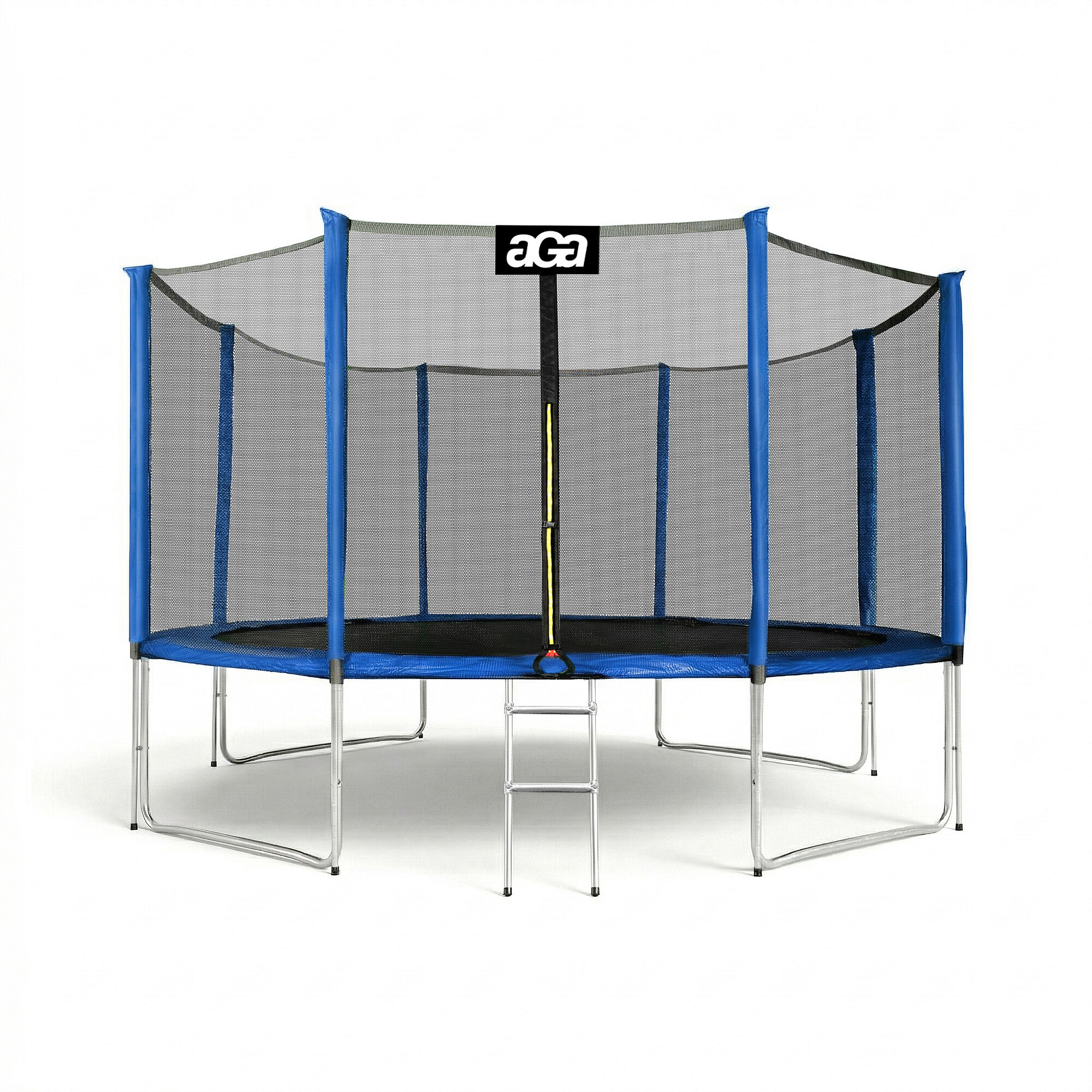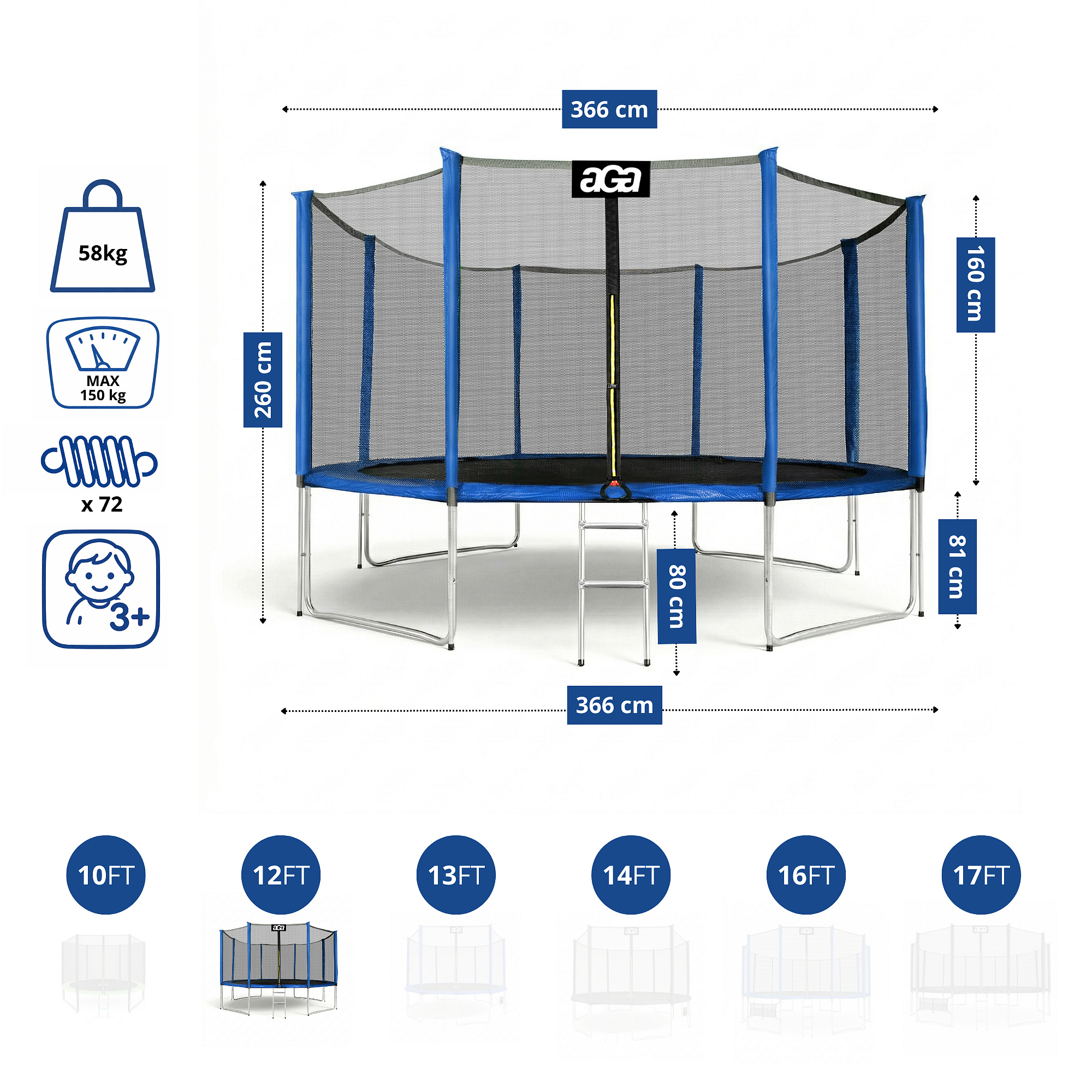 Specificații trambulină Aga SPORT PRO 366 cm Albastru cu plasă de protecție.