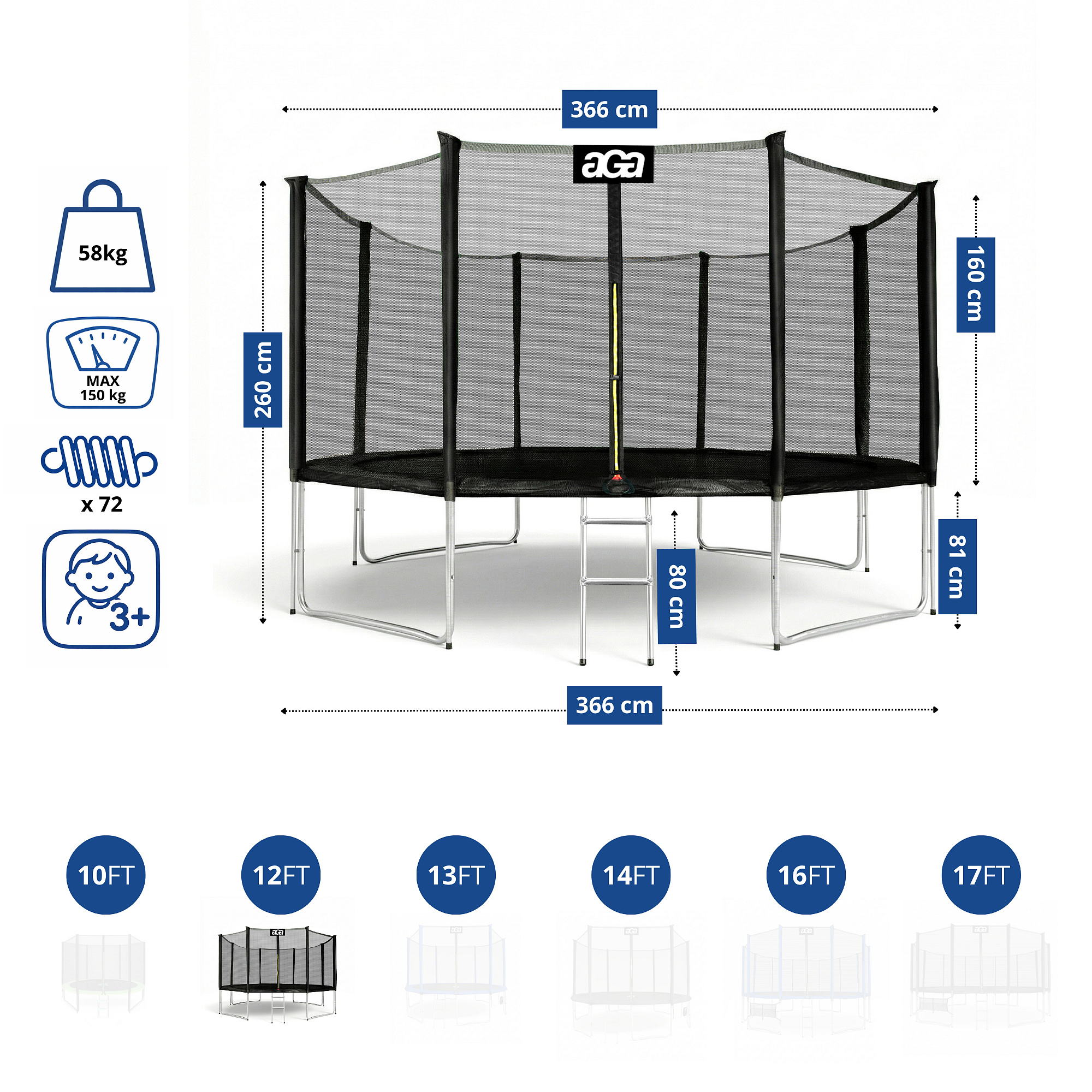 Specificații trambulină Aga SPORT PRO 366 cm cu plasă de protecție.