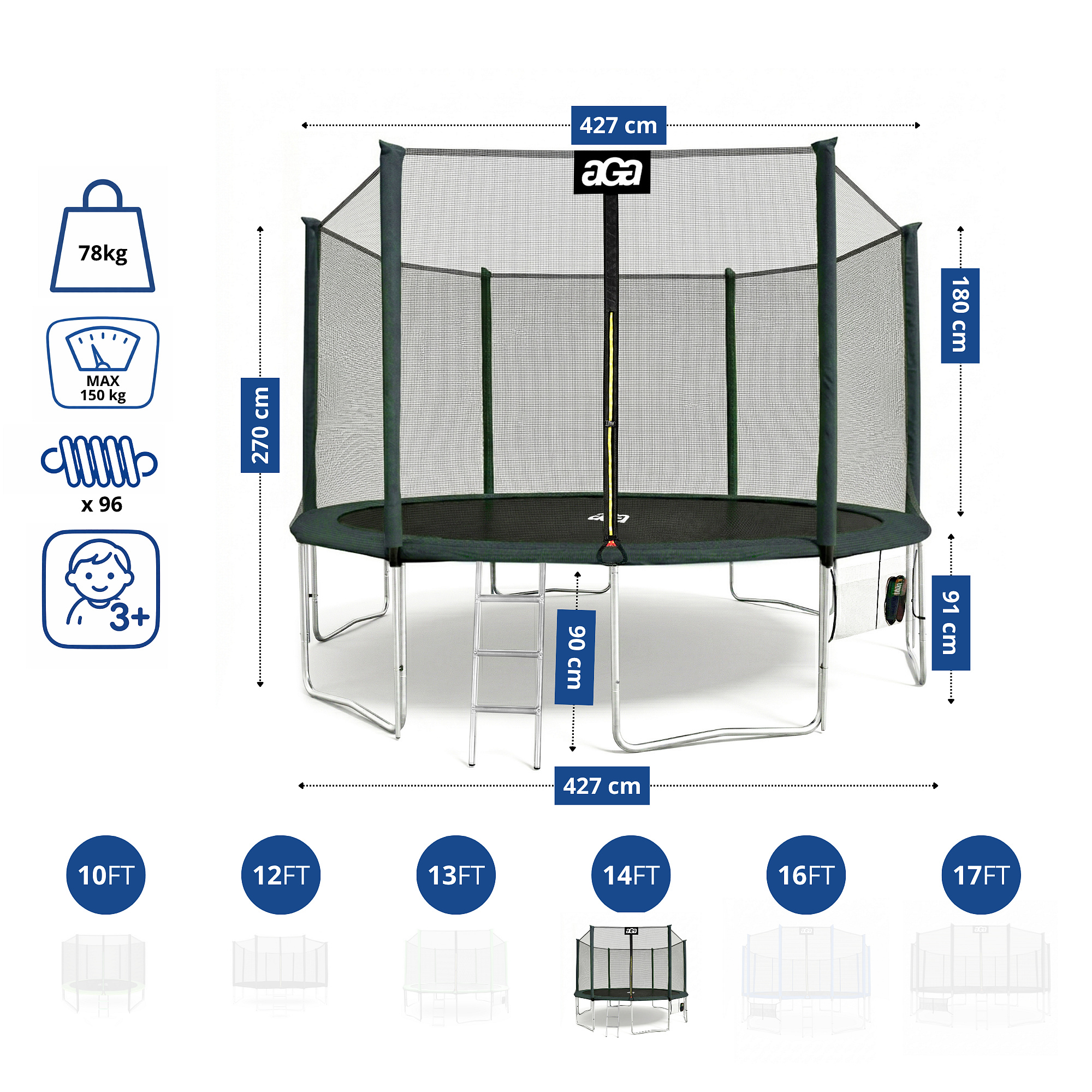 Specificații trambulină Aga SPORT PRO 430 cm Dark Green cu plasă de protecție.