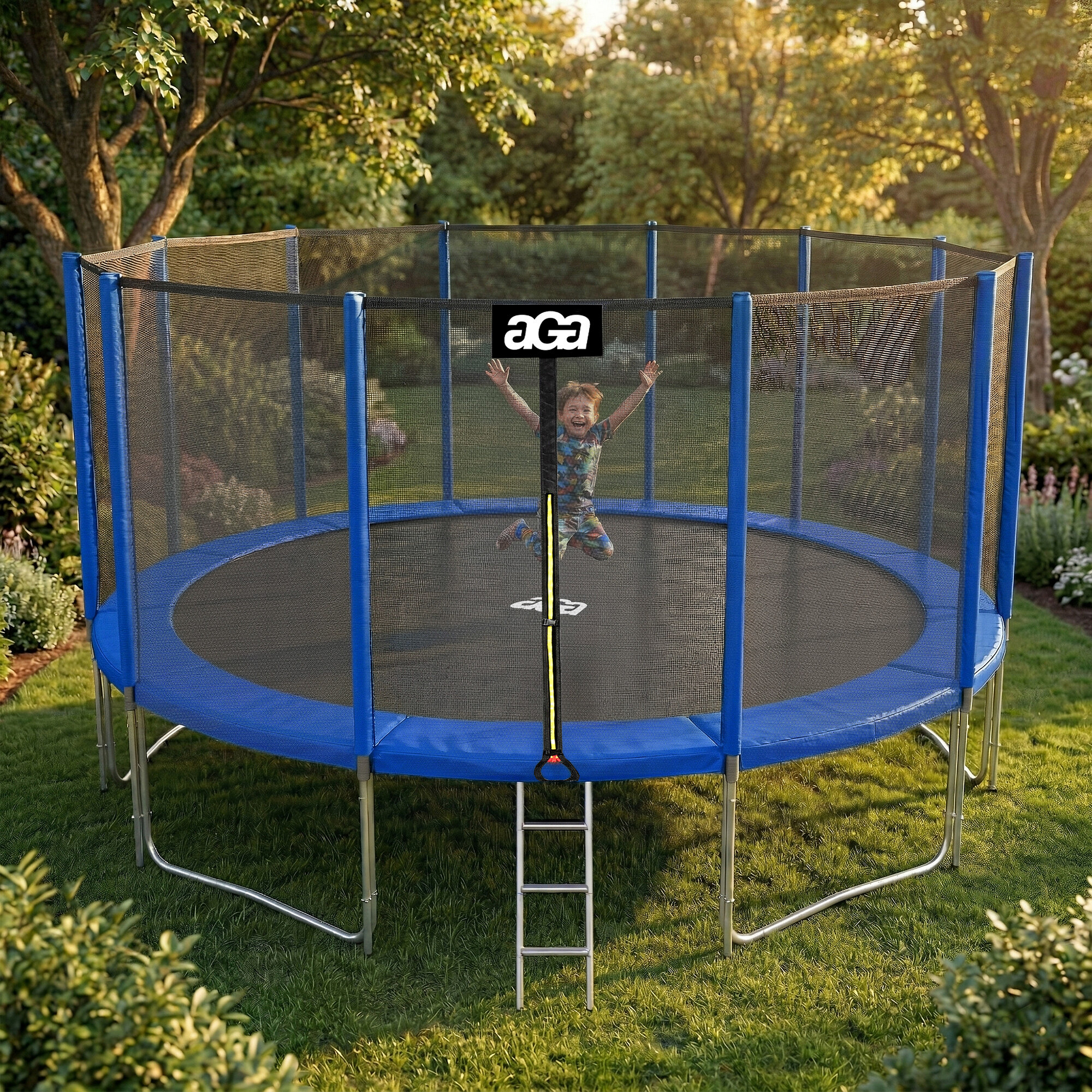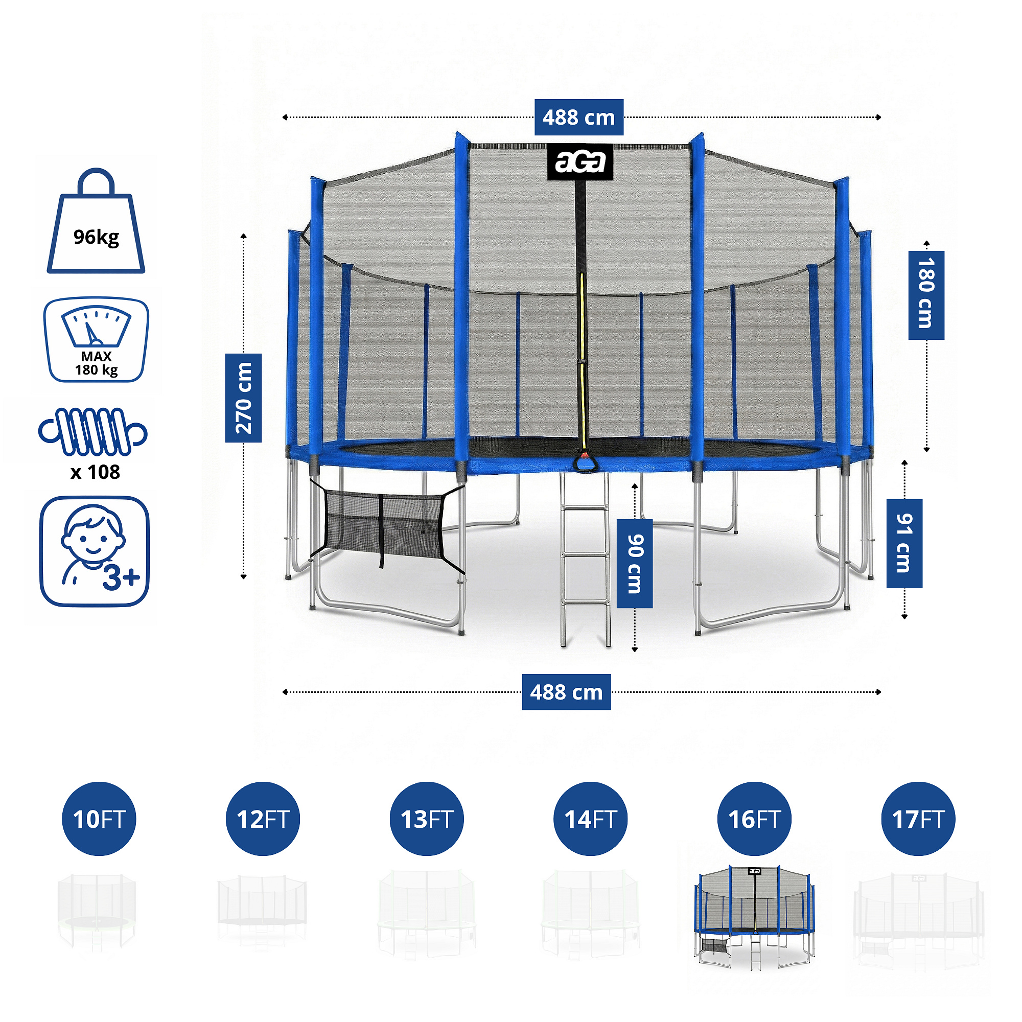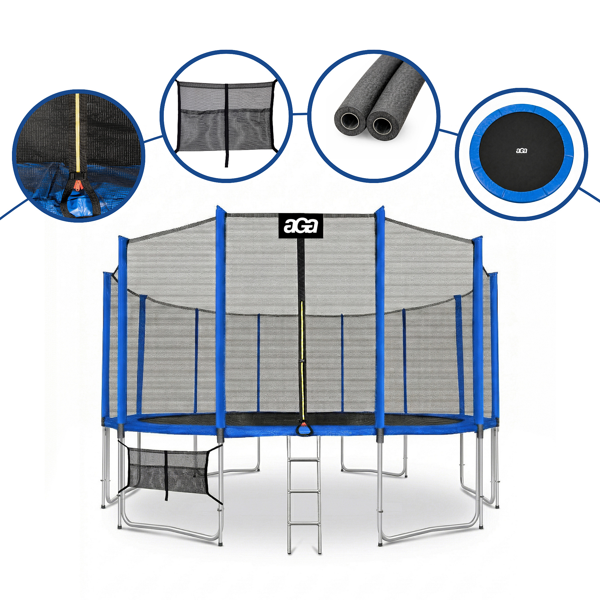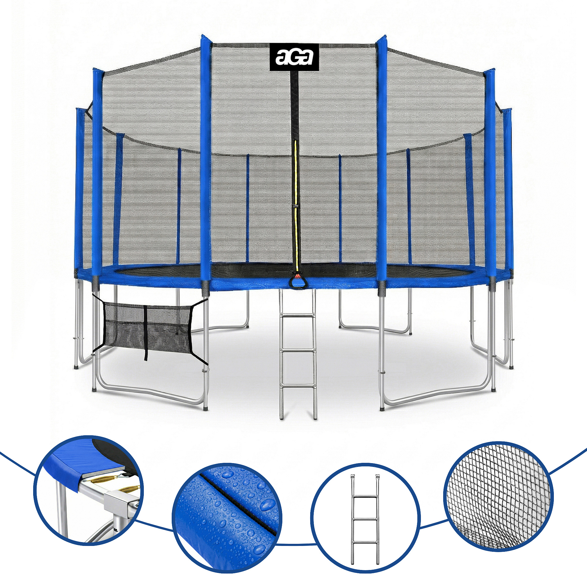 Specificații trambulină Aga SPORT PRO 488-500 cm Albastru cu plasă de protecție.