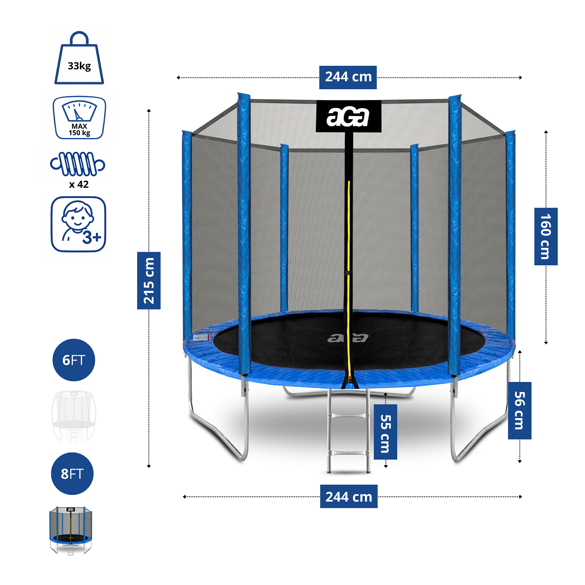 Specificații trambulină Aga SPORT TOP 250 cm (8 ft) cu plasă de protecție Albastră.