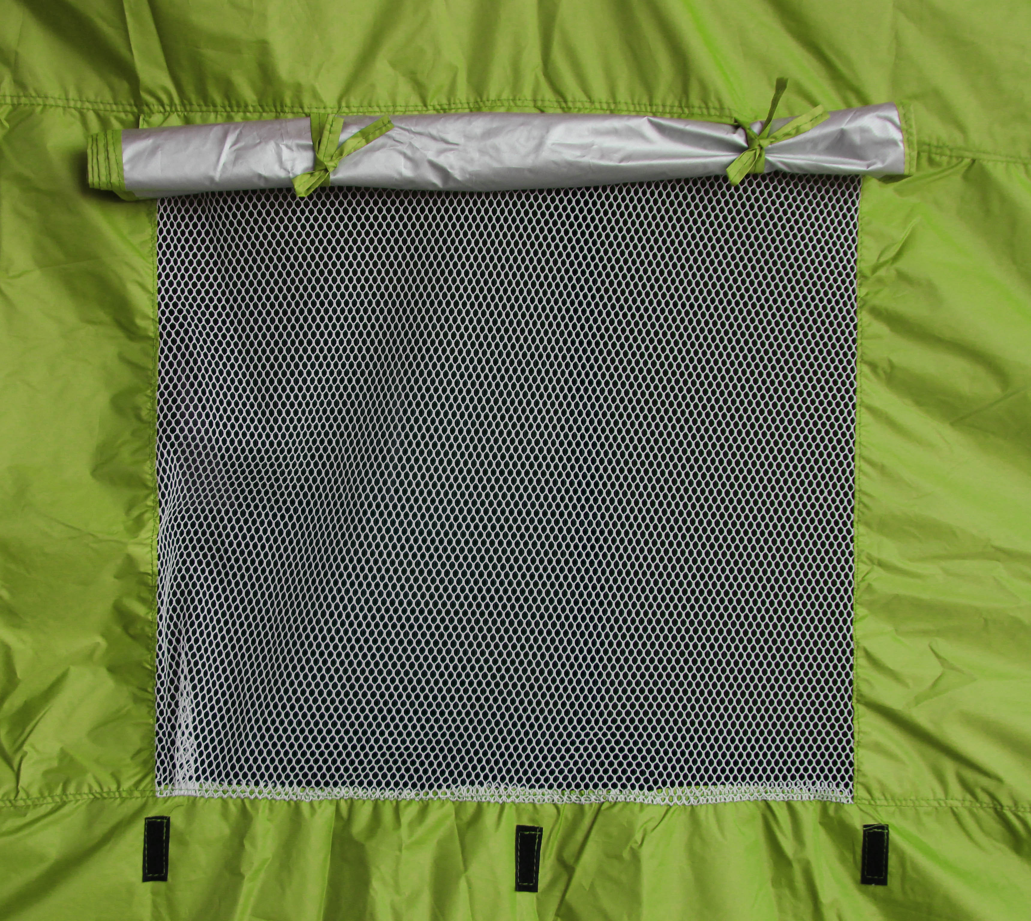 Cortul este echipat cu orificii de ventilație prevăzute cu jaluzele retractabile și plase împotriva insectelor.