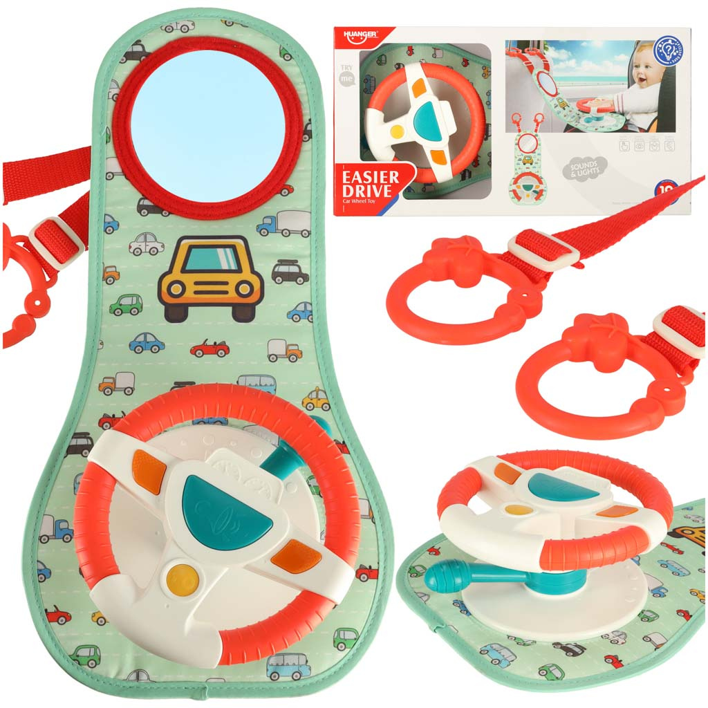 Un copil agitat sau plângând pe bancheta din spate este un mare stres pentru șoferul vehiculului. Avem pentru dumneavoastră o soluție care va face călătoria copilului dumneavoastră mai plăcută și va asigura o călătorie lină. Volanul interactiv este un tip de panou de manipulare care va ocupa cu succes mâinile mici pe toată durata călătoriei. Este compus dintr-un volan cu 4 butoane, un mâner senzorial și o oglindă de siguranță din plastic. Bucățile sunt așezate pe un suport solid acoperit cu un material plăcut cu motiv de mașinuțe.