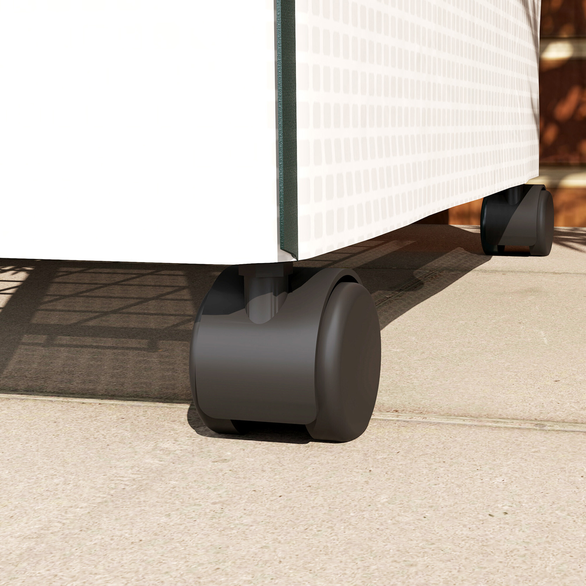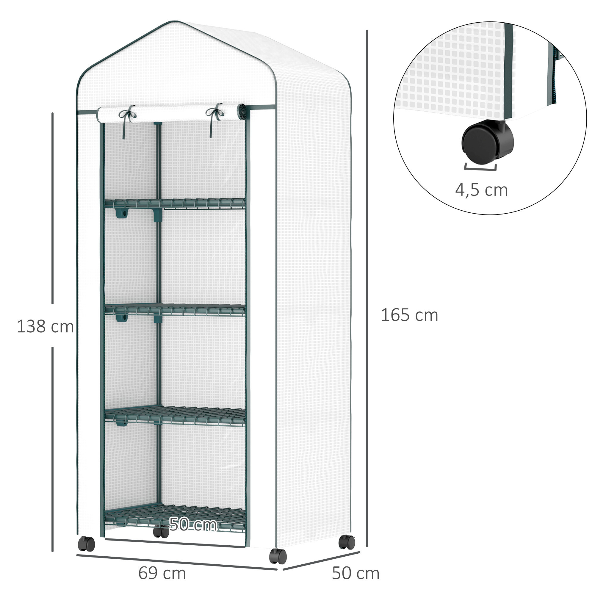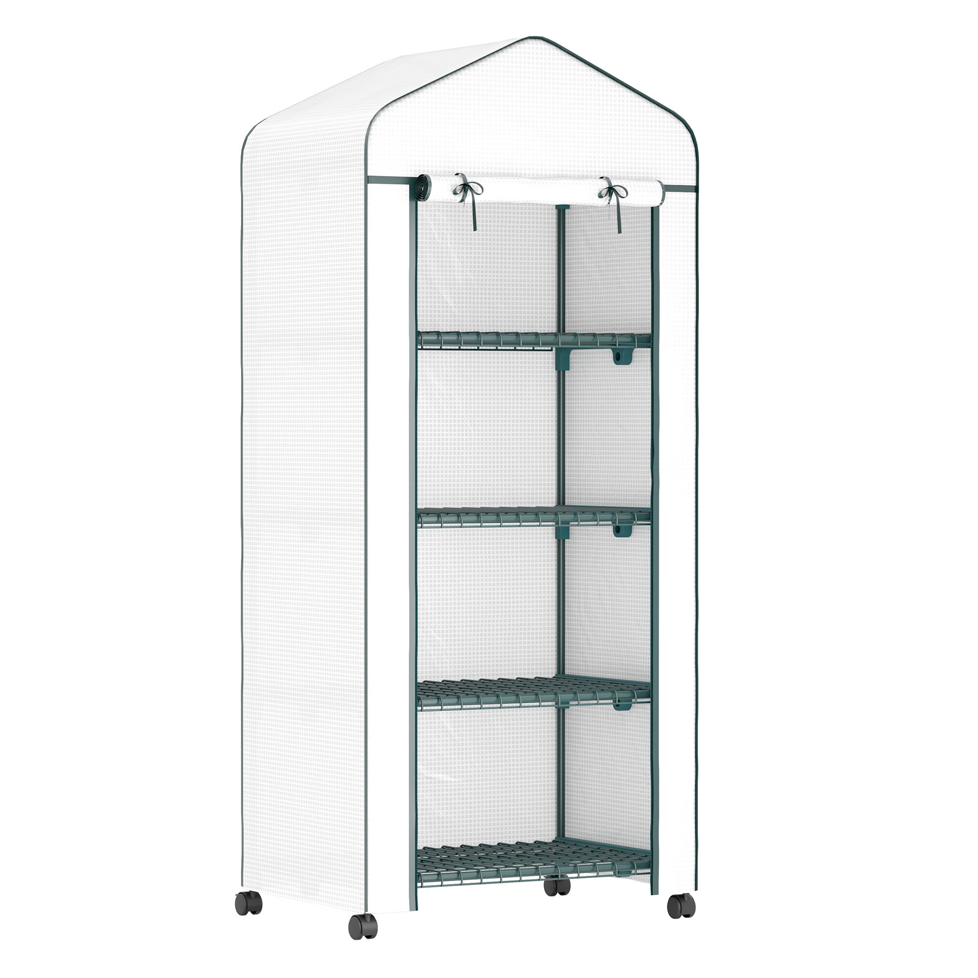 Fóliovník je vybaven čtyřmi policemi, má rolovací dveře a posuvné kolečka, takže ho můžete snadno přemístit dle potřeb.