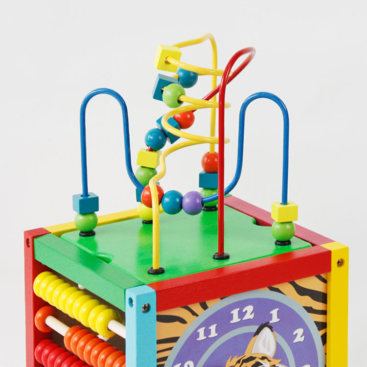Pe partea superioară a cubului este amplasat un labirint motric. Prin mutarea mărgelelor de pe o parte pe alta, copilul își exersează motricitatea fină și simțul în mâini.