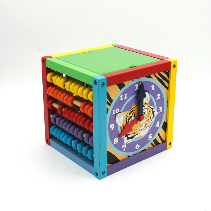 Cubul motric din lemn oferă distracție la joacă din patru părți. Cuburi rotative cu imagini, forme mobile pe traseul decupat din lateralul cubului, abac și ceasuri.