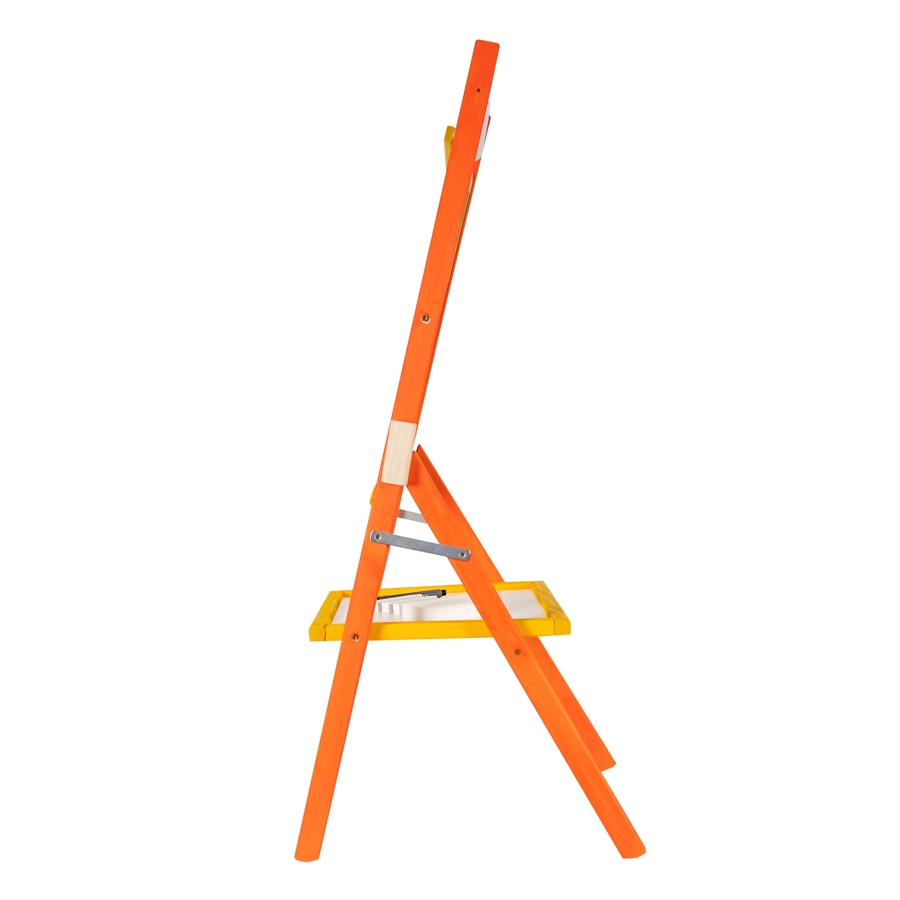 Pe partea neagră a tablei, copiii pot desena cu cretă clasică, iar pe cealaltă parte, albă, cu markere colorate.