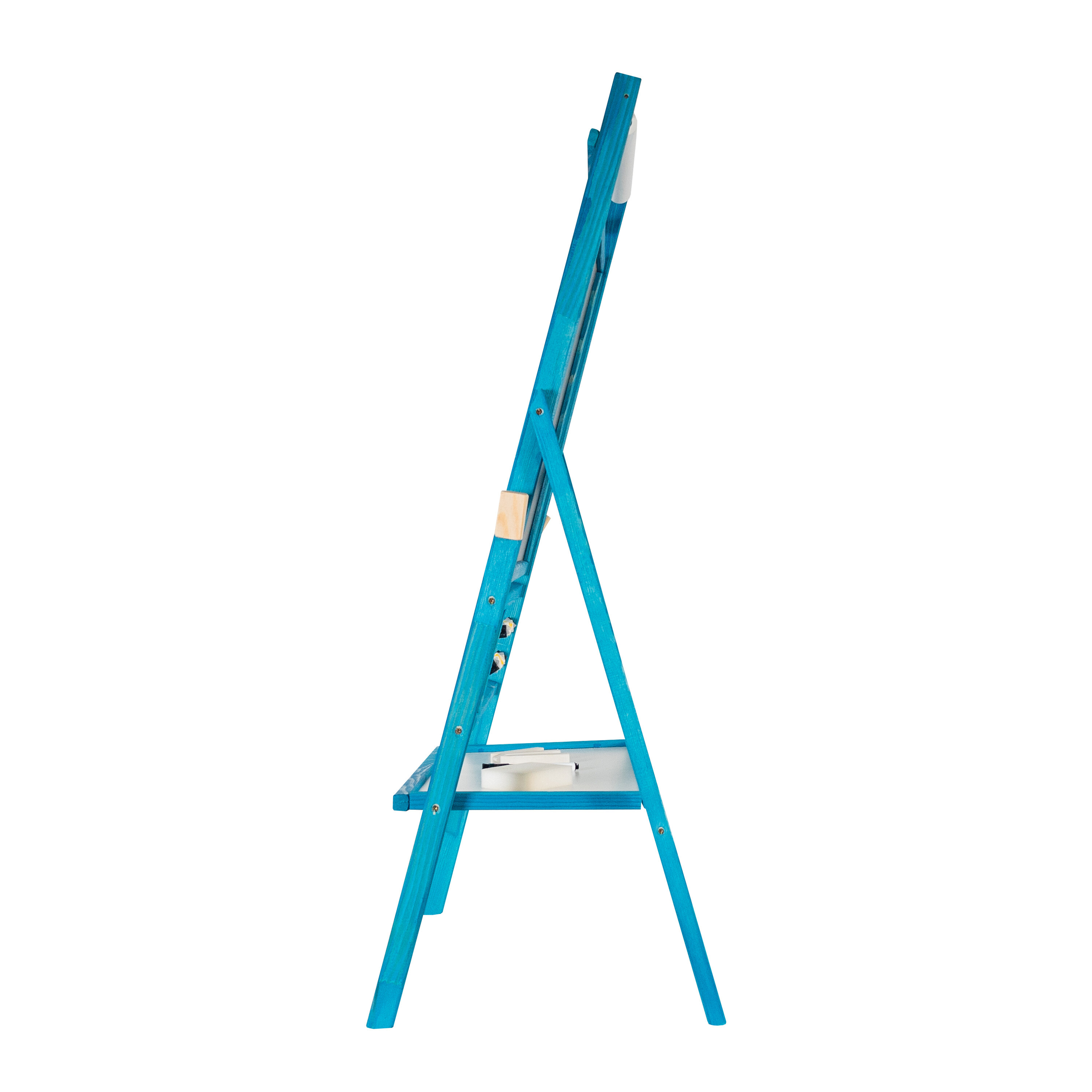 Pe tabla neagră, copiii pot desena cu cretă clasică, iar pe cealaltă, albă, cu markere colorate sau pe hârtie cu creioane colorate.