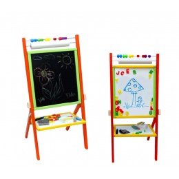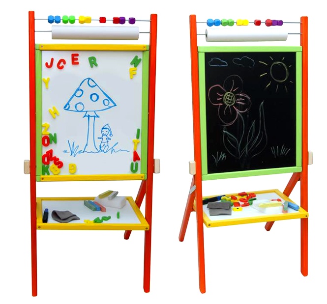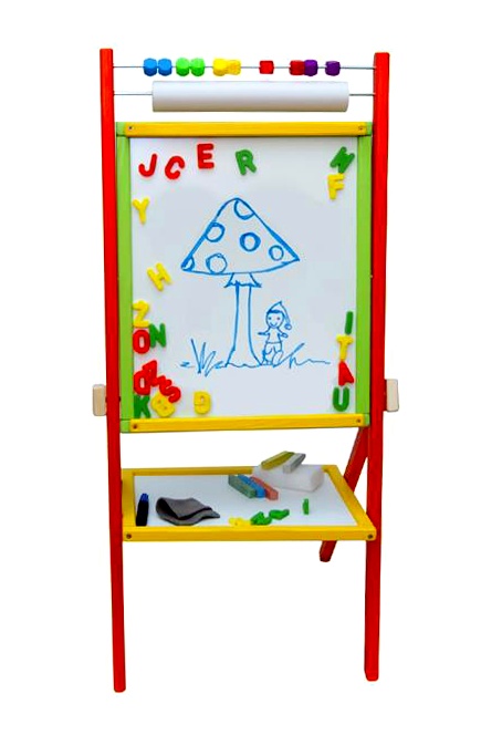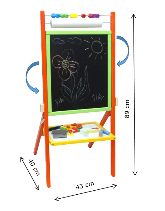 - Setul include - tablă rotativă, 5 crete colorate, 1 marker, 1 rolă de hârtie (15 m), litere magnetice, abac, 1 burete, 1 cârpă
