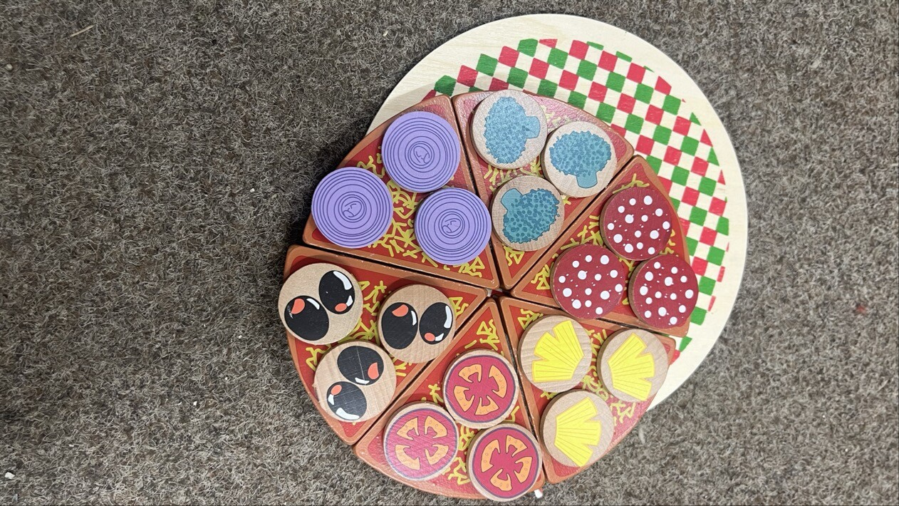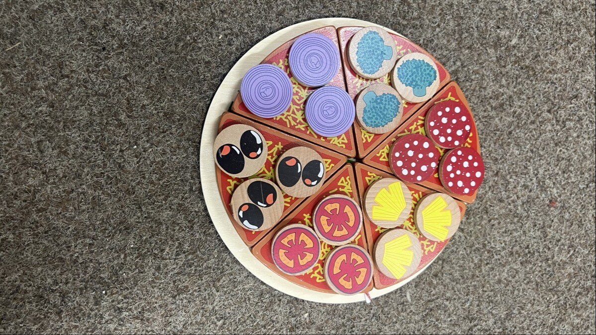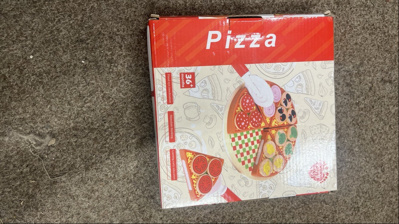 - Setul conține un cuțit rotund din lemn, o spatulă pentru ridicarea bucăților de pizza, o placă de lemn și o pizza cu ingrediente