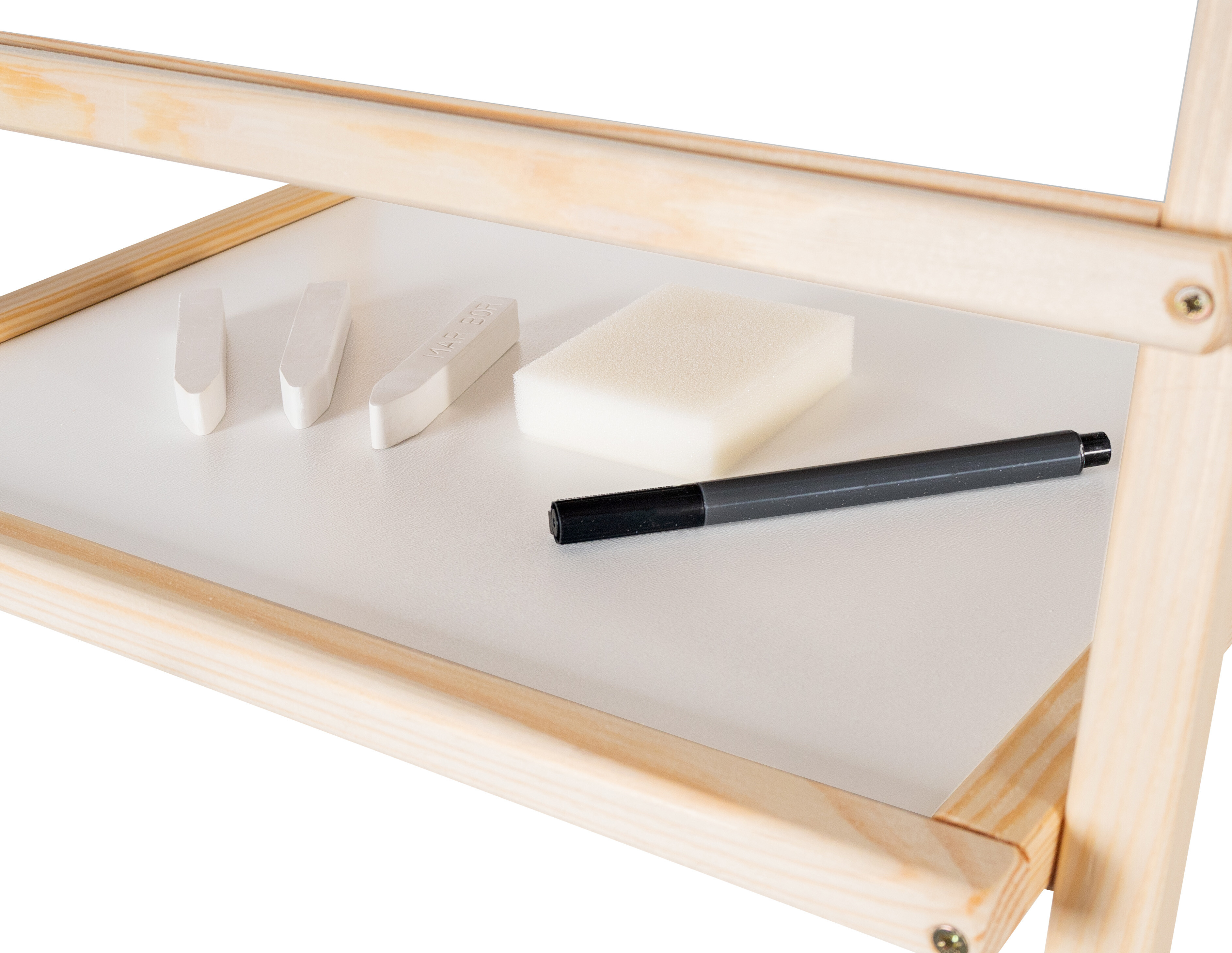 Pe tabla neagră, copiii pot desena cu cretă clasică, iar pe cealaltă, albă, cu markere colorate sau pe hârtie cu creioane colorate.