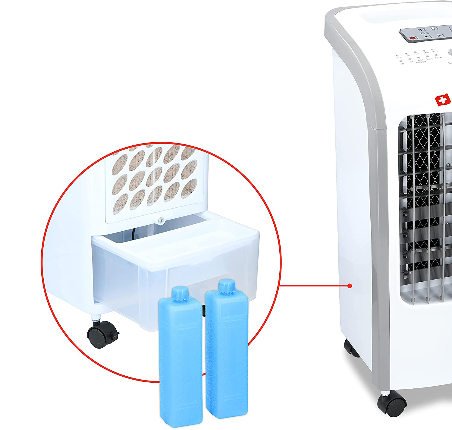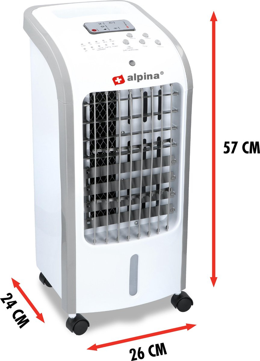 Aerul din răcitor trece prin apă rece sau gheață și astfel oferă mult mai multă răcire decât un ventilator obișnuit. Pachetul include două pachete de răcire pe care le puteți folosi alternativ. Puteți urmări nivelul apei pe partea din față a rezervorului.