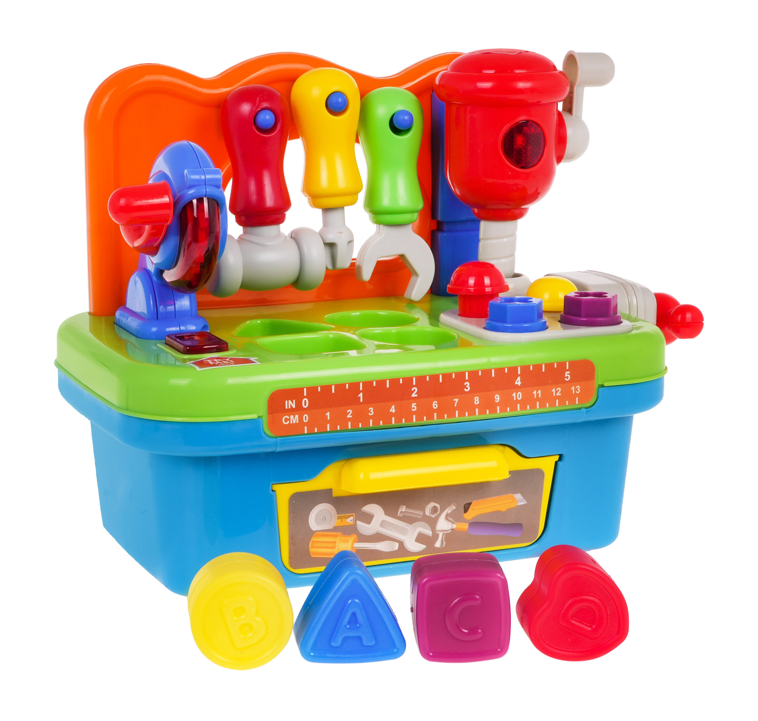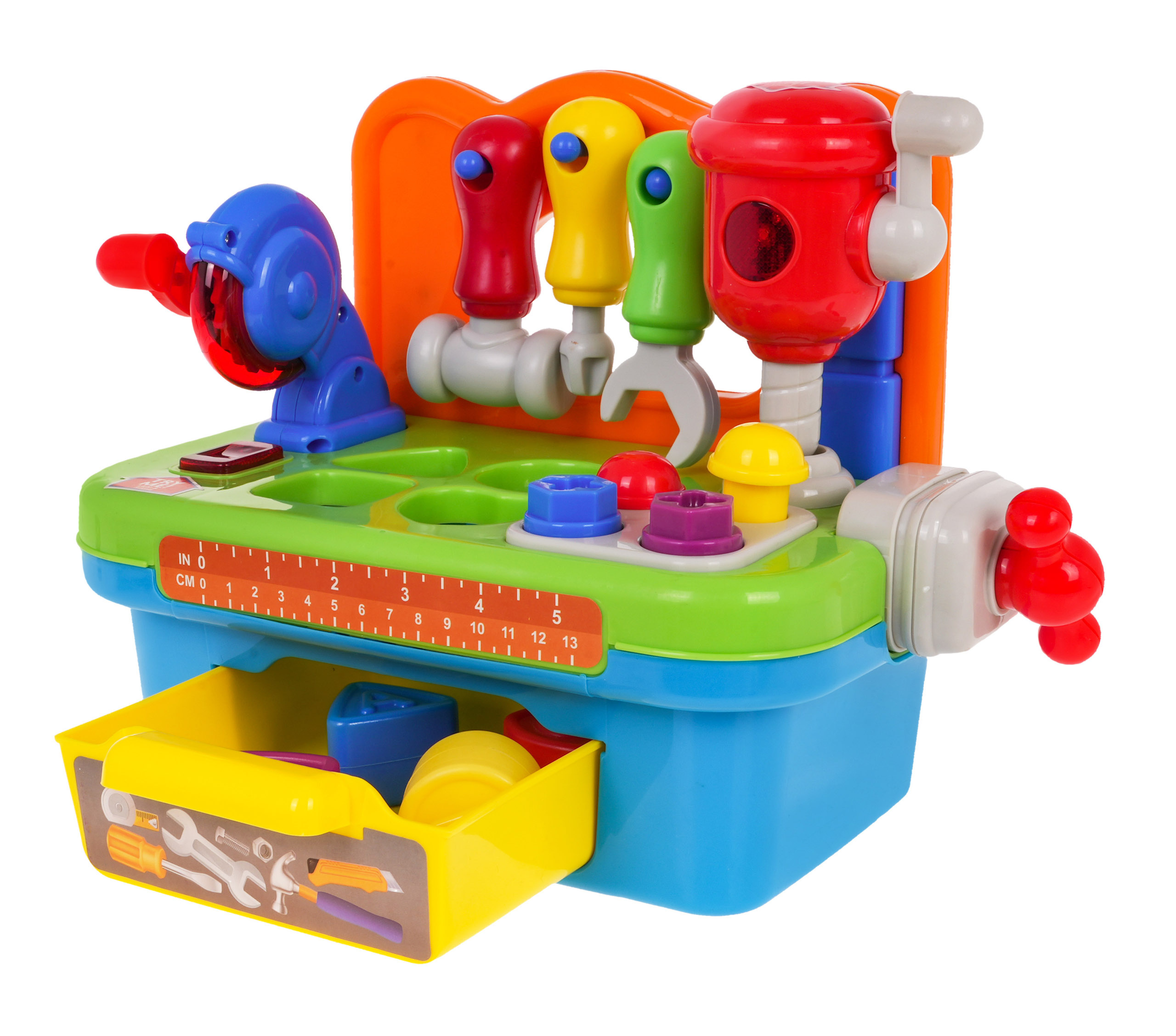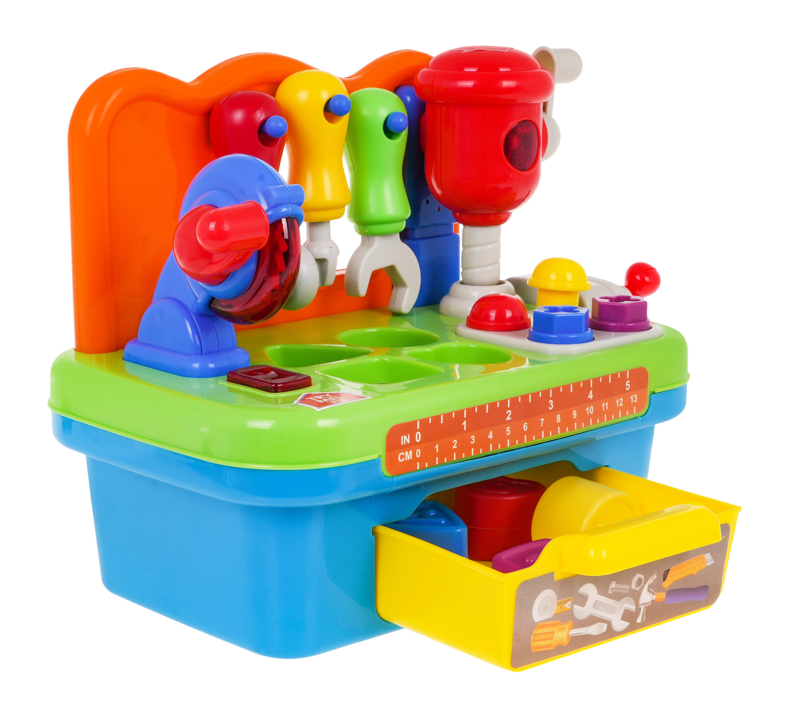 Jucăria interactivă multifuncțională cu funcție sonoră și luminoasă este potrivită pentru copiii de la 24 de luni. Atelierul pentru meșteri este echipat cu o serie de funcții. Este disponibil un ferăstrău circular rotativ și un ciocan percutor. Fiecare unealtă este echipată cu un mâner practic, cu care se pornește. Pe placa mesei de lucru este fixată o menghină, care permite copilului nostru mic să învețe reflexele de înșurubare și deșurubare, însoțite de sunete zornăitoare. Atelierul va include cuie pentru bătut și șuruburi pentru înșurubat. Echipamentul suplimentar include unelte: o șurubelniță, o cheie și un ciocan, toate având dimensiuni perfect adaptate mâinilor mici ale copiilor. Atelierul este, de asemenea, un loc excelent pentru exersarea recunoașterii formelor și asocierii. Blatul biroului este echipat cu un sortator, care este excelent pentru dezvoltarea abilităților copiilor. Toate piesele care se potrivesc în orificiile corespunzătoare se găsesc în sertarul practic din partea de jos a jucăriei. Atelierul este alimentat de 3 baterii AG13, care sunt incluse în livrare.