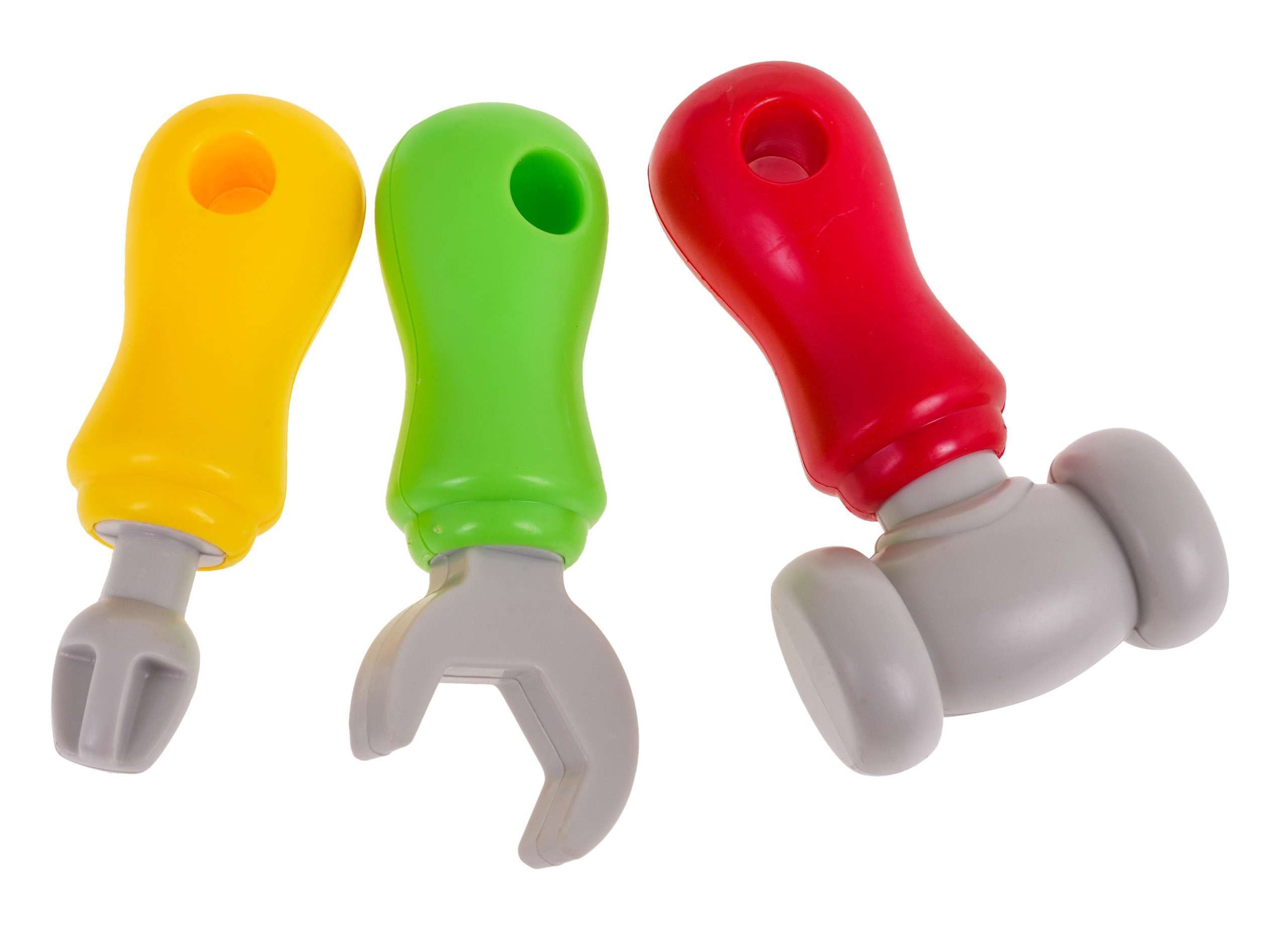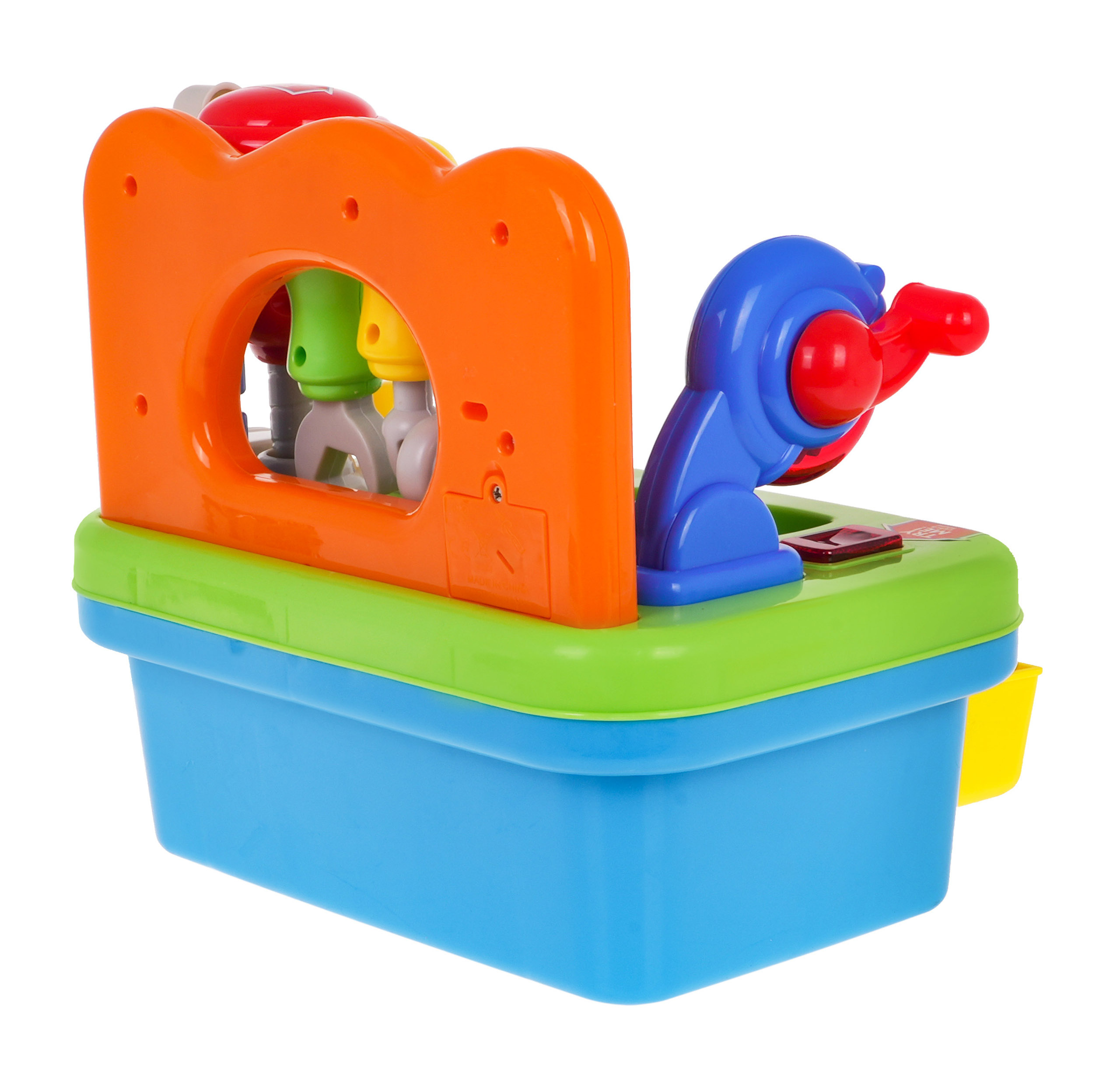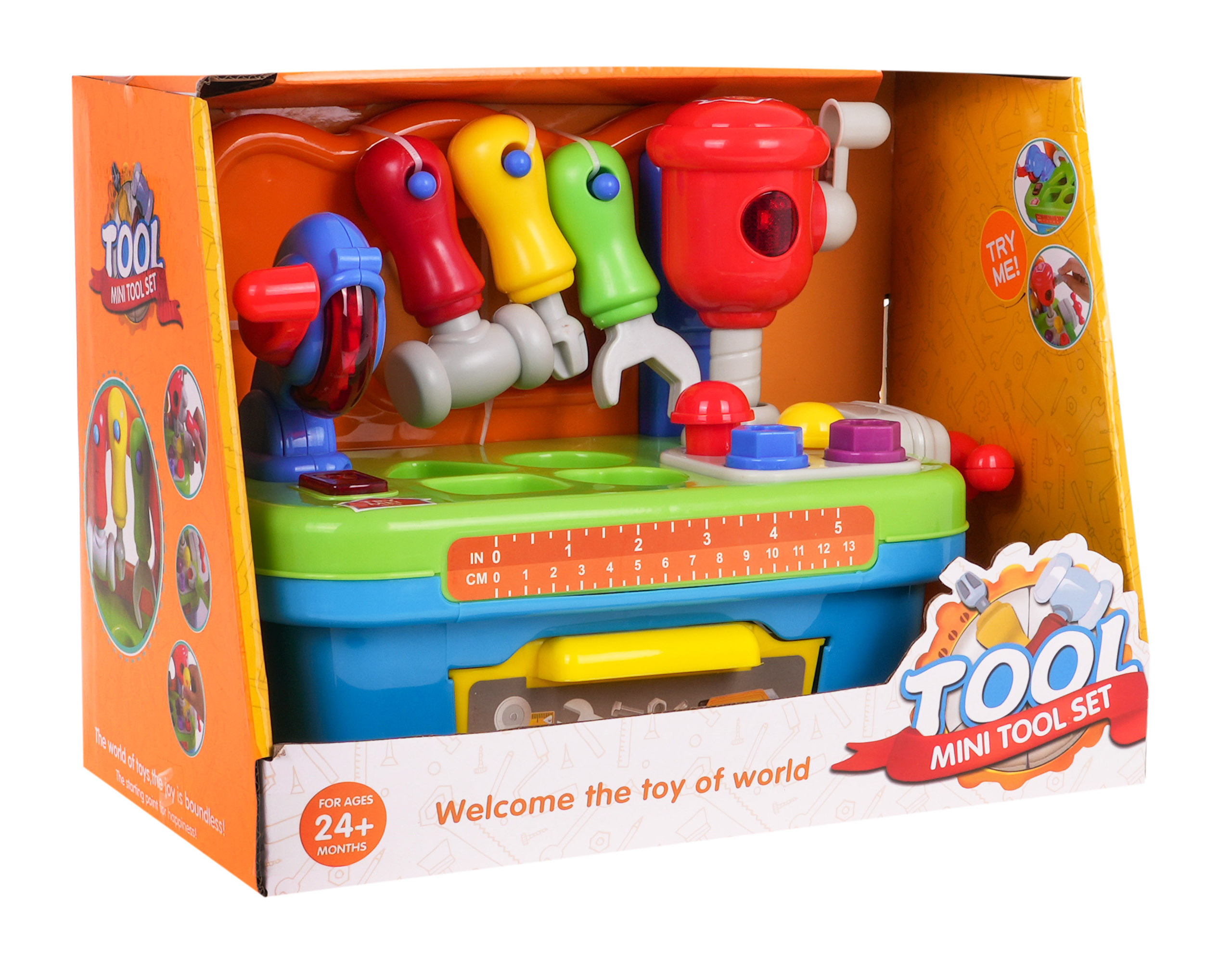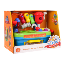 Jucăria interactivă multifuncțională cu funcție sonoră și luminoasă este potrivită pentru copiii de la 24 de luni. Atelierul pentru meșteri este echipat cu o serie de funcții. Este disponibil un ferăstrău circular rotativ și un ciocan percutor. Fiecare unealtă este echipată cu un mâner practic, cu care se pornește. Pe placa mesei de lucru este fixată o menghină, care permite copilului nostru mic să învețe reflexele de înșurubare și deșurubare, însoțite de sunete zornăitoare. Atelierul va include cuie pentru bătut și șuruburi pentru înșurubat. Echipamentul suplimentar include unelte: o șurubelniță, o cheie și un ciocan, toate având dimensiuni perfect adaptate mâinilor mici ale copiilor. Atelierul este, de asemenea, un loc excelent pentru exersarea recunoașterii formelor și asocierii. Blatul biroului este echipat cu un sortator, care este excelent pentru dezvoltarea abilităților copiilor. Toate piesele care se potrivesc în orificiile corespunzătoare se găsesc în sertarul practic din partea de jos a jucăriei. Atelierul este alimentat de 3 baterii AG13, care sunt incluse în livrare.